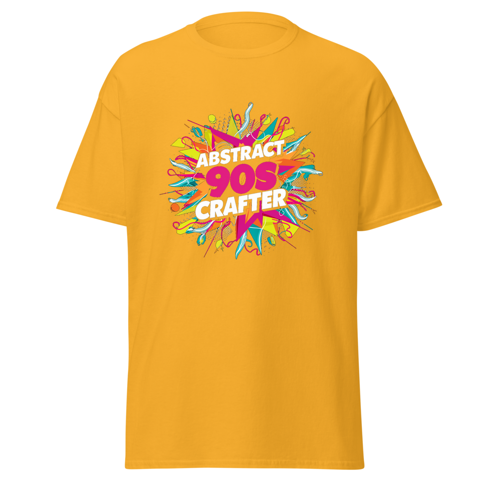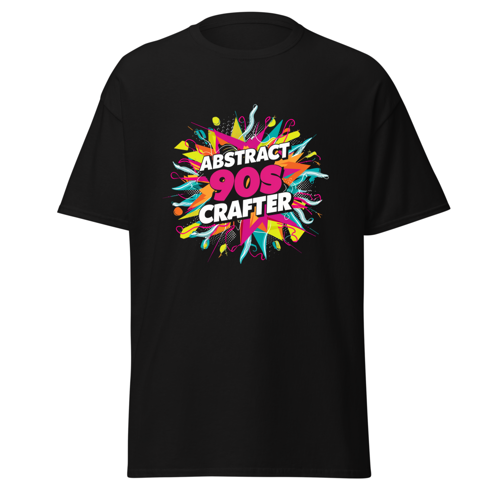 Vibrant geometric shapes and playful squiggles frame an eye-catching design that blends retro 90s style with the love of crafting. Perfect for DIY enthusiasts who appreciate a nostalgic touch.This t-shirt is everything you’ve dreamed of and more. It feels soft and lightweight, with the right amount of stretch. It’s comfortable and flattering for all. 100% combed and ring-spun cotton (Heather colors contain polyester) Fabric weight: 4.2 oz./yd.² (142 g/m²) Pre-shrunk fabric Side-seamed construction Shoulder-to-shoulder taping