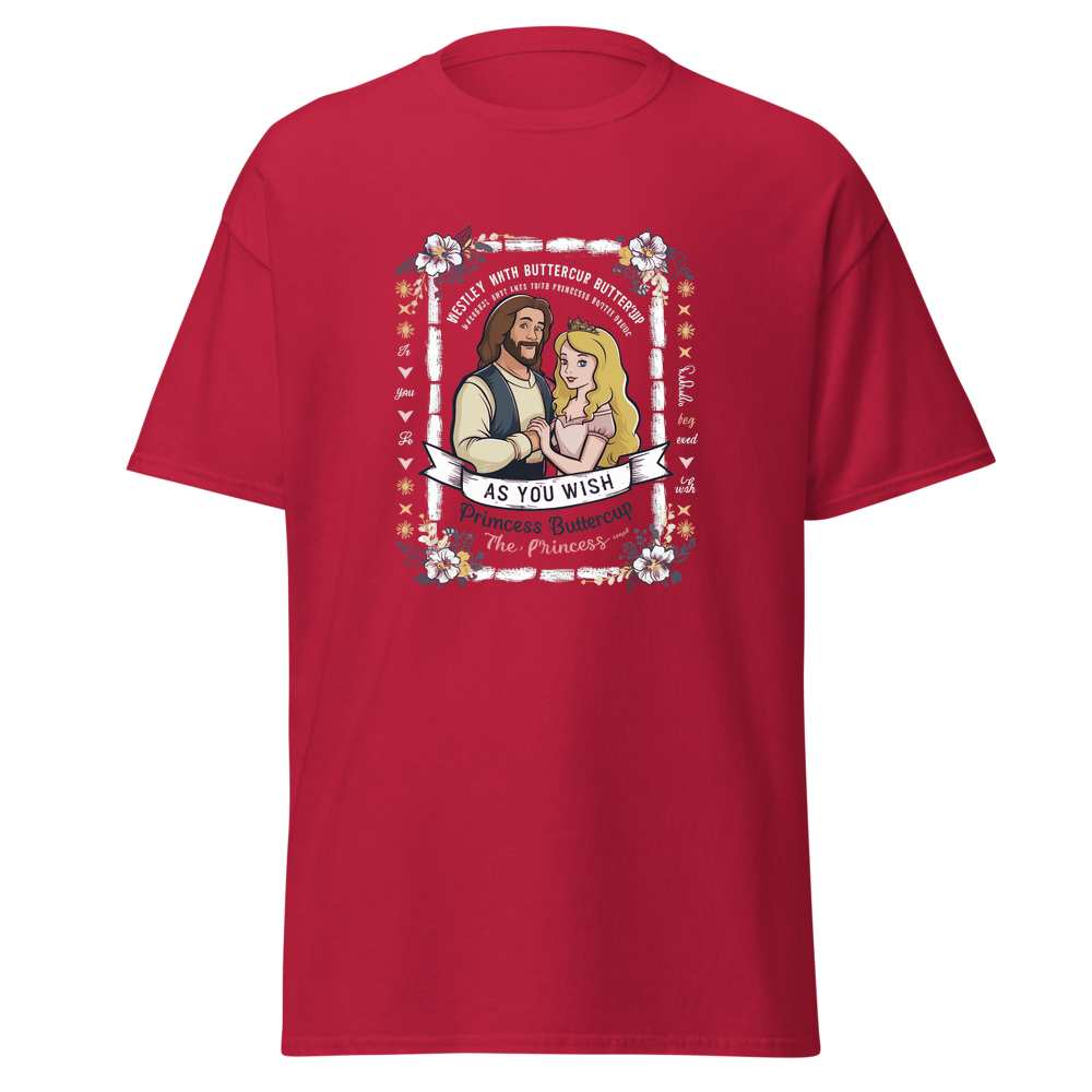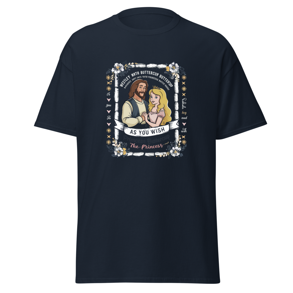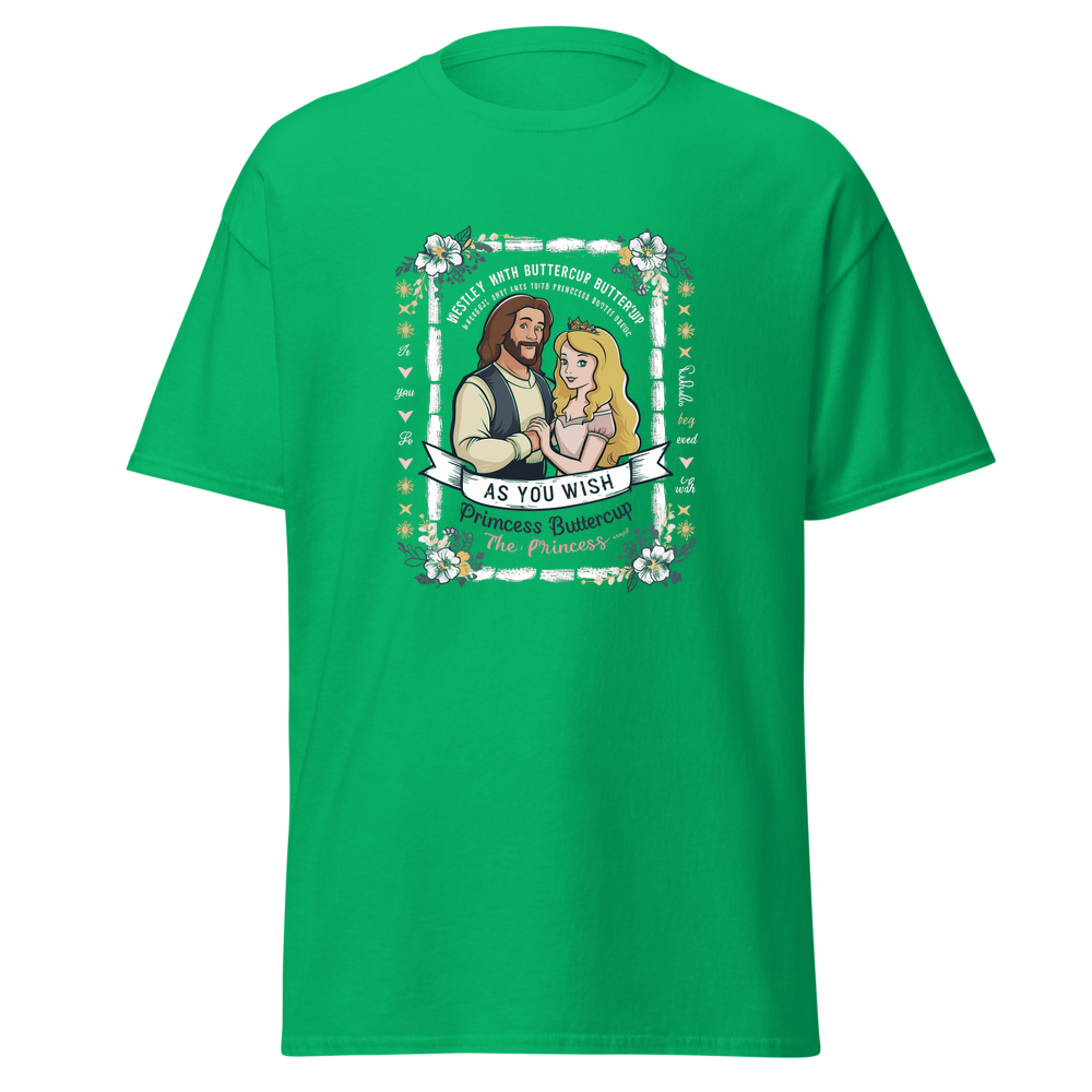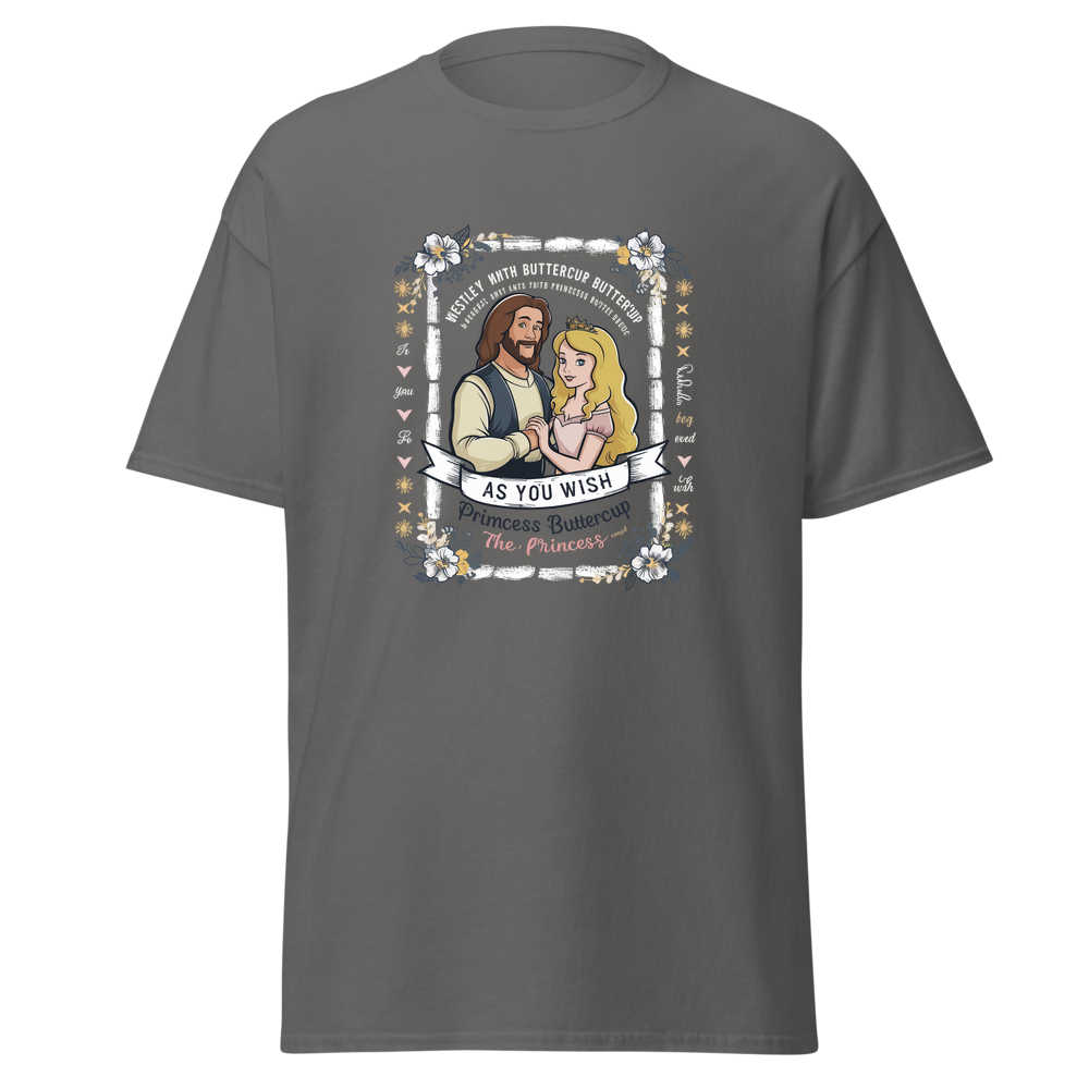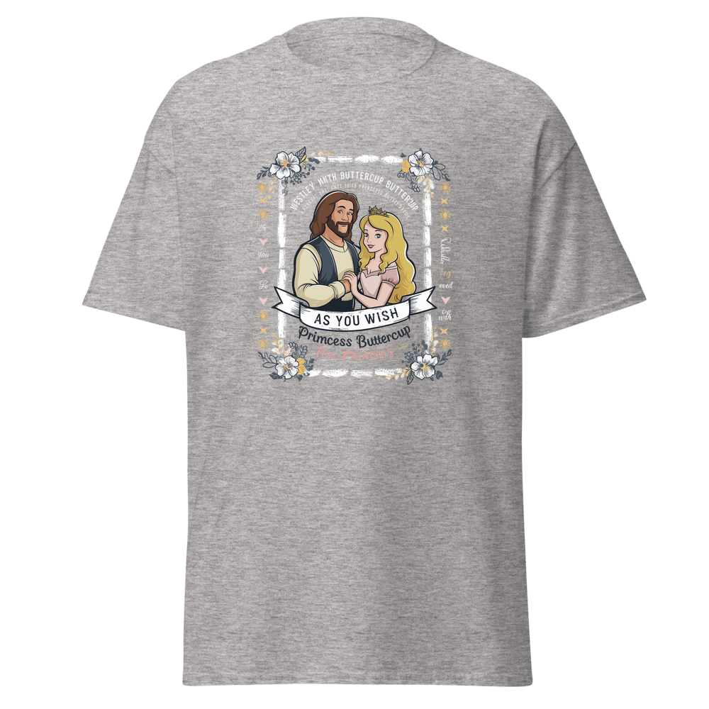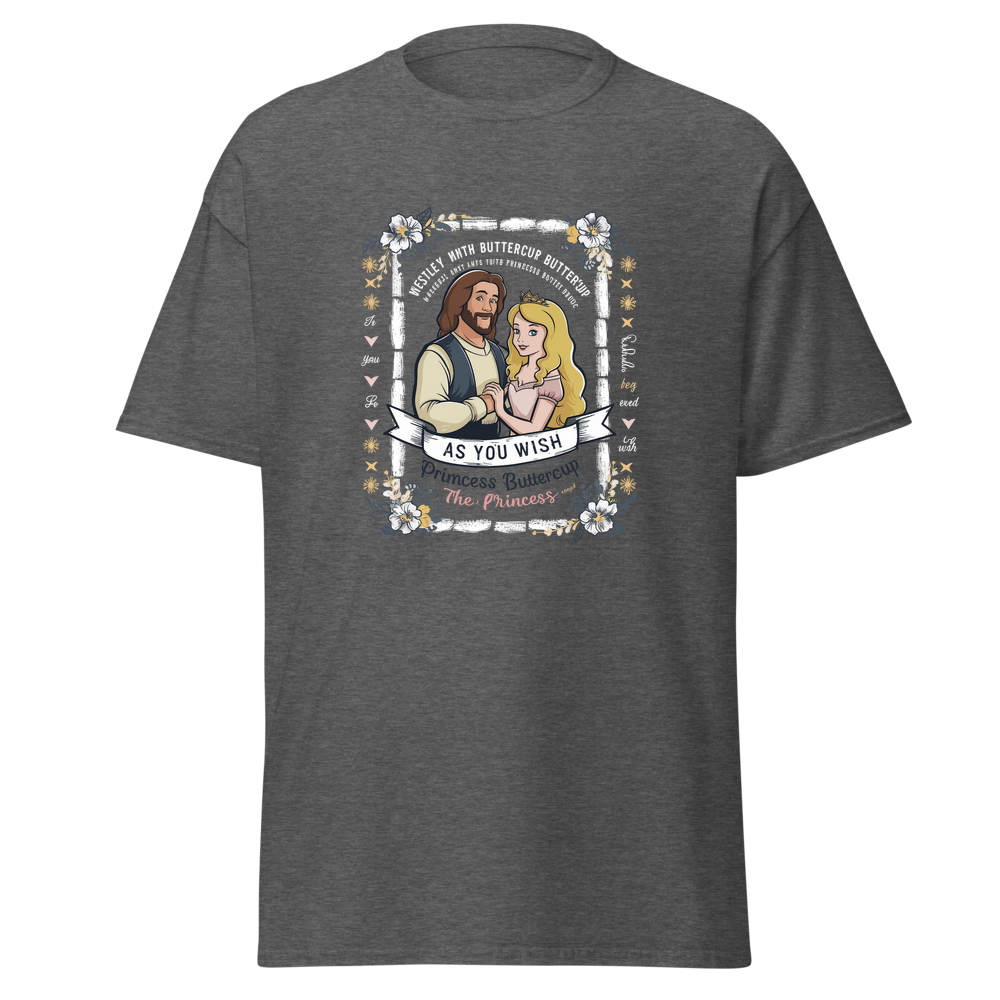 This shirt features a timeless scene of Westley and Princess Buttercup surrounded by a charming “storybook” frame with vintage floral borders. Perfect for fans of classic movies and romance!This t-shirt is everything you’ve dreamed of and more. It feels soft and lightweight, with the right amount of stretch. It’s comfortable and flattering for all. 100% combed and ring-spun cotton (Heather colors contain polyester) Fabric weight: 4.2 oz./yd.² (142 g/m²) Pre-shrunk fabric Side-seamed construction Shoulder-to-shoulder taping