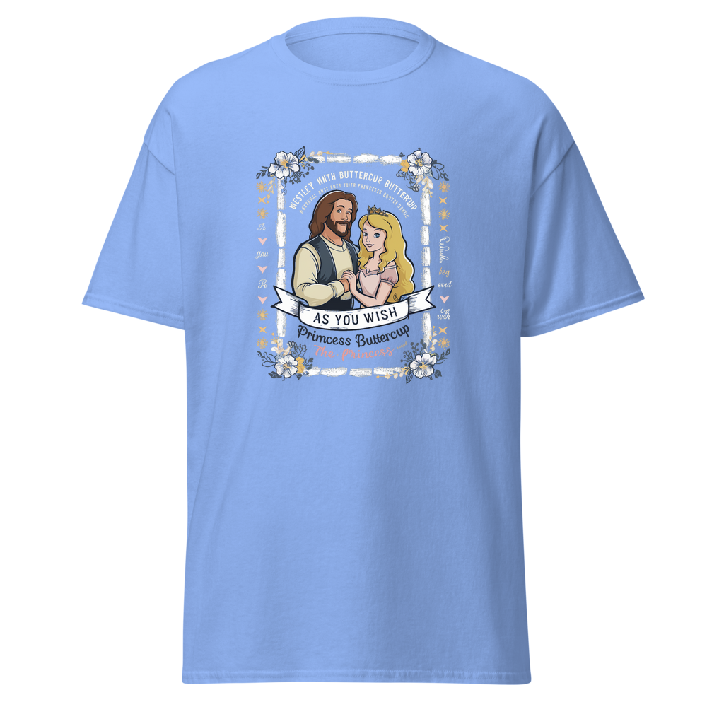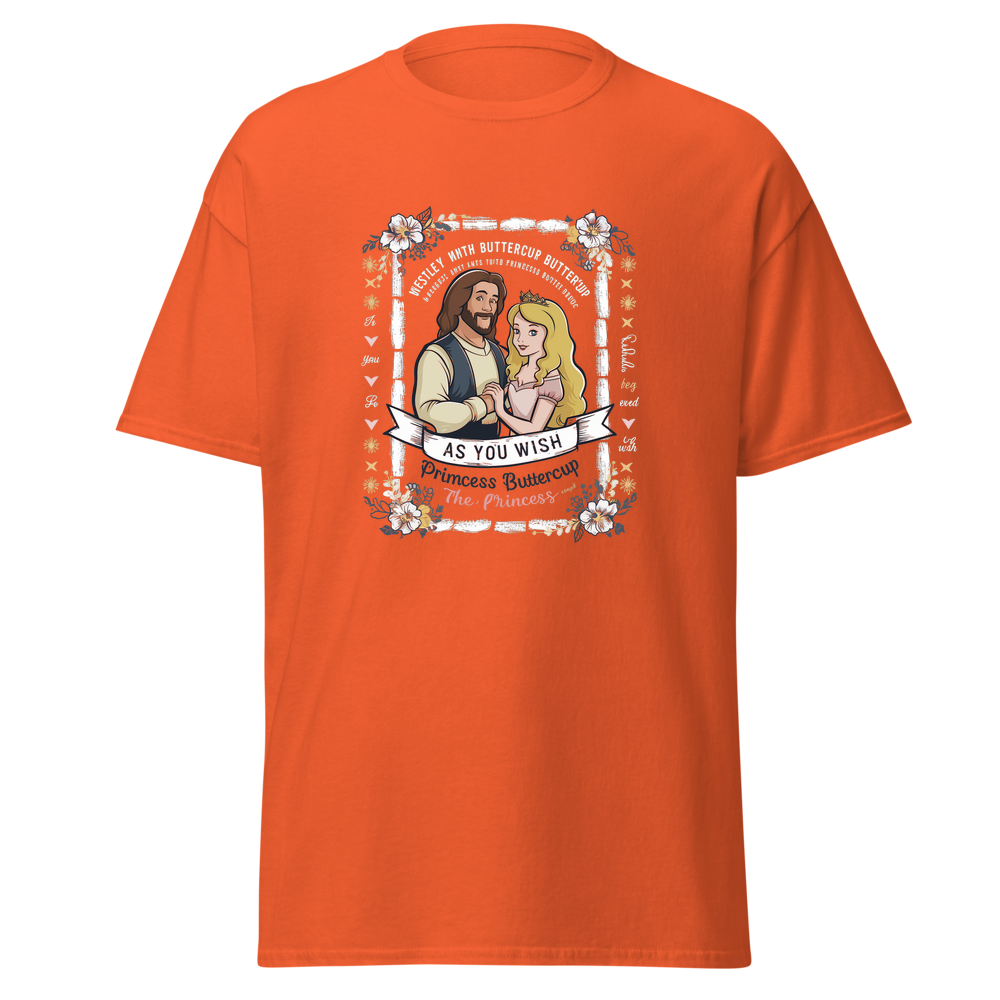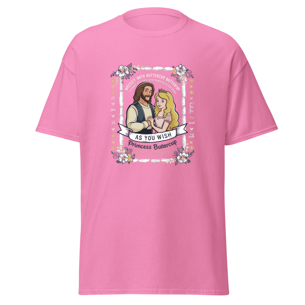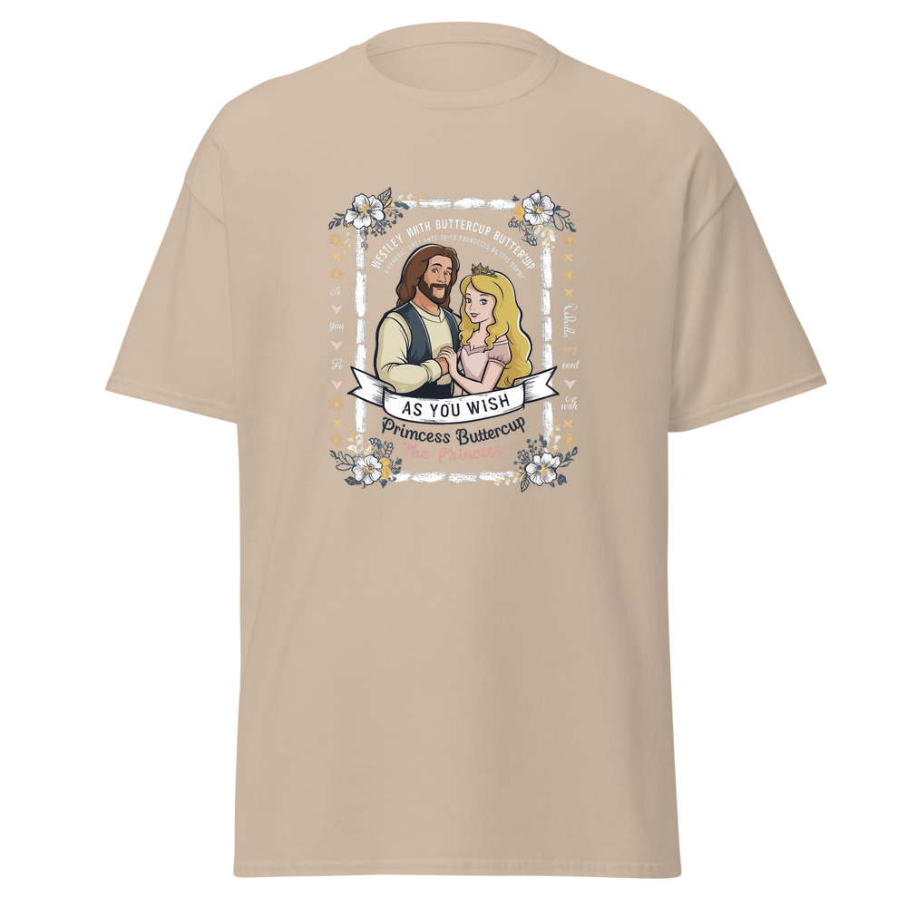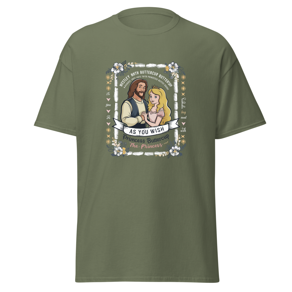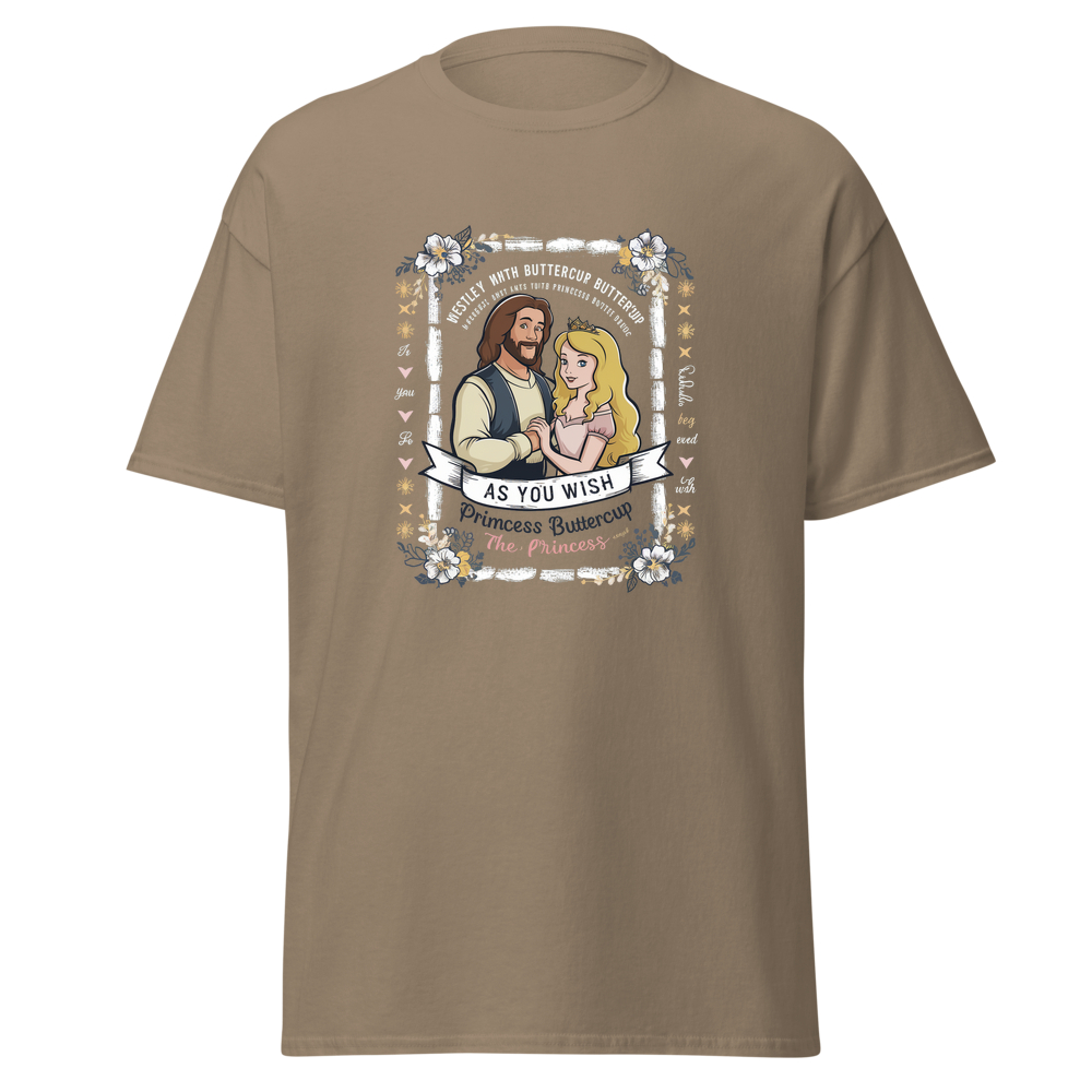 This shirt features a timeless scene of Westley and Princess Buttercup surrounded by a charming “storybook” frame with vintage floral borders. Perfect for fans of classic movies and romance!This t-shirt is everything you’ve dreamed of and more. It feels soft and lightweight, with the right amount of stretch. It’s comfortable and flattering for all. 100% combed and ring-spun cotton (Heather colors contain polyester) Fabric weight: 4.2 oz./yd.² (142 g/m²) Pre-shrunk fabric Side-seamed construction Shoulder-to-shoulder taping