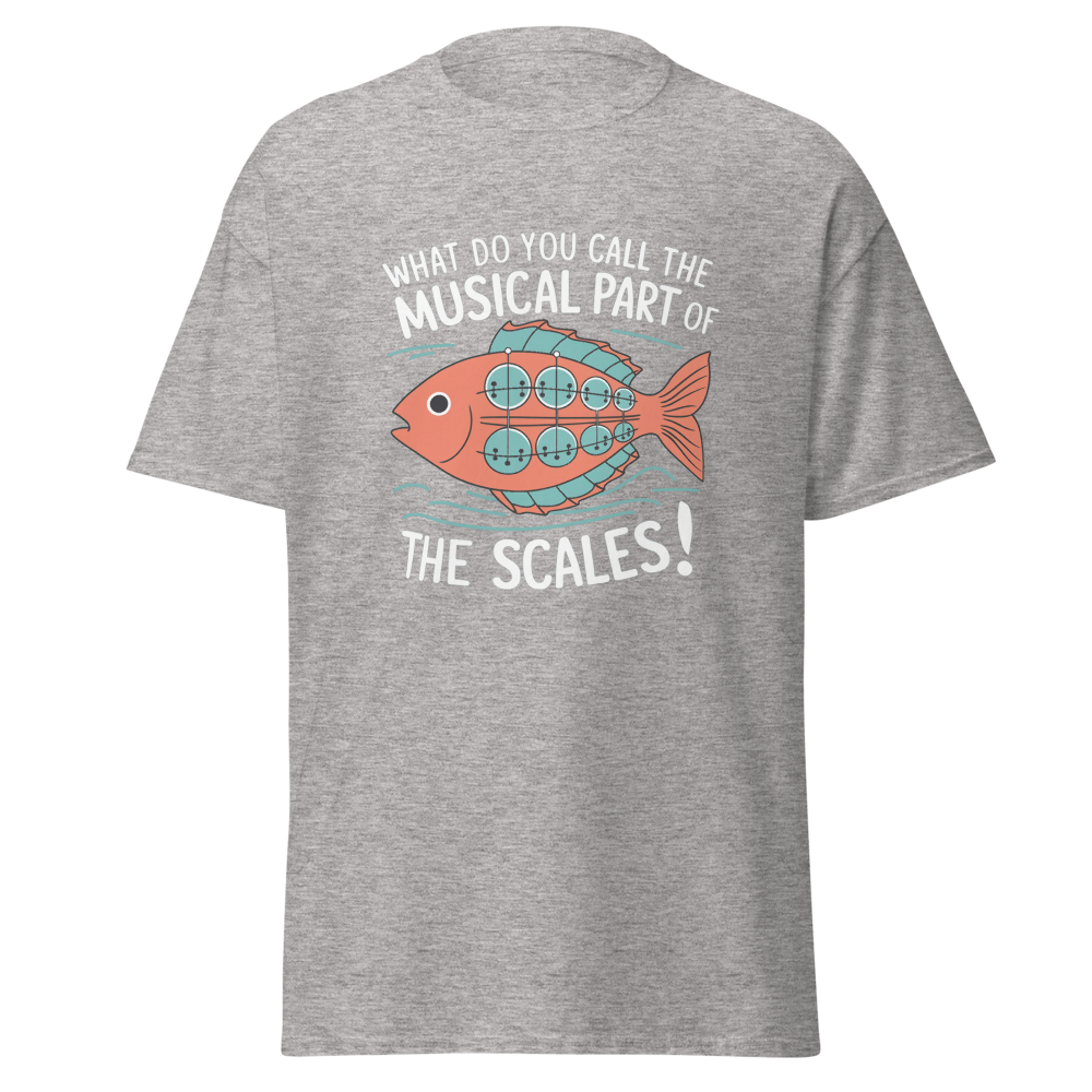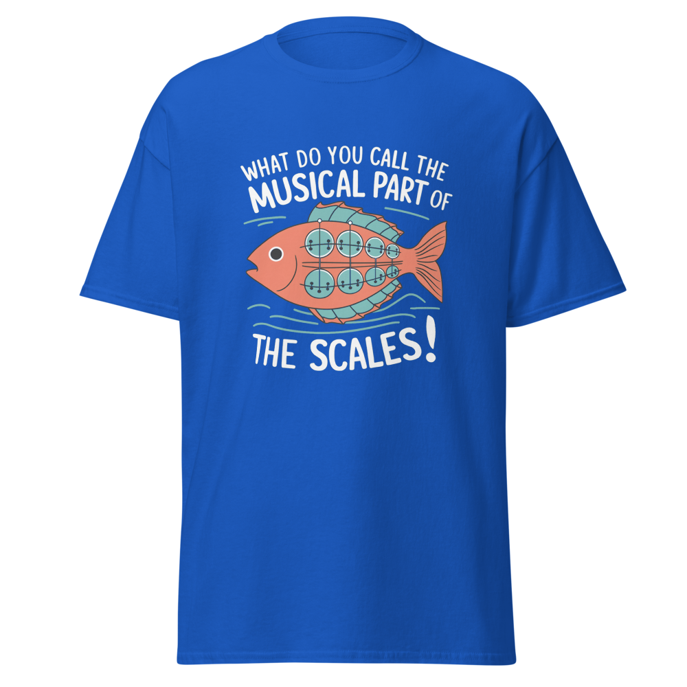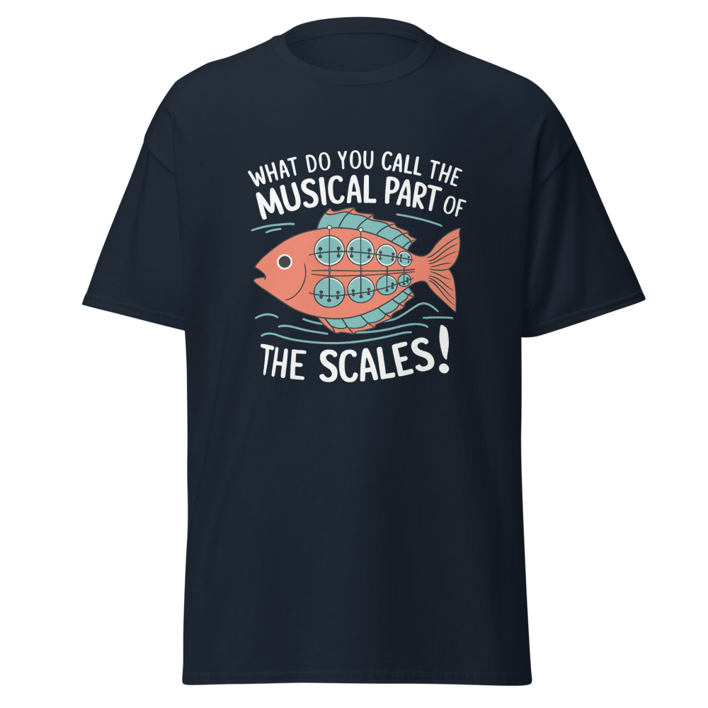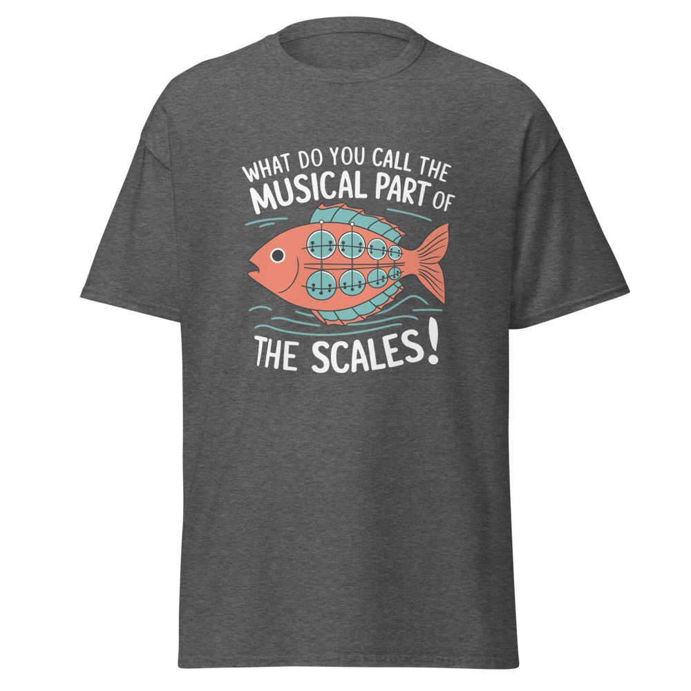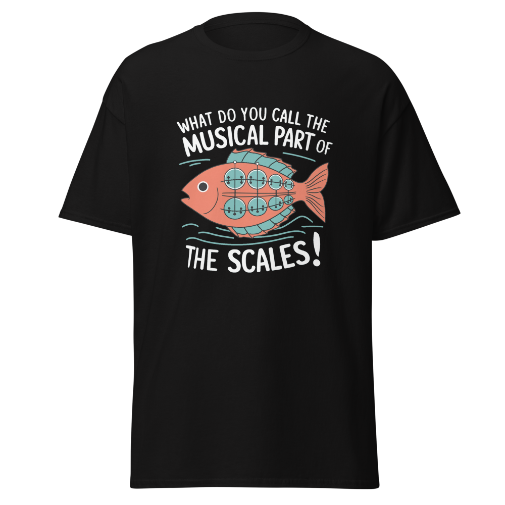 A whimsical fish with musical scales strums a banjo while waves ripple around. Perfect for music lovers and teens with a quirky sense of humor.This t-shirt is everything you’ve dreamed of and more. It feels soft and lightweight, with the right amount of stretch. It’s comfortable and flattering for all. 100% combed and ring-spun cotton (Heather colors contain polyester) Fabric weight: 4.2 oz./yd.² (142 g/m²) Pre-shrunk fabric Side-seamed construction Shoulder-to-shoulder taping