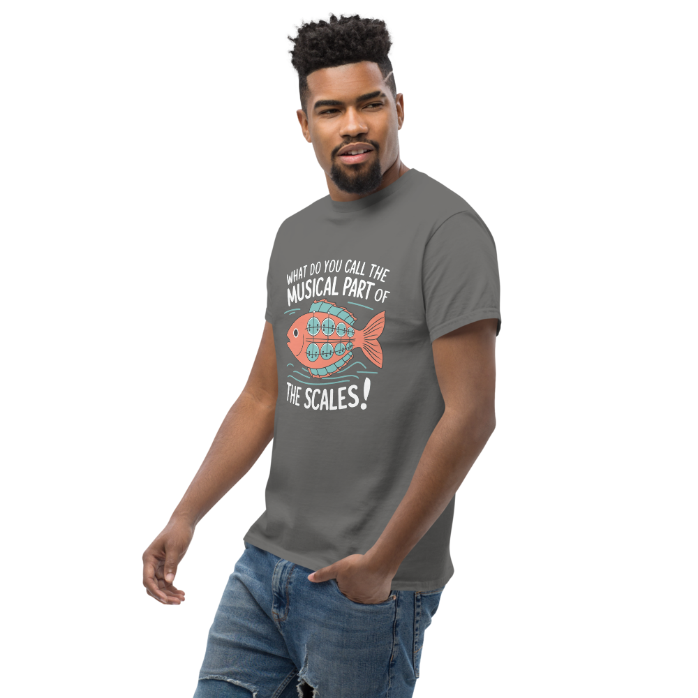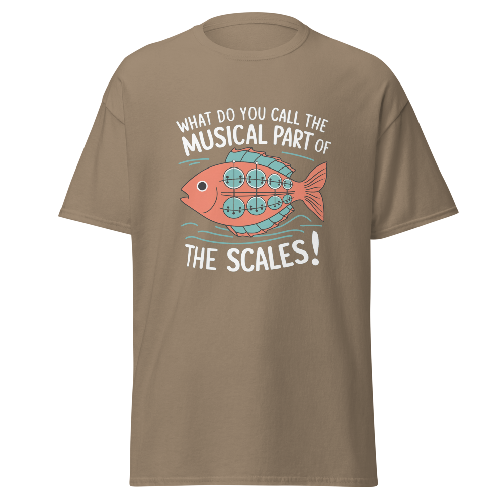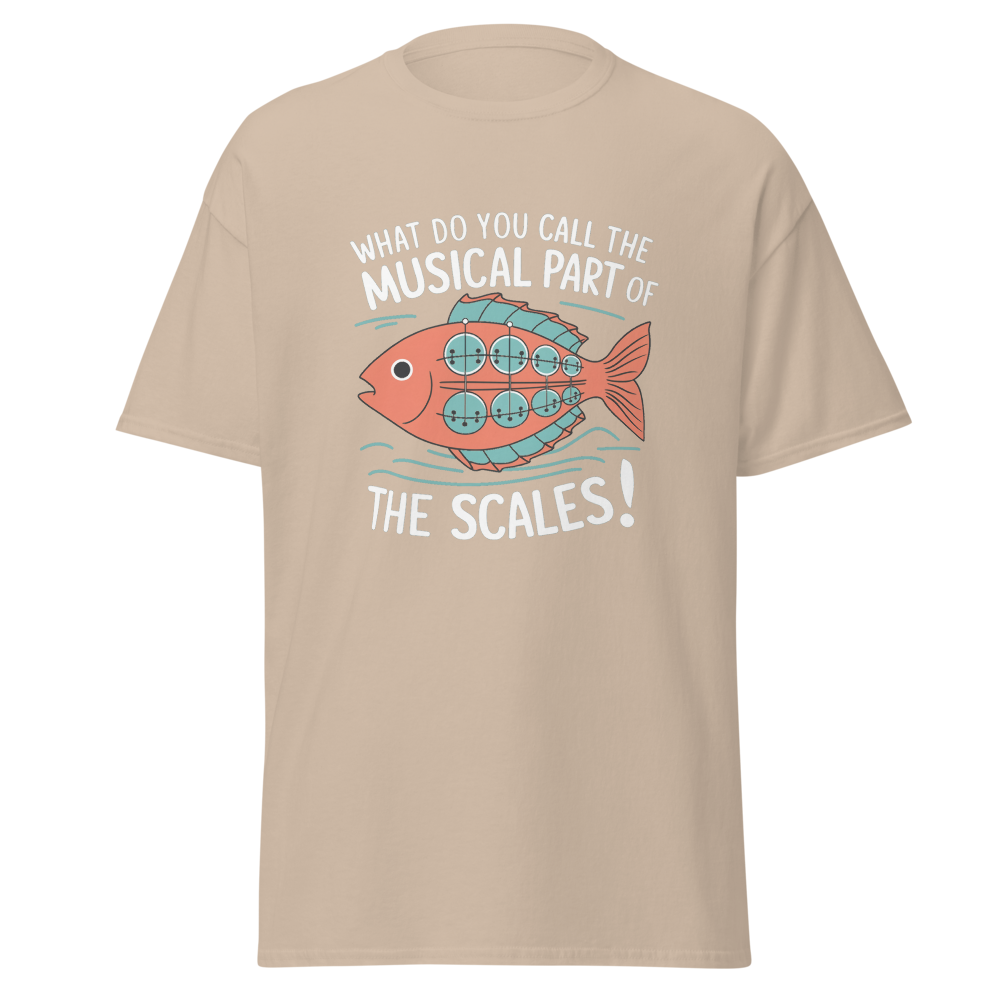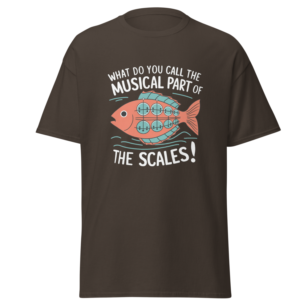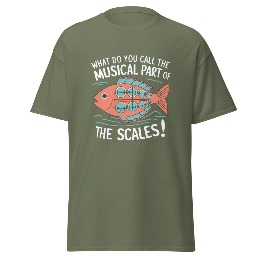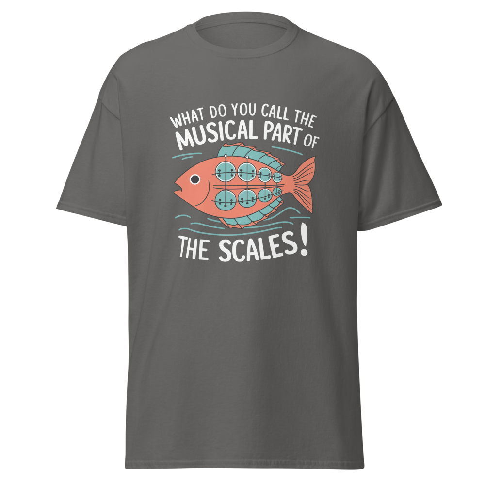 A whimsical fish with musical scales strums a banjo while waves ripple around. Perfect for music lovers and teens with a quirky sense of humor.This t-shirt is everything you’ve dreamed of and more. It feels soft and lightweight, with the right amount of stretch. It’s comfortable and flattering for all. 100% combed and ring-spun cotton (Heather colors contain polyester) Fabric weight: 4.2 oz./yd.² (142 g/m²) Pre-shrunk fabric Side-seamed construction Shoulder-to-shoulder taping