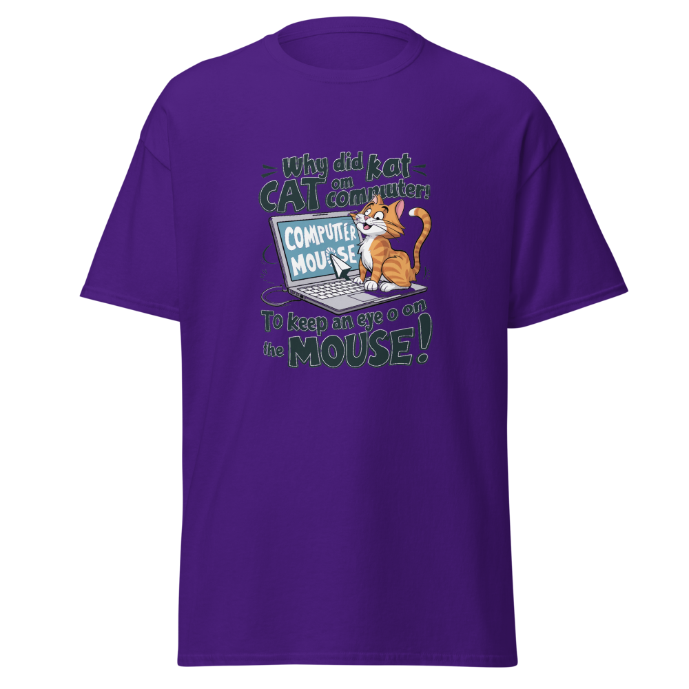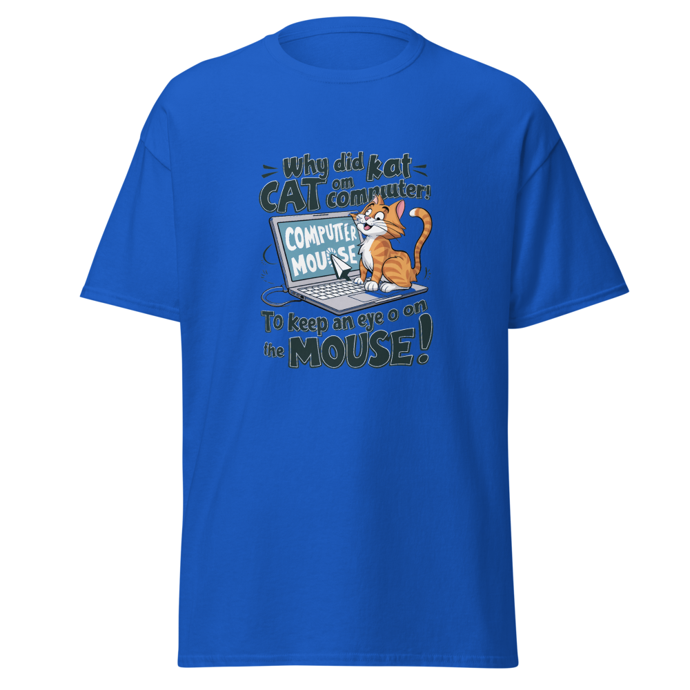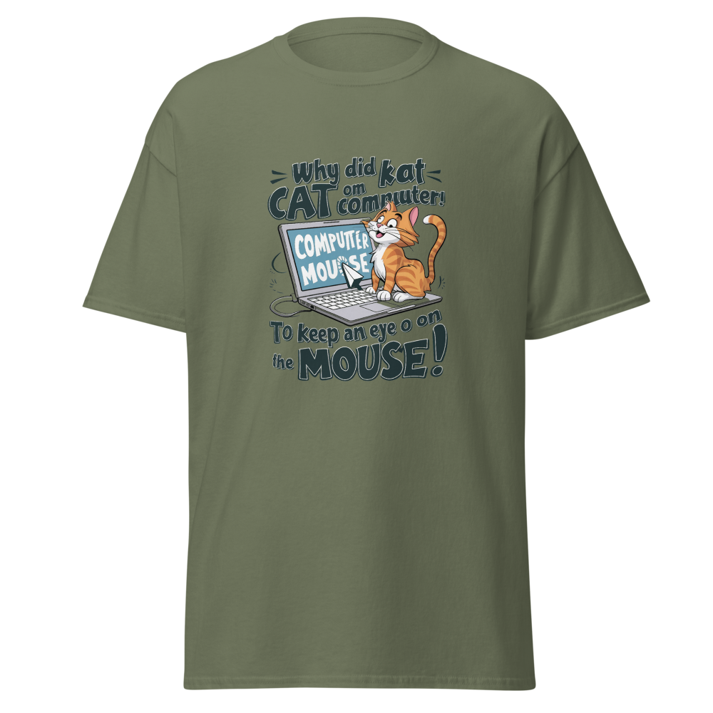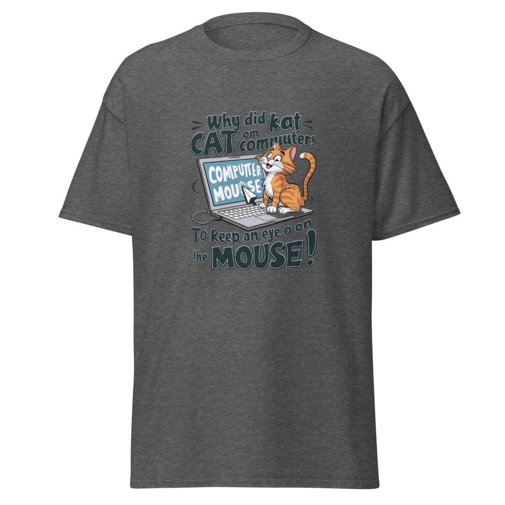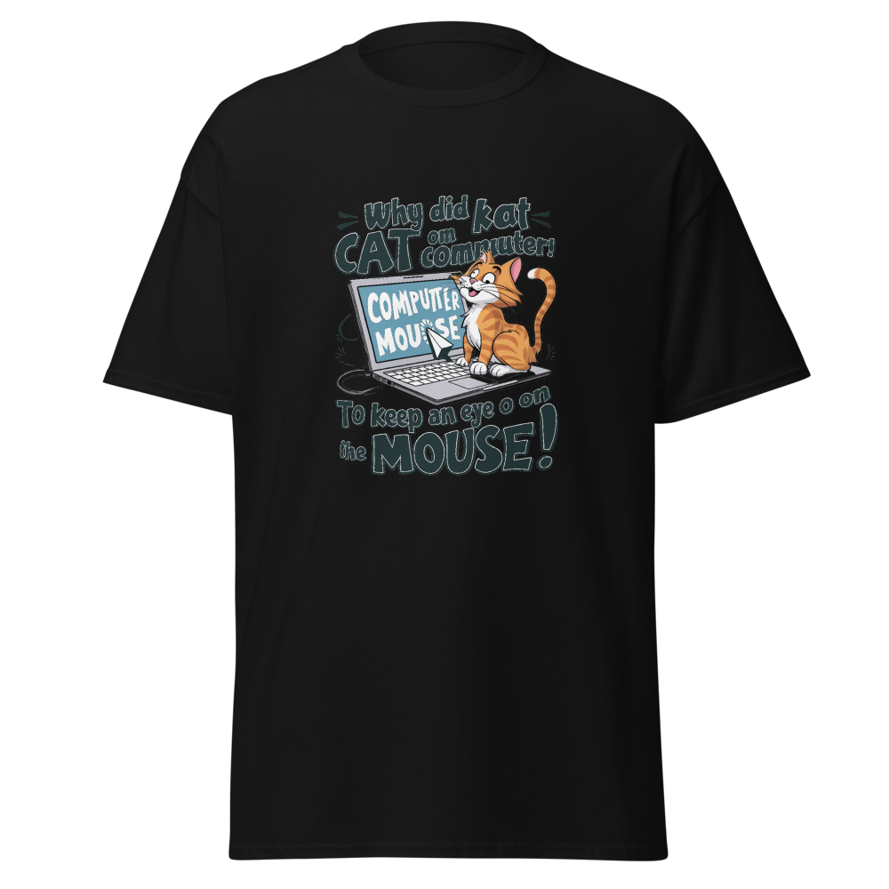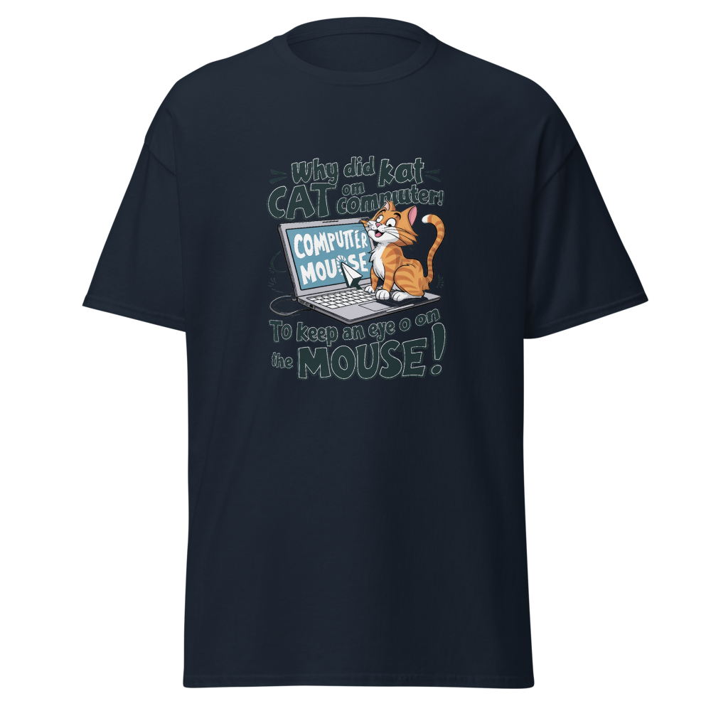 A playful cartoon cat lounging on a laptop while eyeing the mouse cursor nearby. Perfect for tech enthusiasts and cat lovers alike!This t-shirt is everything you’ve dreamed of and more. It feels soft and lightweight, with the right amount of stretch. It’s comfortable and flattering for all. 100% combed and ring-spun cotton (Heather colors contain polyester) Fabric weight: 4.2 oz./yd.² (142 g/m²) Pre-shrunk fabric Side-seamed construction Shoulder-to-shoulder taping