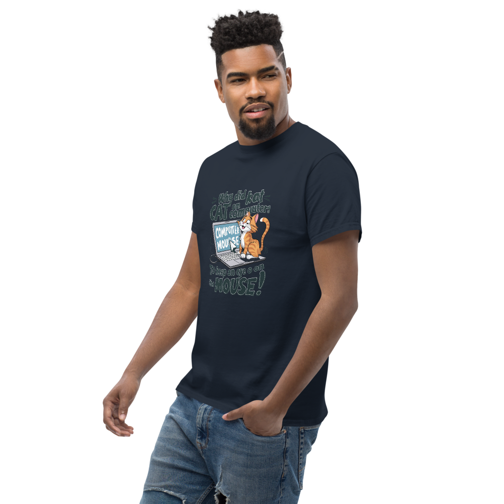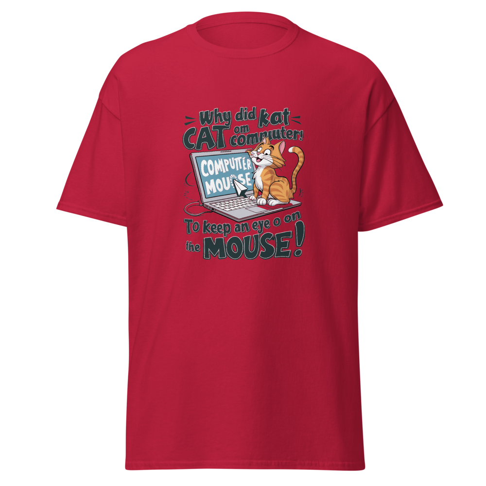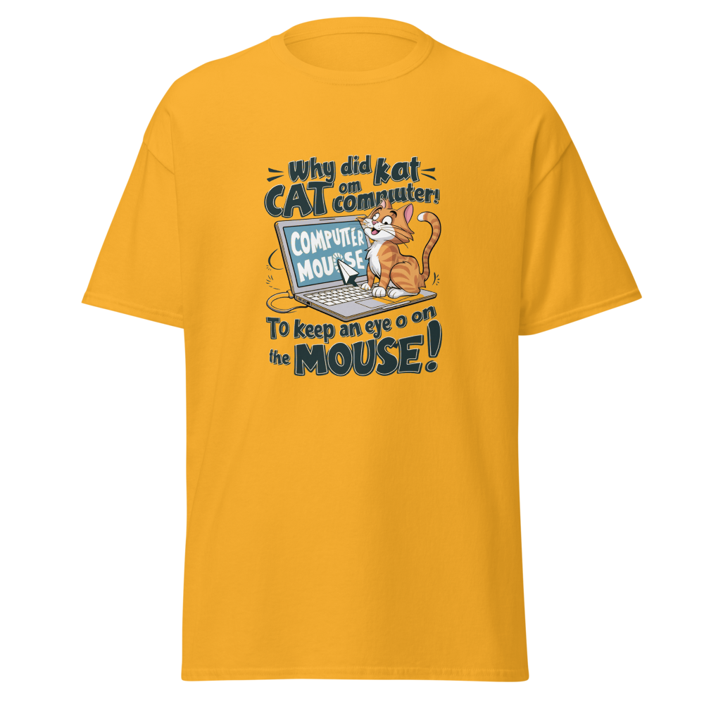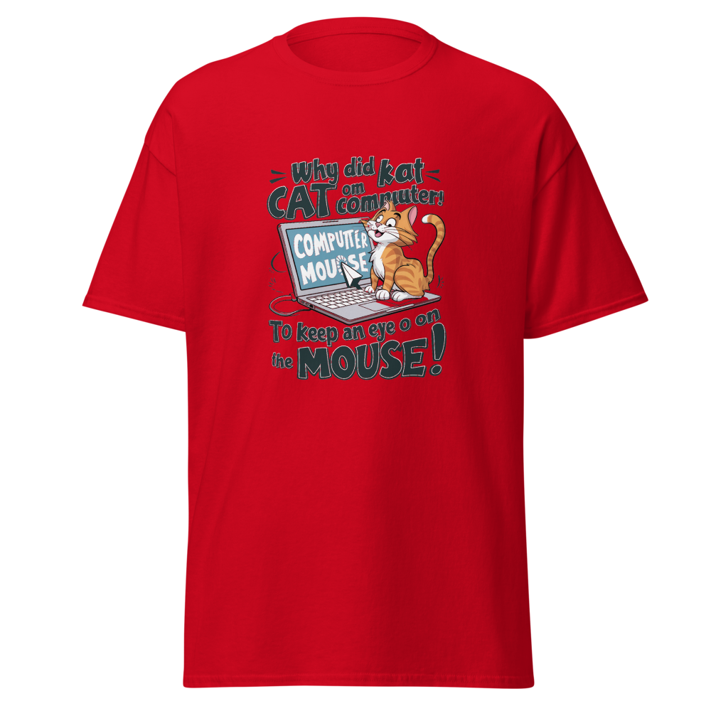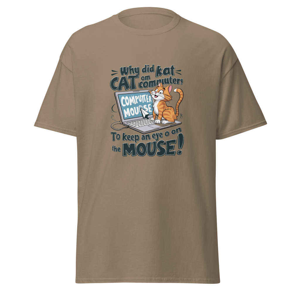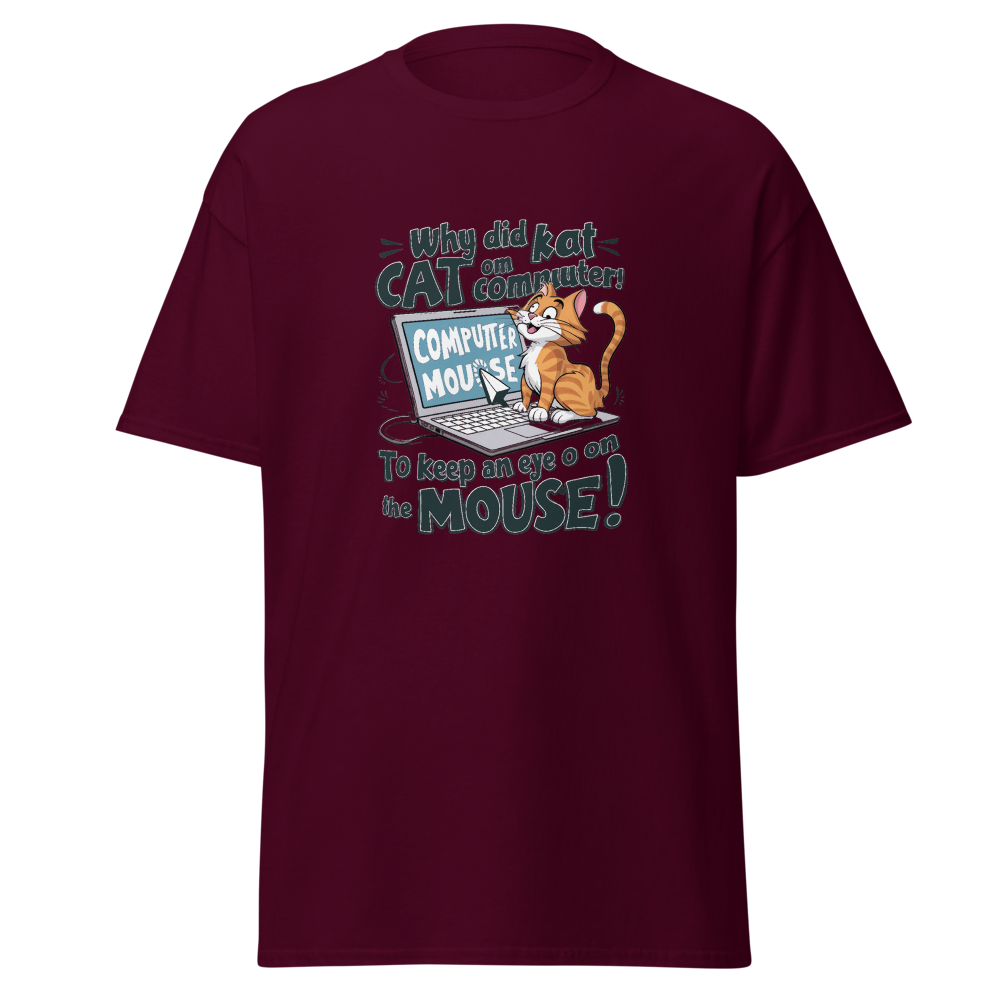 A playful cartoon cat lounging on a laptop while eyeing the mouse cursor nearby. Perfect for tech enthusiasts and cat lovers alike!This t-shirt is everything you’ve dreamed of and more. It feels soft and lightweight, with the right amount of stretch. It’s comfortable and flattering for all. 100% combed and ring-spun cotton (Heather colors contain polyester) Fabric weight: 4.2 oz./yd.² (142 g/m²) Pre-shrunk fabric Side-seamed construction Shoulder-to-shoulder taping