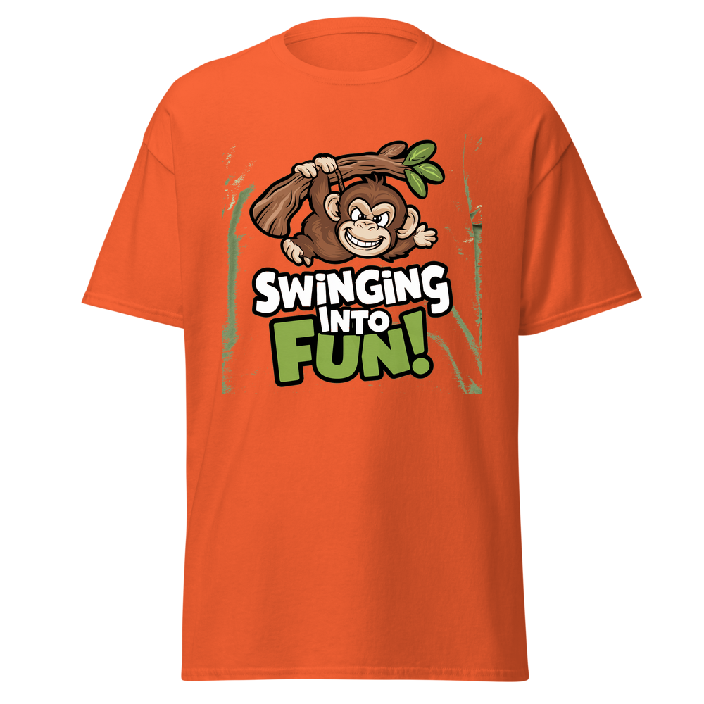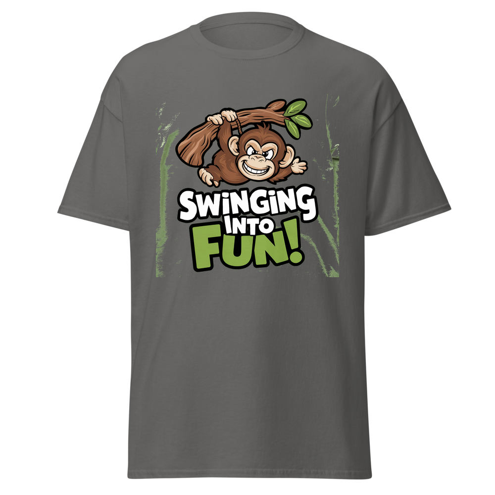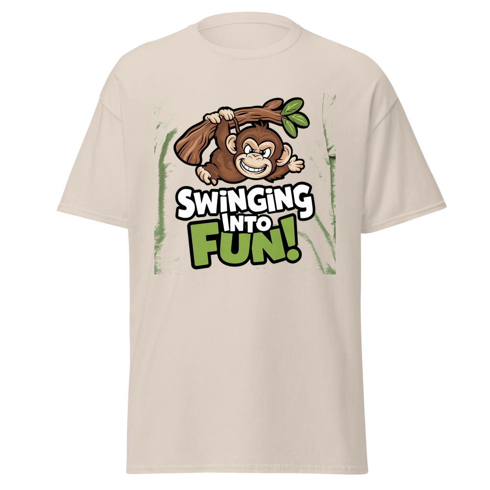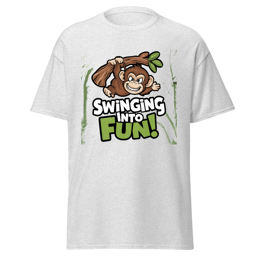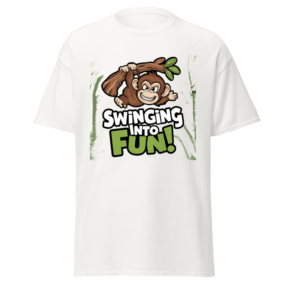 This playful design features a cute cartoon chimpanzee with a cheeky grin, joyfully swinging from a tree. Perfect for kids, animal lovers, and anyone young at heart.This t-shirt is everything you’ve dreamed of and more. It feels soft and lightweight, with the right amount of stretch. It’s comfortable and flattering for all. 100% combed and ring-spun cotton (Heather colors contain polyester) Fabric weight: 4.2 oz./yd.² (142 g/m²) Pre-shrunk fabric Side-seamed construction Shoulder-to-shoulder taping
