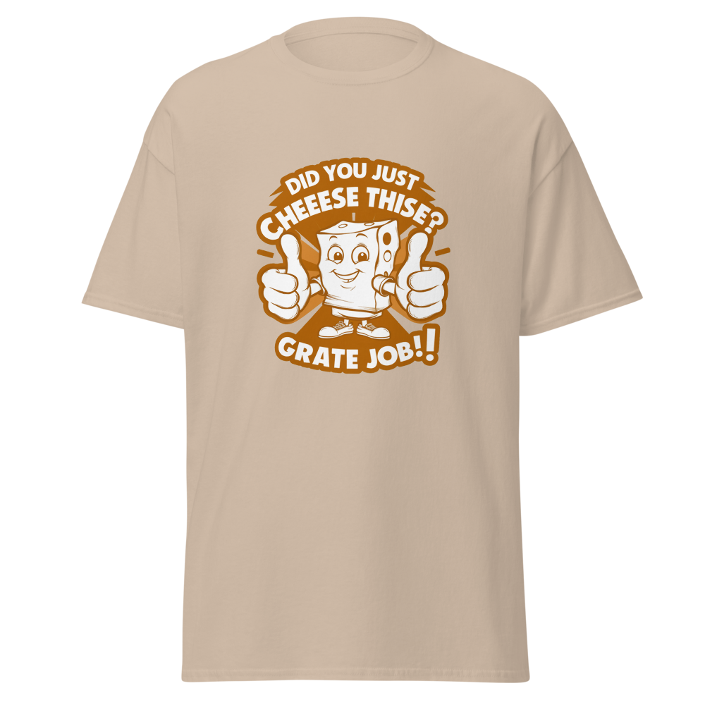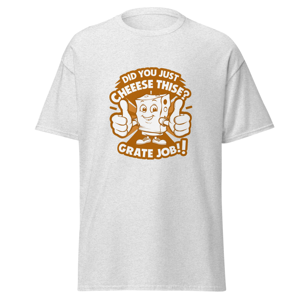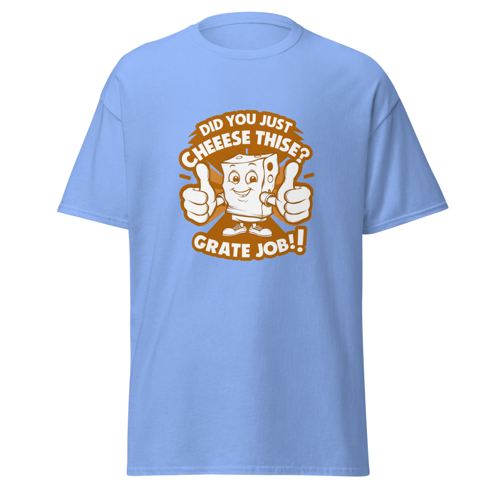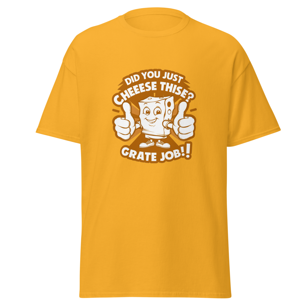This tee features a cartoon block of cheese giving an enthusiastic thumbs up, adding a fun and quirky touch for anyone who loves a good laugh. Ideal for young adults and stand-up comedy fans.This t-shirt is everything you’ve dreamed of and more. It feels soft and lightweight, with the right amount of stretch. It’s comfortable and flattering for all. 100% combed and ring-spun cotton (Heather colors contain polyester) Fabric weight: 4.2 oz./yd.² (142 g/m²) Pre-shrunk fabric Side-seamed construction Shoulder-to-shoulder taping