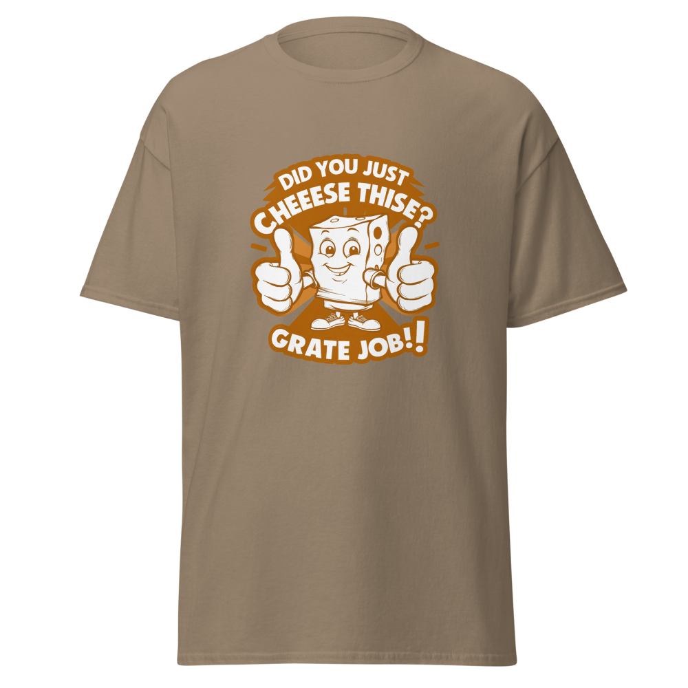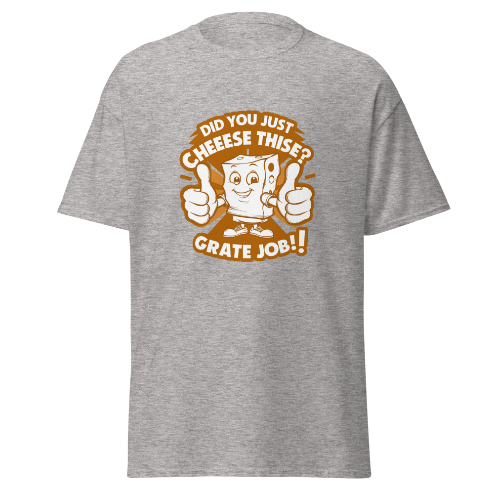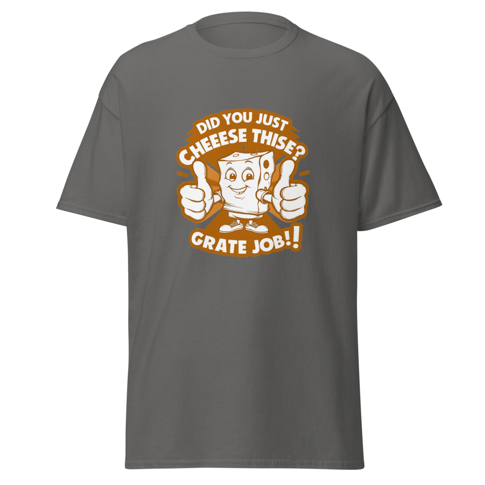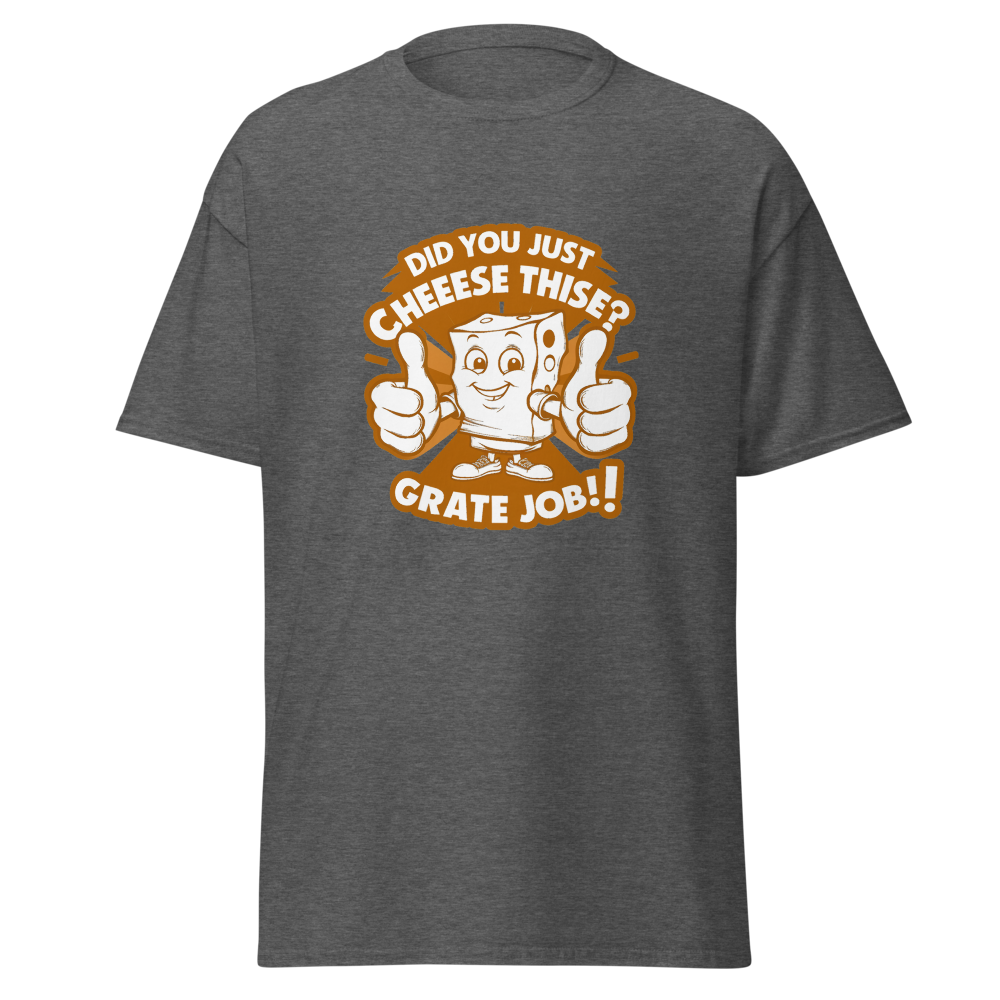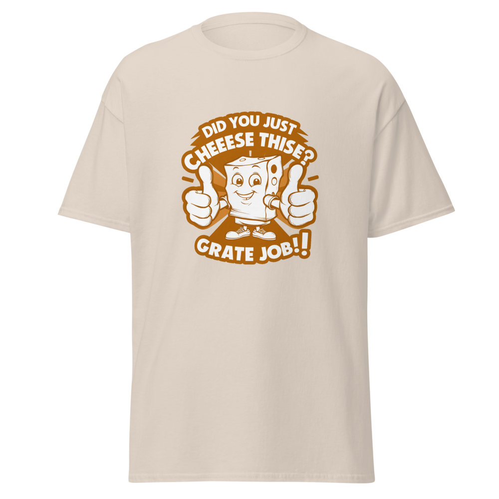 This tee features a cartoon block of cheese giving an enthusiastic thumbs up, adding a fun and quirky touch for anyone who loves a good laugh. Ideal for young adults and stand-up comedy fans.This t-shirt is everything you’ve dreamed of and more. It feels soft and lightweight, with the right amount of stretch. It’s comfortable and flattering for all. 100% combed and ring-spun cotton (Heather colors contain polyester) Fabric weight: 4.2 oz./yd.² (142 g/m²) Pre-shrunk fabric Side-seamed construction Shoulder-to-shoulder taping