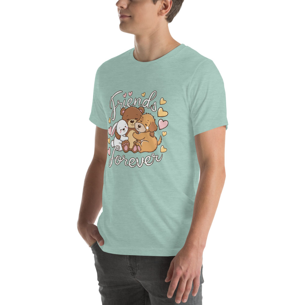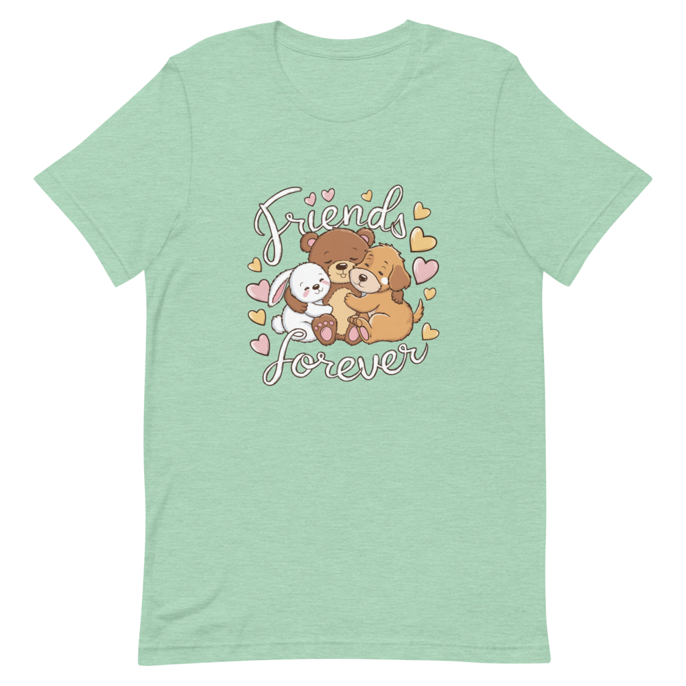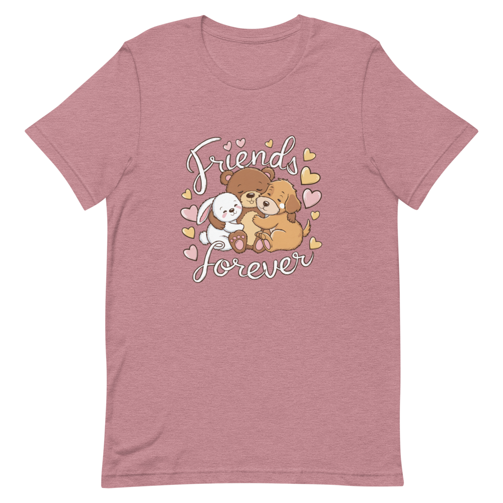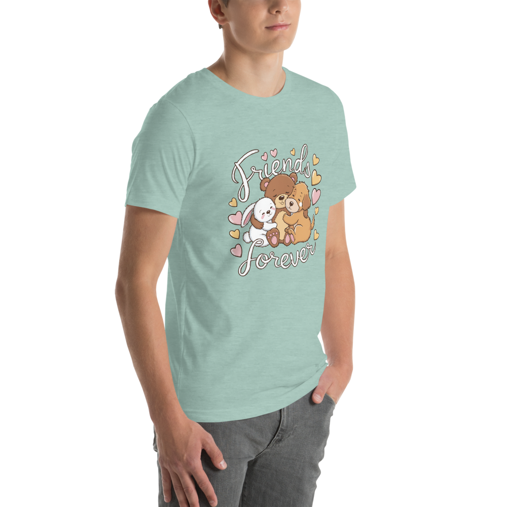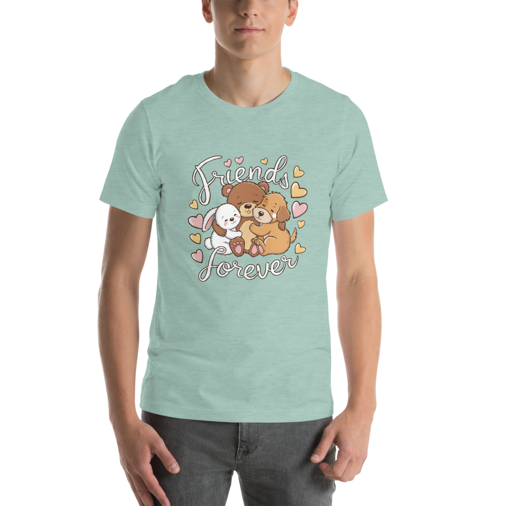 Adorable cartoon stuffed animals, including a bear, bunny, and dog, surrounded by heart shapes. Perfect for kids who cherish their classic toys and friendships.This t-shirt is everything you’ve dreamed of and more. It feels soft and lightweight, with the right amount of stretch. It’s comfortable and flattering for all. 100% combed and ring-spun cotton (Heather colors contain polyester) Fabric weight: 4.2 oz./yd.² (142 g/m²) Pre-shrunk fabric Side-seamed construction Shoulder-to-shoulder taping