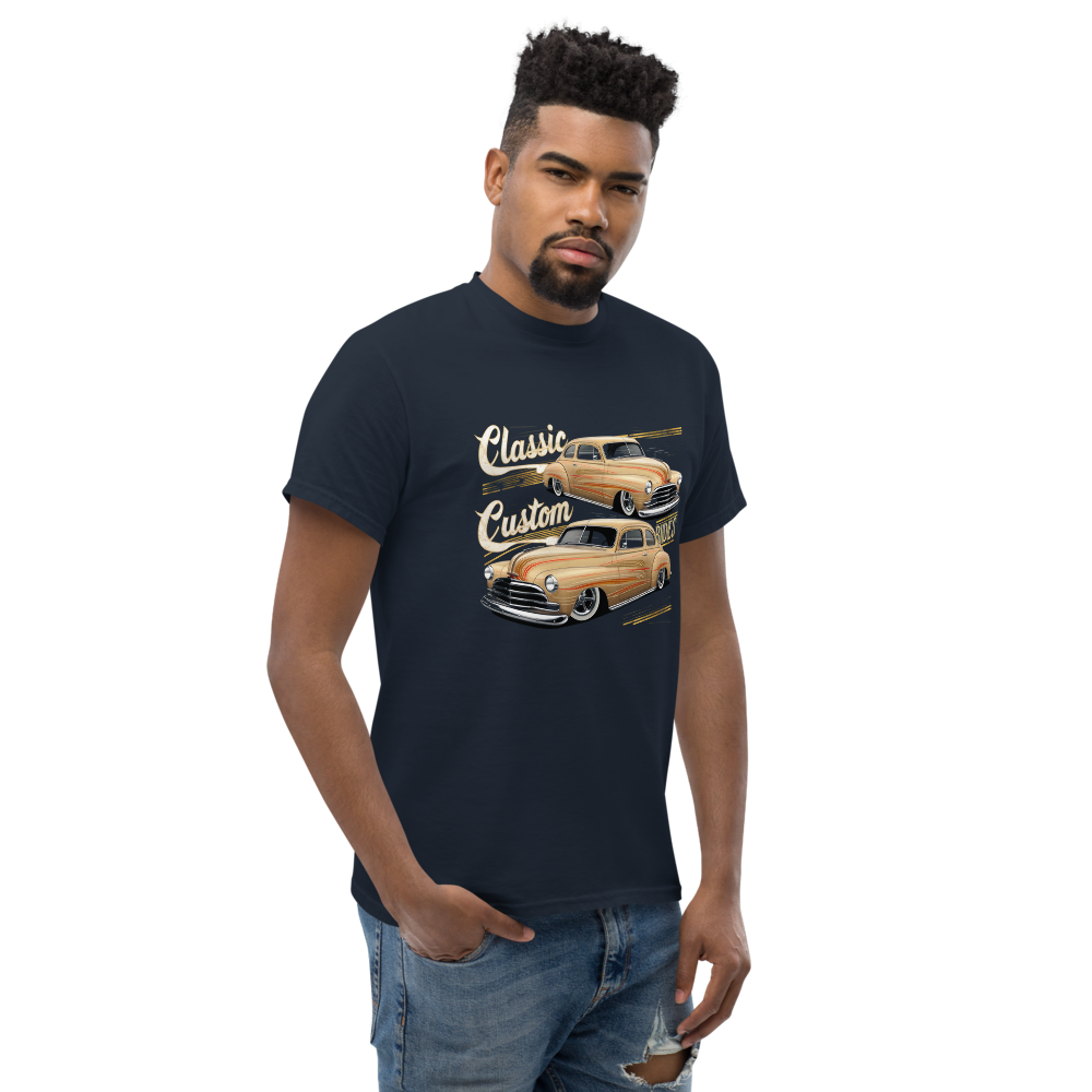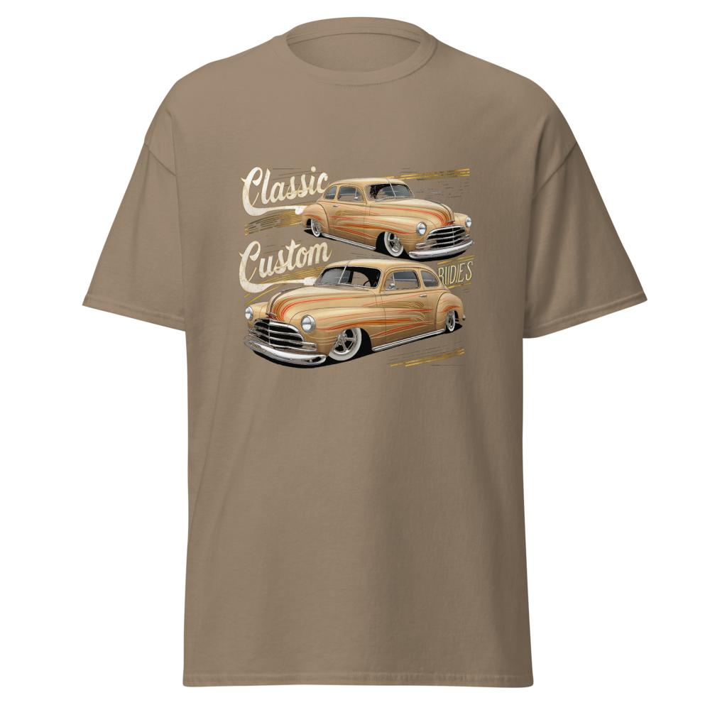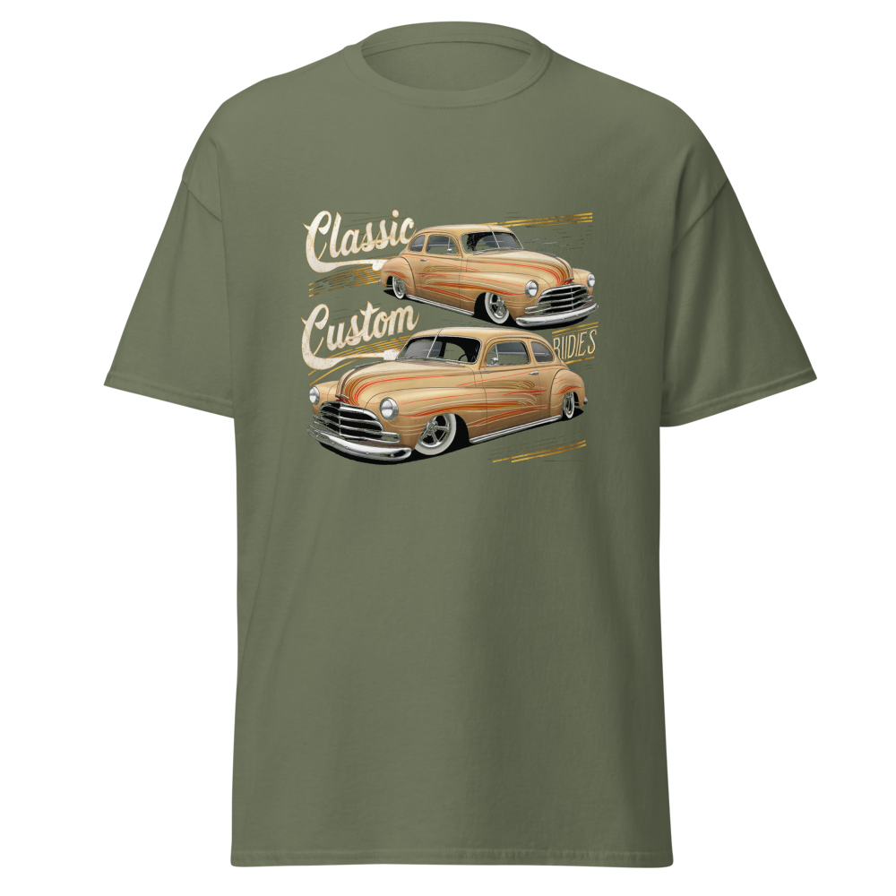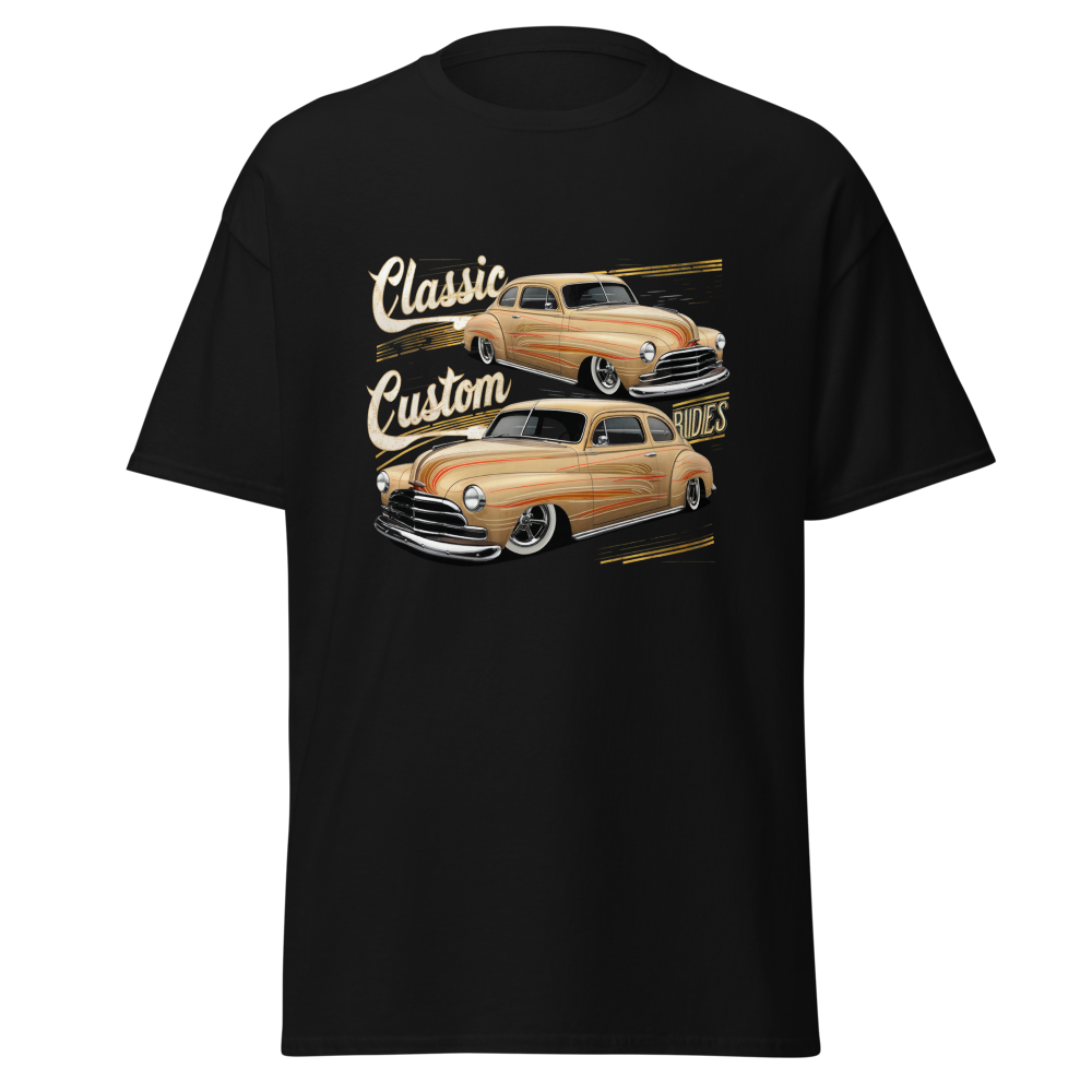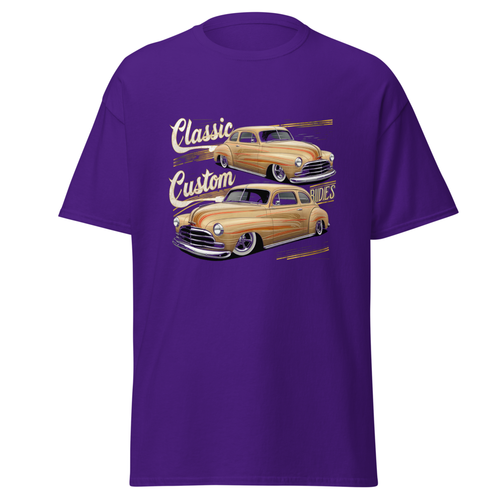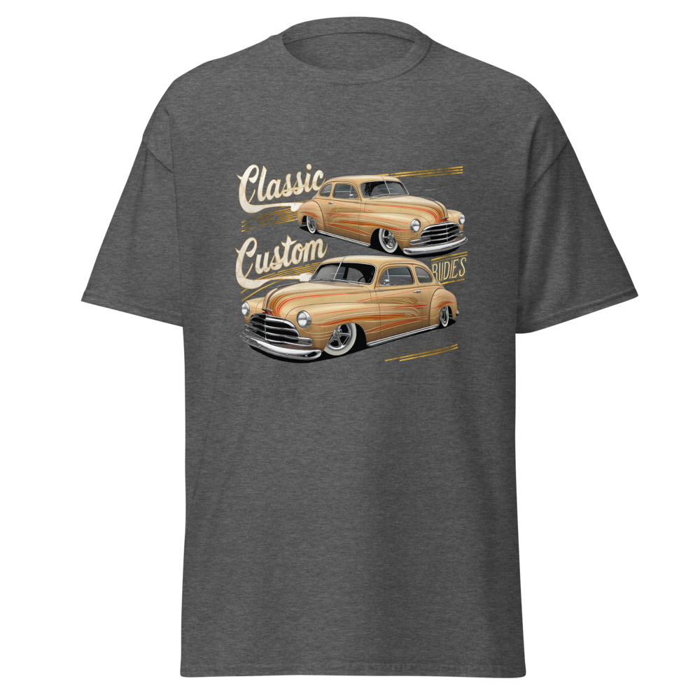 This tee showcases stunning, highly customized classic cars adorned with stylish pinstriping. The vintage touch comes through with vibrant, muted colors and a subtle worn effect. Perfect for adults who appreciate timeless automotive artistry.This t-shirt is everything you’ve dreamed of and more. It feels soft and lightweight, with the right amount of stretch. It’s comfortable and flattering for all. 100% combed and ring-spun cotton (Heather colors contain polyester) Fabric weight: 4.2 oz./yd.² (142 g/m²) Pre-shrunk fabric Side-seamed construction Shoulder-to-shoulder taping
