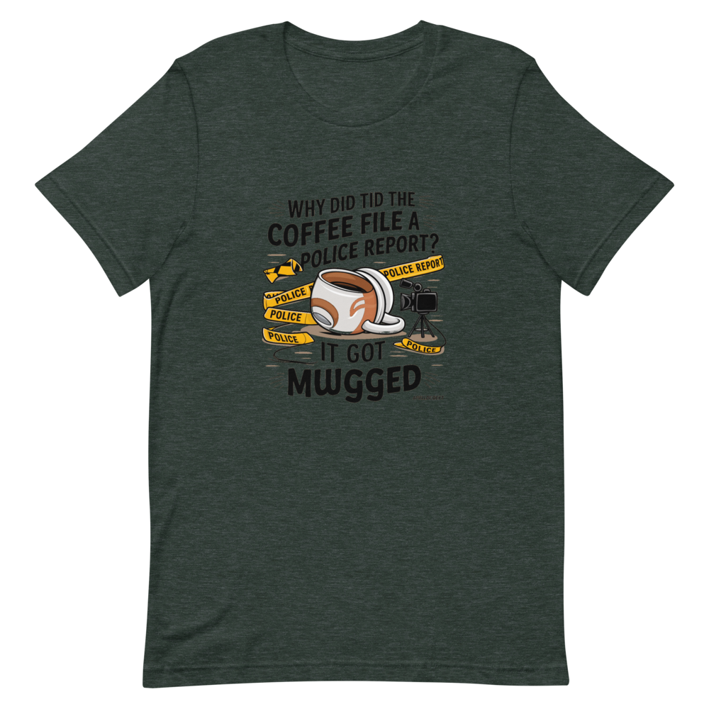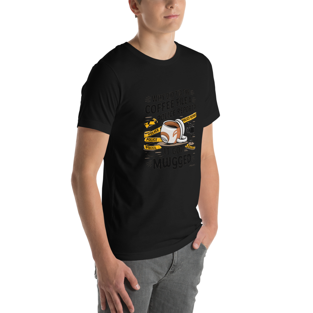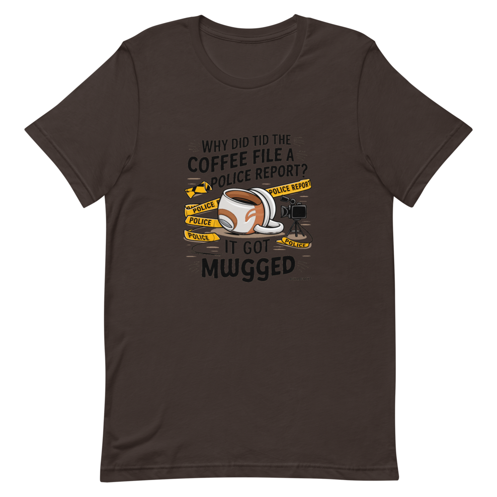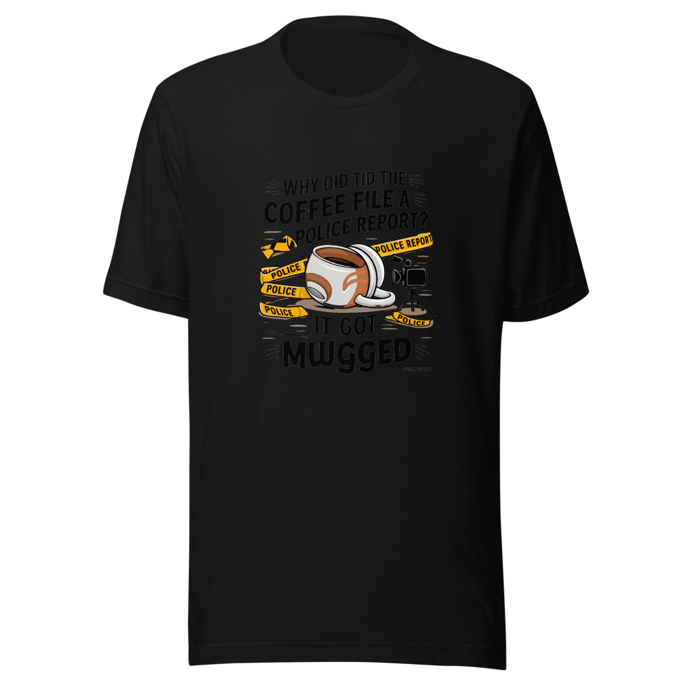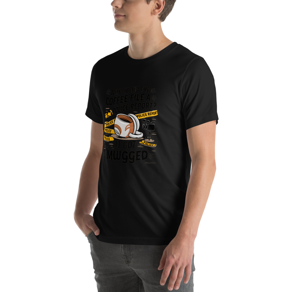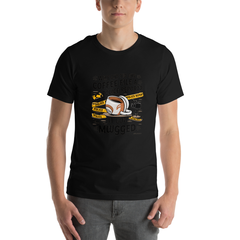 A playful scene of a cartoon coffee cup tipped over, surrounded by police tape with a movie camera filming the action. Perfect for those who love a good laugh and enjoy a touch of cinematic humor.This t-shirt is everything you’ve dreamed of and more. It feels soft and lightweight, with the right amount of stretch. It’s comfortable and flattering for all. 100% combed and ring-spun cotton (Heather colors contain polyester) Fabric weight: 4.2 oz./yd.² (142 g/m²) Pre-shrunk fabric Side-seamed construction Shoulder-to-shoulder taping