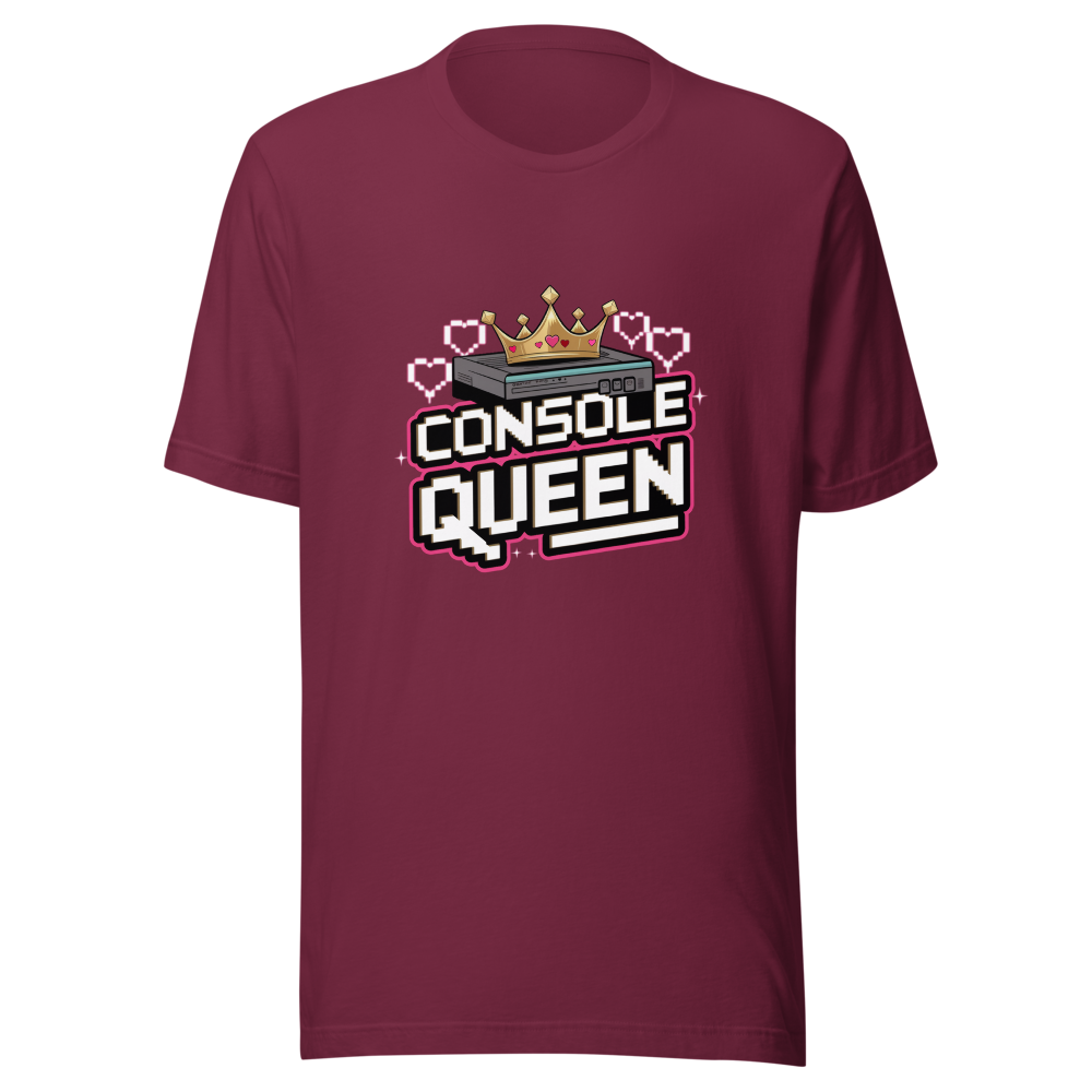 Embrace your gaming royalty with this unique tee featuring a crowned retro game console. Hearts and stars surround the design, giving it charming pixelated flair perfect for any Console Queen. Ideal for teens and retro gaming fans.This t-shirt is everything you’ve dreamed of and more. It feels soft and lightweight, with the right amount of stretch. It’s comfortable and flattering for all. 100% combed and ring-spun cotton (Heather colors contain polyester) Fabric weight: 4.2 oz./yd.² (142 g/m²) Pre-shrunk fabric Side-seamed construction Shoulder-to-shoulder taping