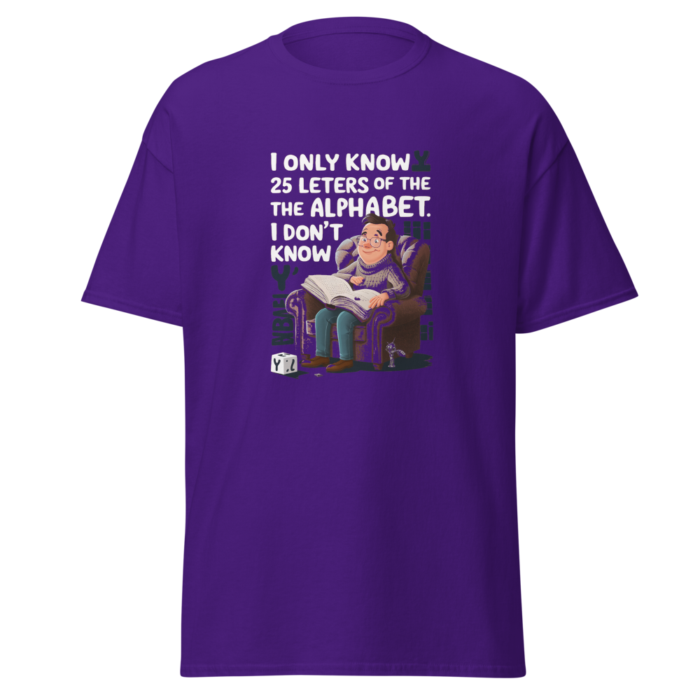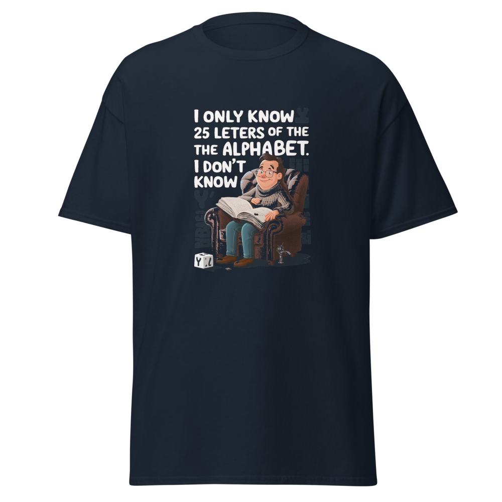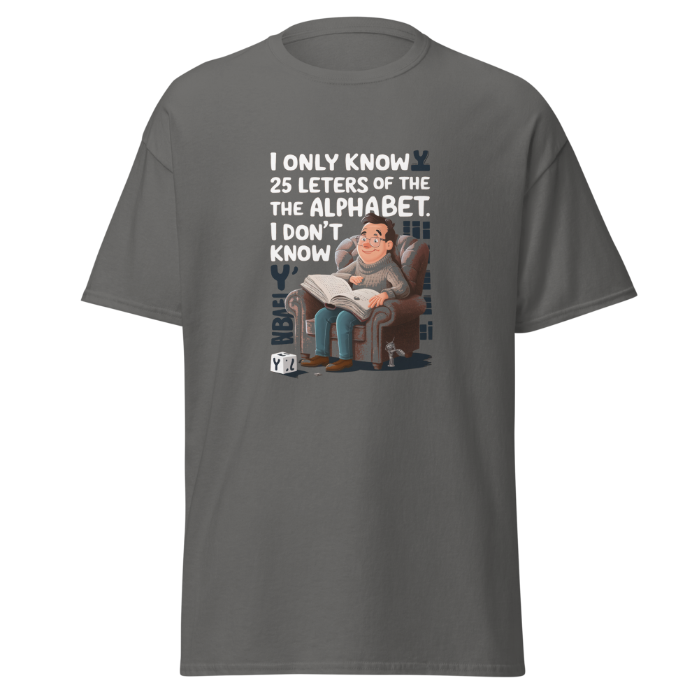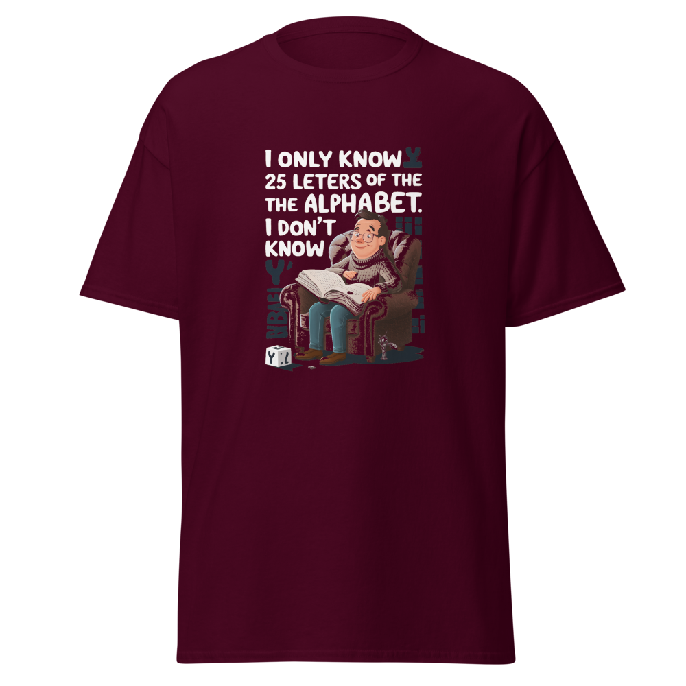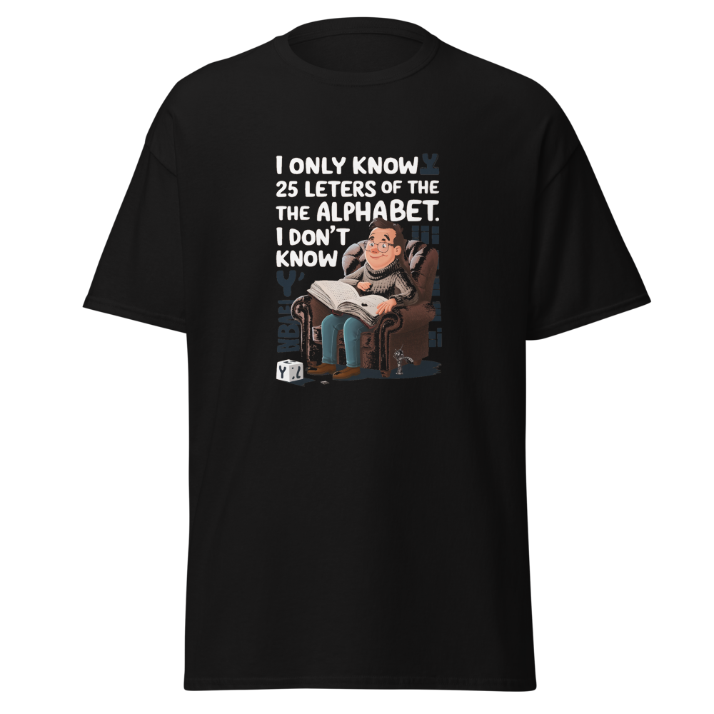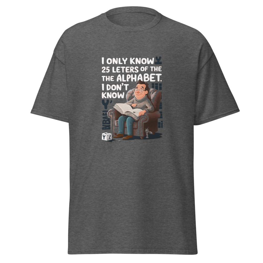 This playful tee features a quirky dad in a library, cleverly missing a “Y” alphabet block and a unique D20 bookmark. Perfect for teen tabletop gamers and anyone who loves a good pun.This t-shirt is everything you’ve dreamed of and more. It feels soft and lightweight, with the right amount of stretch. It’s comfortable and flattering for all. 100% combed and ring-spun cotton (Heather colors contain polyester) Fabric weight: 4.2 oz./yd.² (142 g/m²) Pre-shrunk fabric Side-seamed construction Shoulder-to-shoulder taping