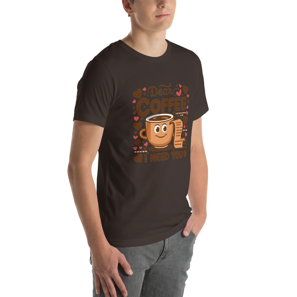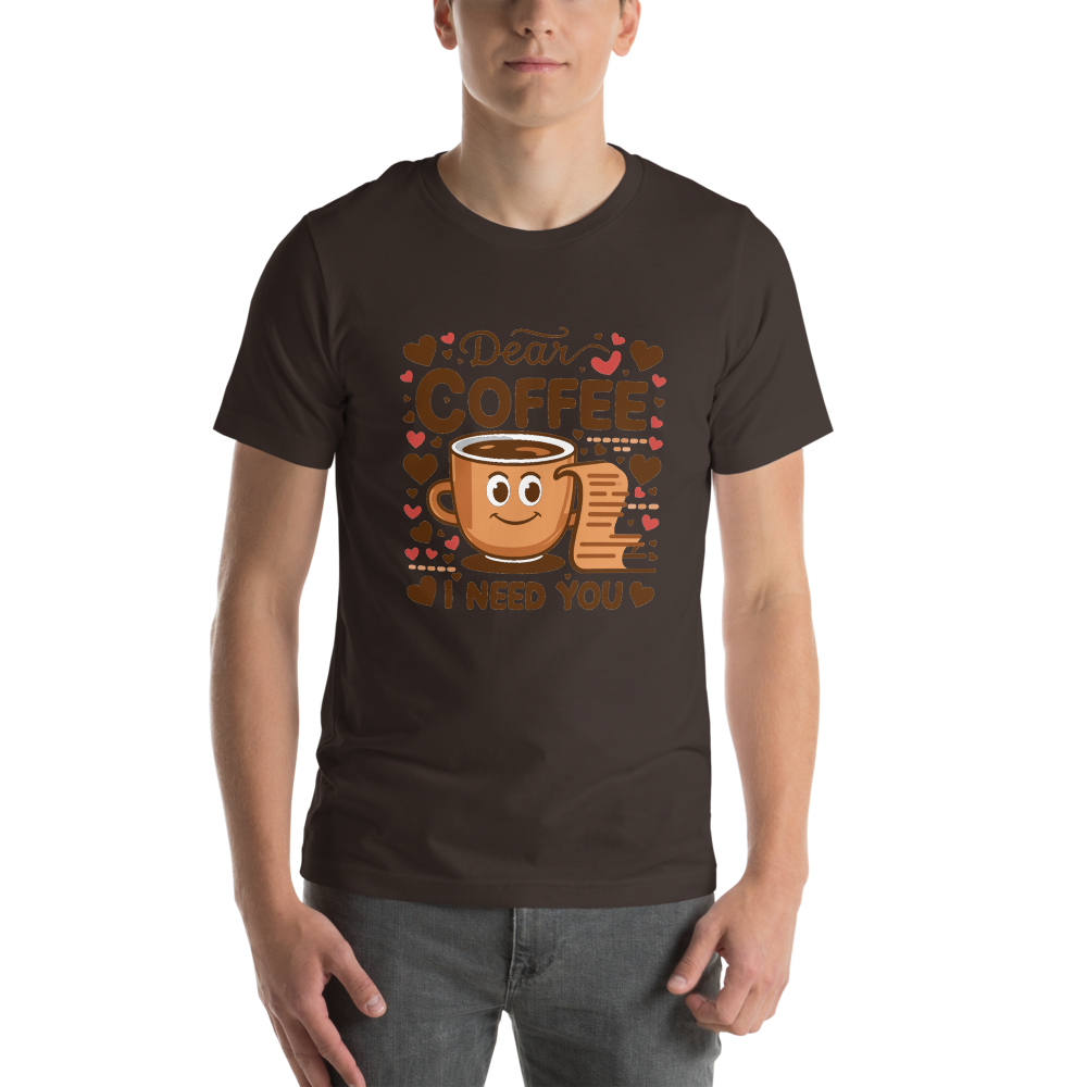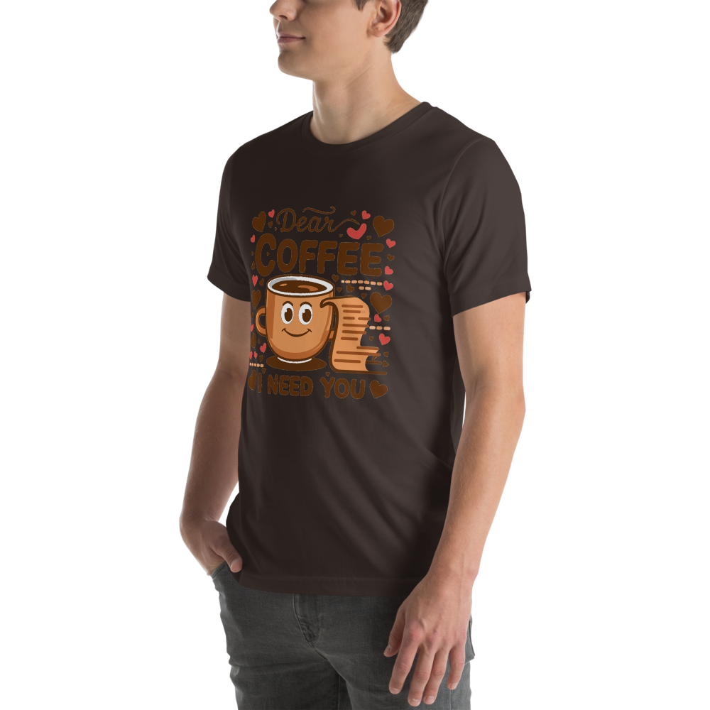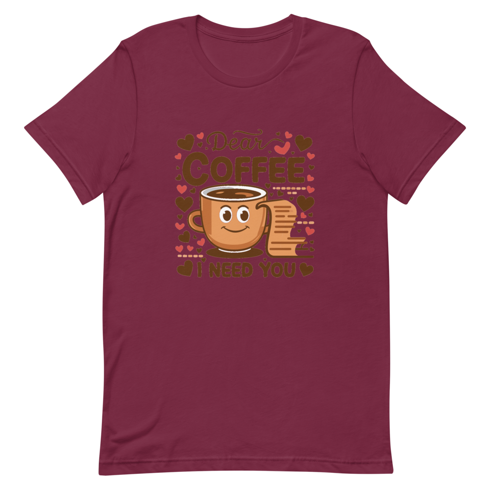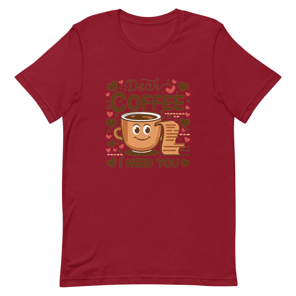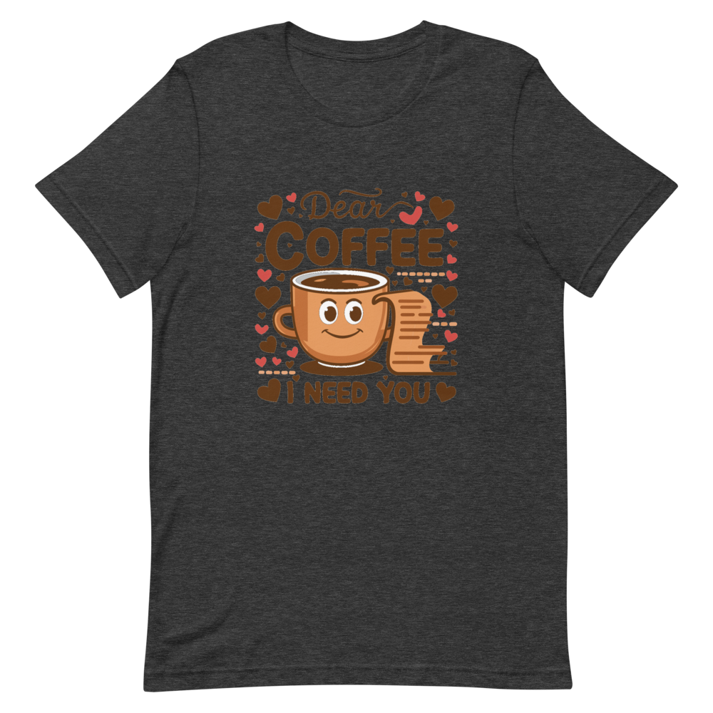 This fun t-shirt features a charming cartoon coffee cup next to an open letter, surrounded by cute heart icons. It’s perfect for coffee lovers and those who enjoy a bit of sketch comedy in their wardrobe.This t-shirt is everything you’ve dreamed of and more. It feels soft and lightweight, with the right amount of stretch. It’s comfortable and flattering for all. 100% combed and ring-spun cotton (Heather colors contain polyester) Fabric weight: 4.2 oz./yd.² (142 g/m²) Pre-shrunk fabric Side-seamed construction Shoulder-to-shoulder taping