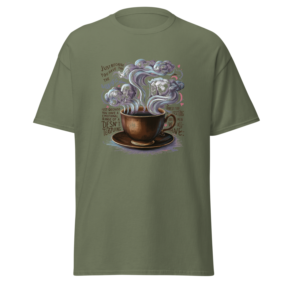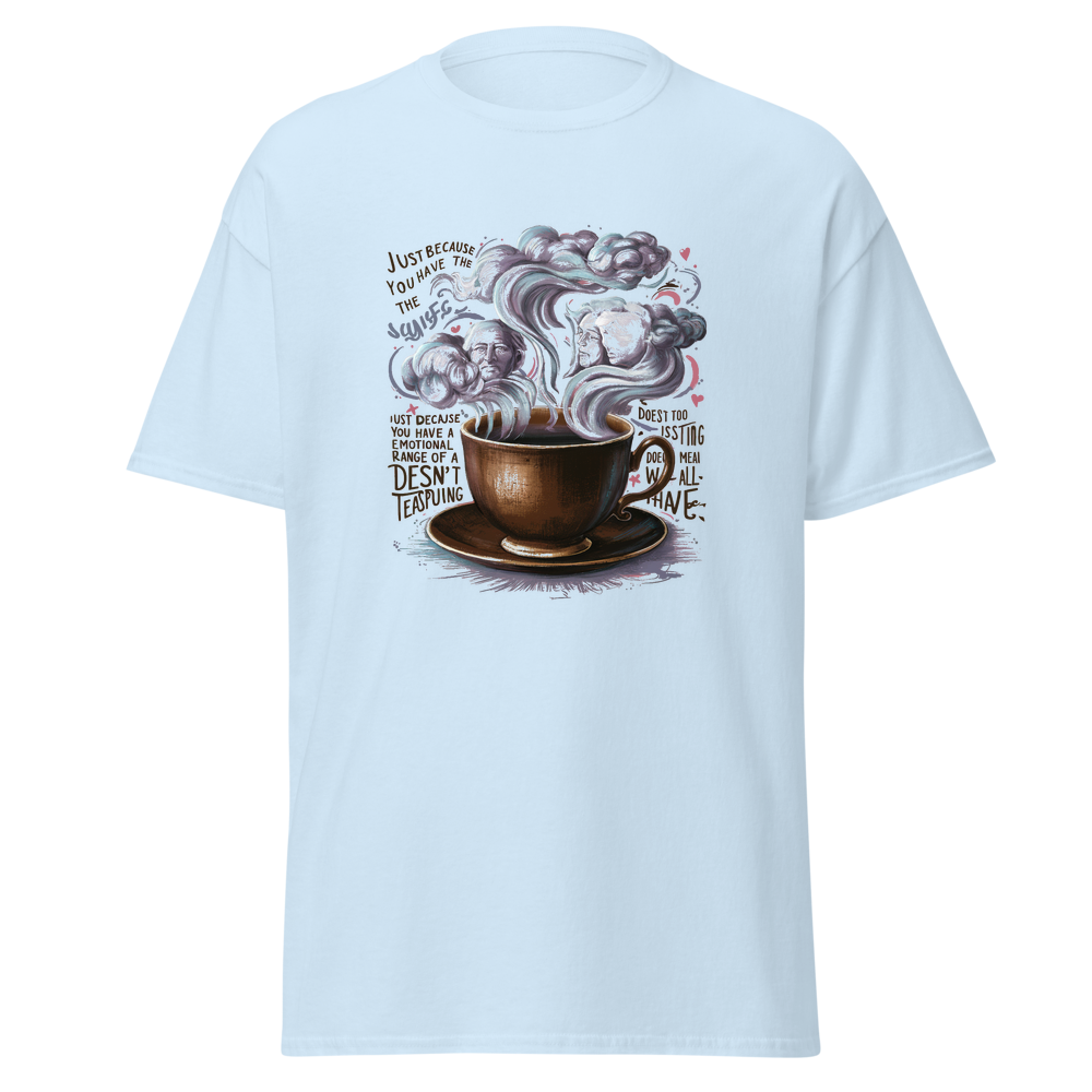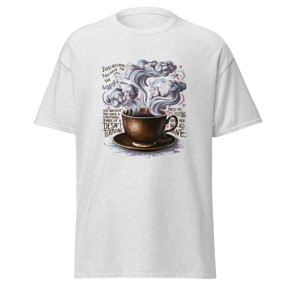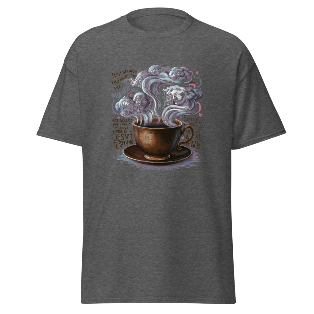 A charming old-fashioned teacup with swirling steam forming abstract clouds and thoughtful faces. Detailed vintage patterns surround the teacup, adding a touch of nostalgia and elegance. Perfect for fans of classic literature and a unique style.This t-shirt is everything you’ve dreamed of and more. It feels soft and lightweight, with the right amount of stretch. It’s comfortable and flattering for all. 100% combed and ring-spun cotton (Heather colors contain polyester) Fabric weight: 4.2 oz./yd.² (142 g/m²) Pre-shrunk fabric Side-seamed construction Shoulder-to-shoulder taping