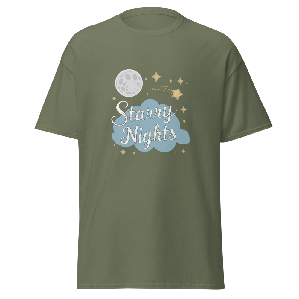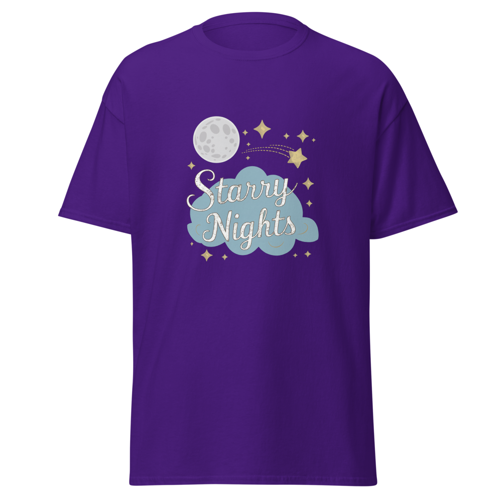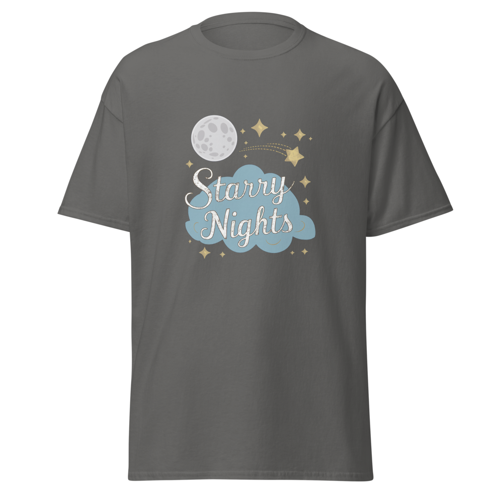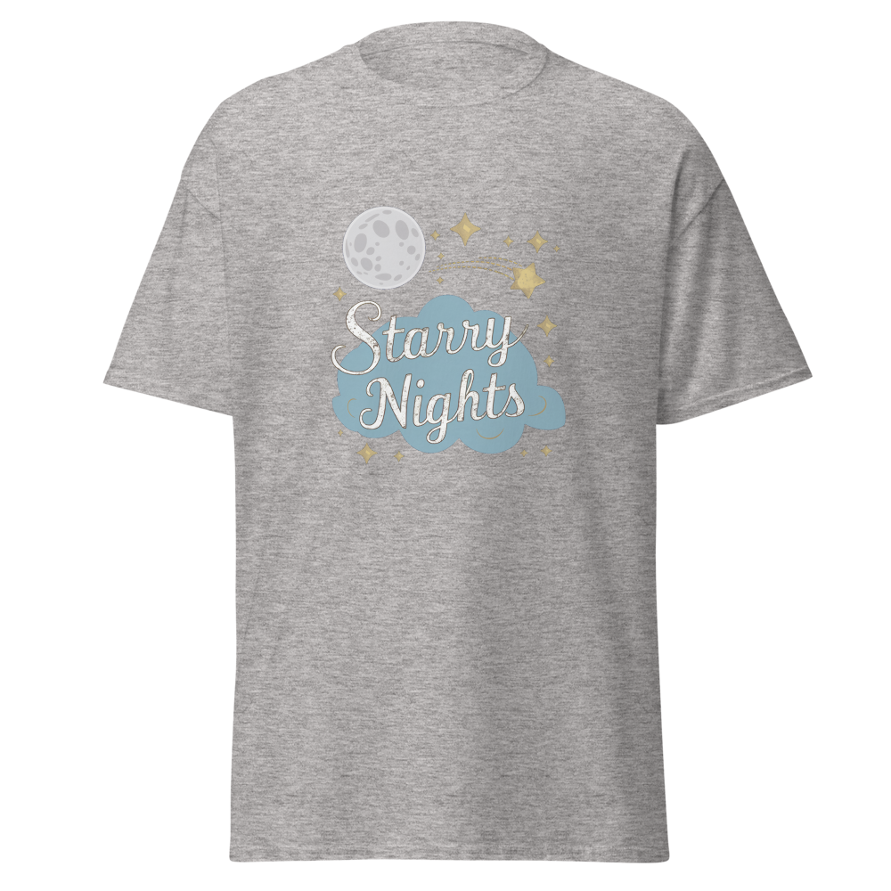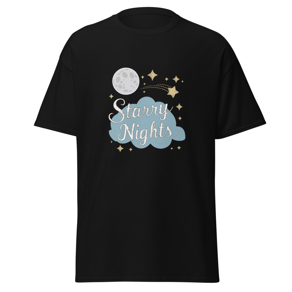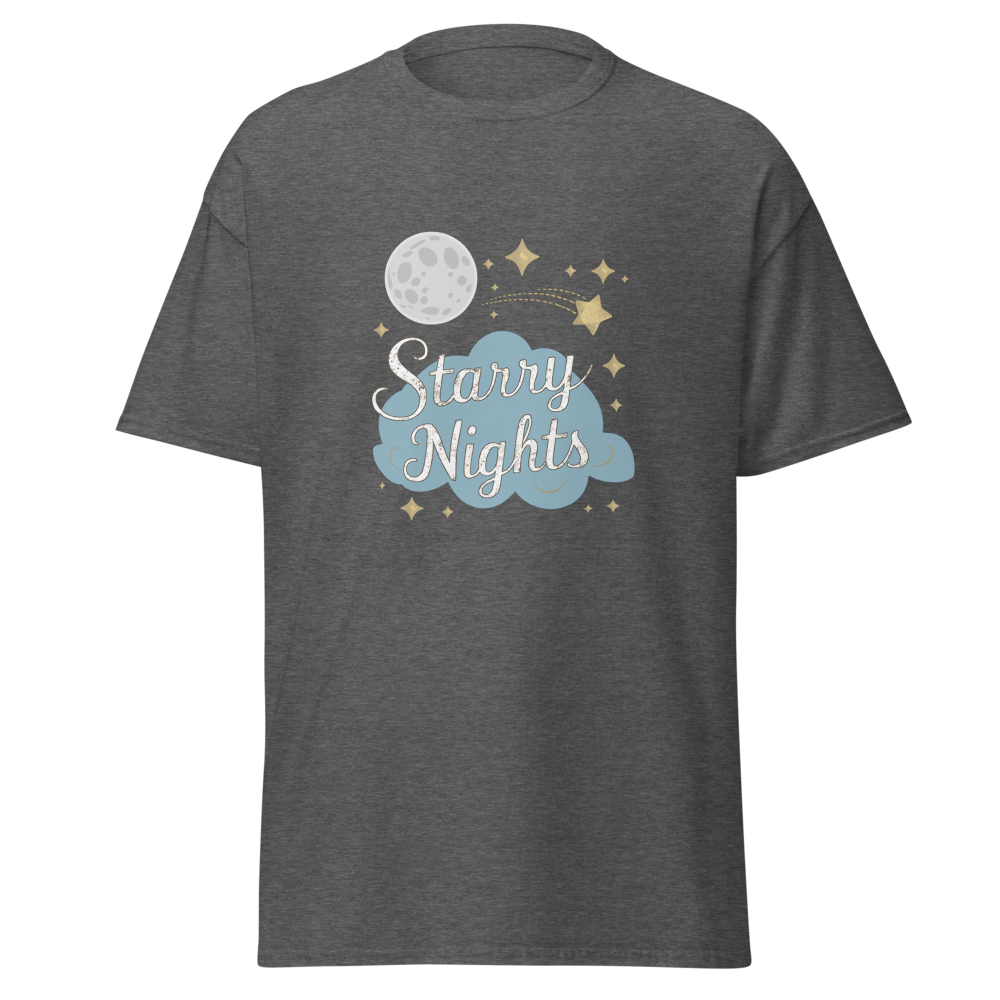 Immerse yourself in a whimsical night sky with enchanting moons, stars, and dreamy clouds. Perfect for those who cherish serene, starry nights.This t-shirt is everything you’ve dreamed of and more. It feels soft and lightweight, with the right amount of stretch. It’s comfortable and flattering for all. 100% combed and ring-spun cotton (Heather colors contain polyester) Fabric weight: 4.2 oz./yd.² (142 g/m²) Pre-shrunk fabric Side-seamed construction Shoulder-to-shoulder taping