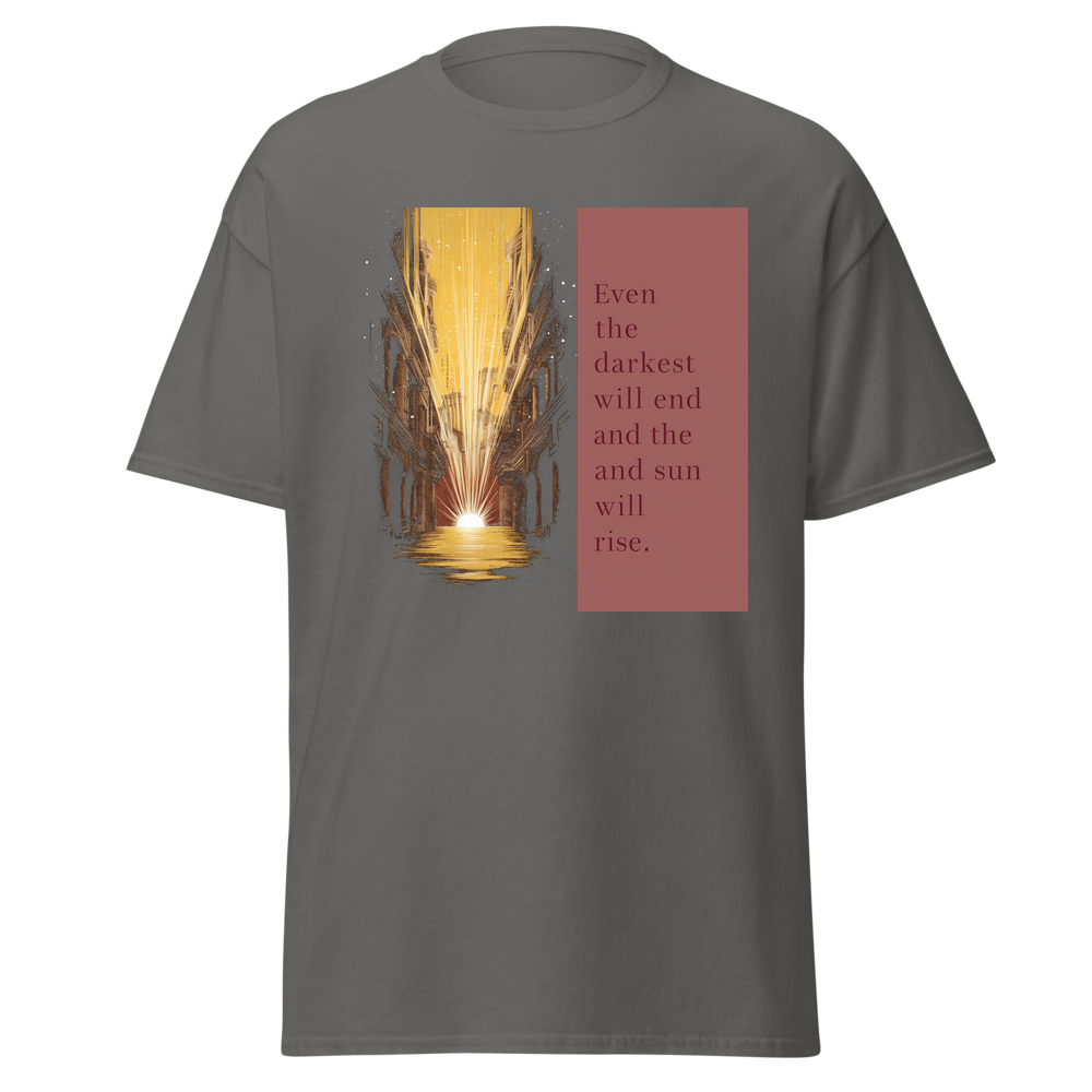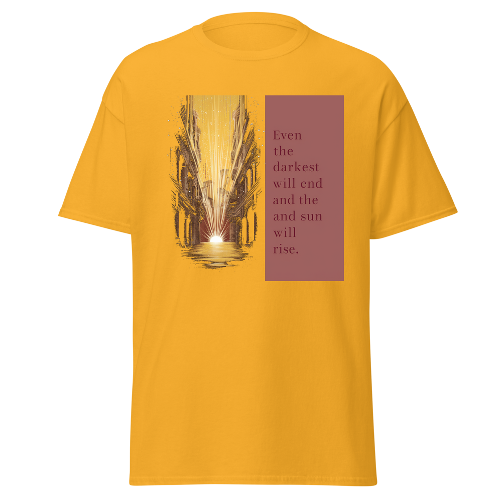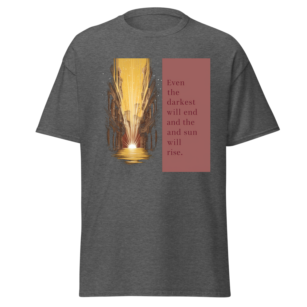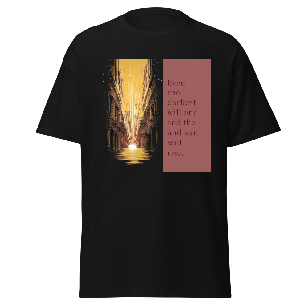 An intricate sunrise over an antique cityscape with radiant, swirling beams of light illuminating scattered, small stars. Perfect for those who seek beauty and inspiration in everyday moments.This t-shirt is everything you’ve dreamed of and more. It feels soft and lightweight, with the right amount of stretch. It’s comfortable and flattering for all. 100% combed and ring-spun cotton (Heather colors contain polyester) Fabric weight: 4.2 oz./yd.² (142 g/m²) Pre-shrunk fabric Side-seamed construction Shoulder-to-shoulder taping