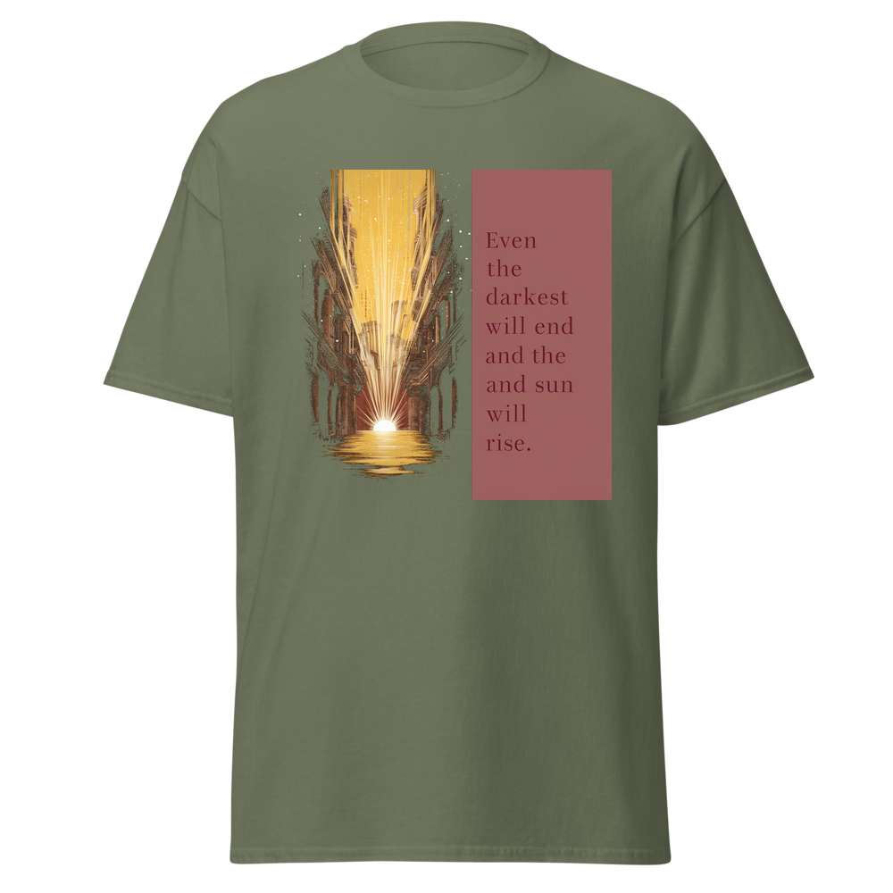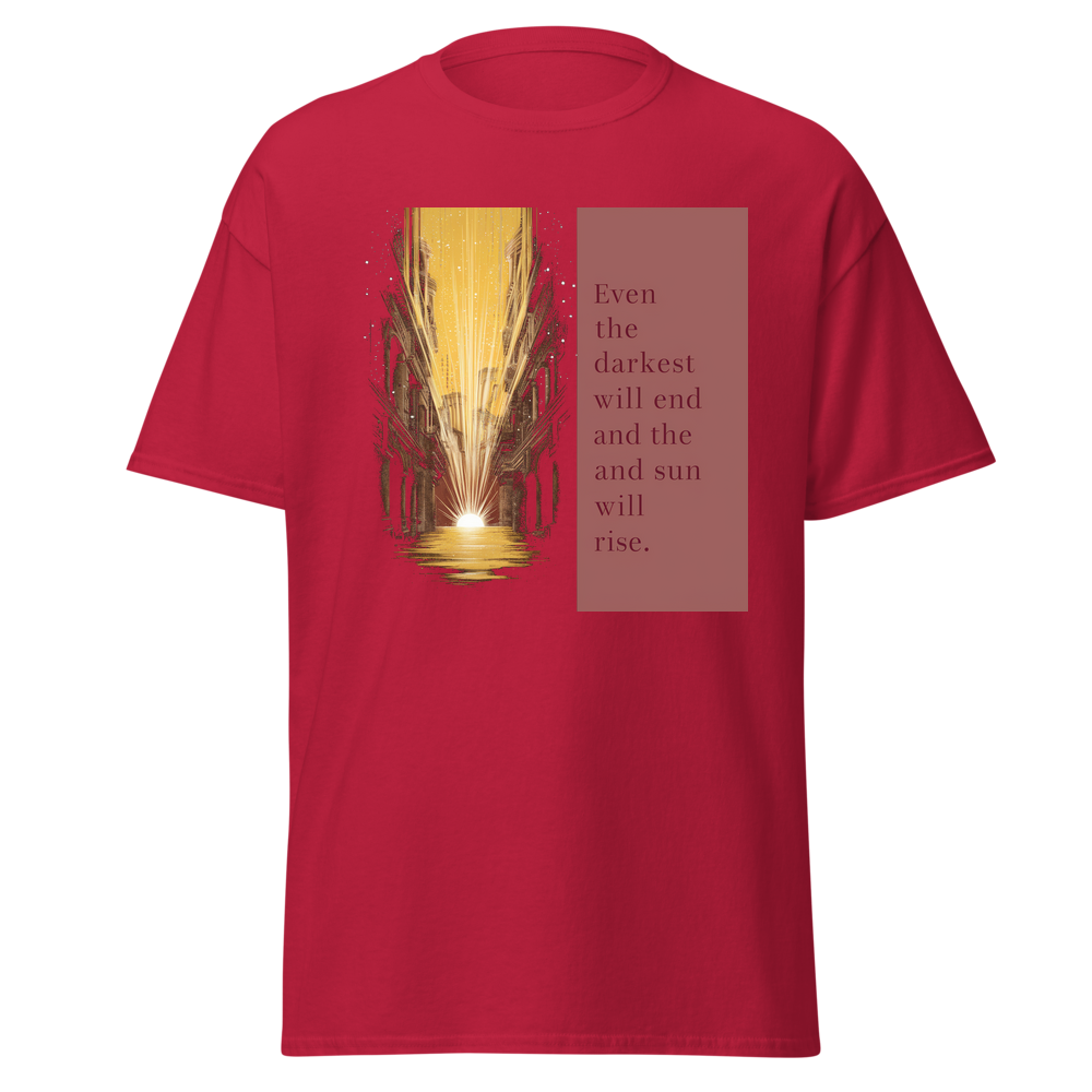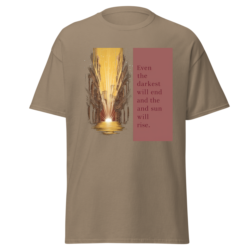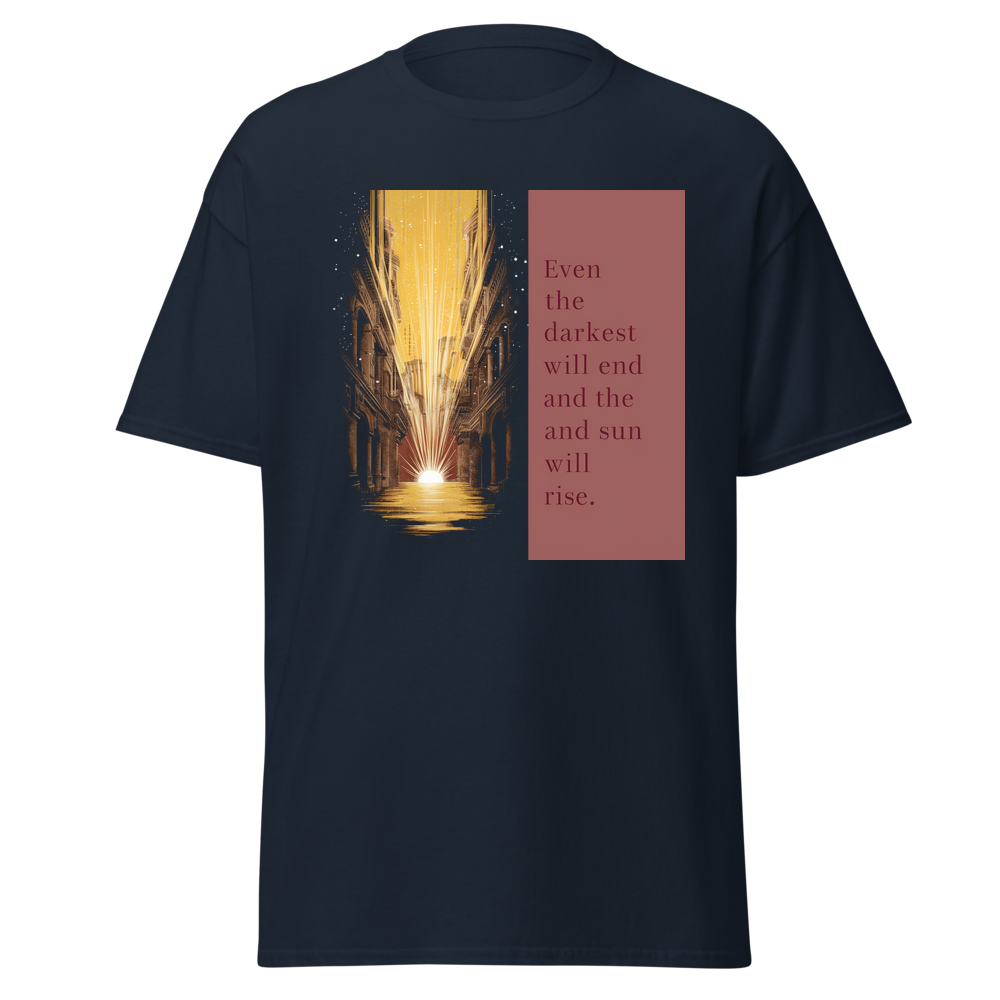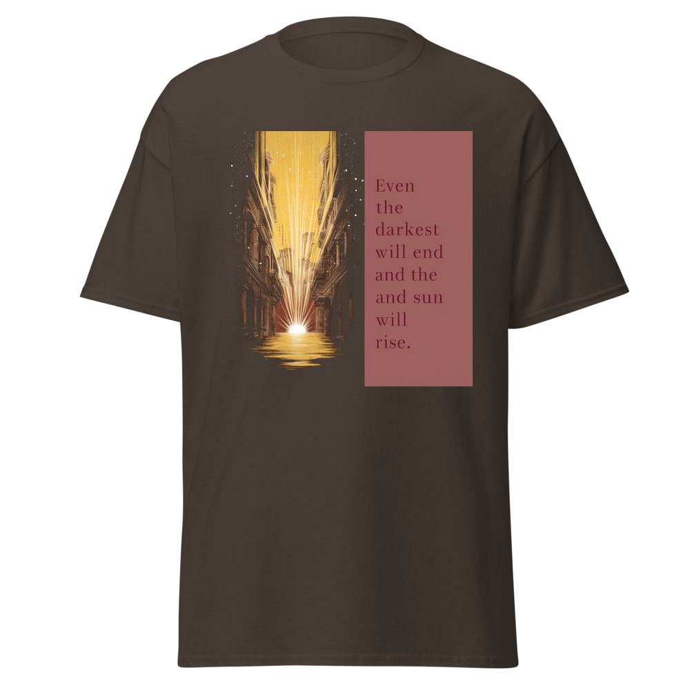 An intricate sunrise over an antique cityscape with radiant, swirling beams of light illuminating scattered, small stars. Perfect for those who seek beauty and inspiration in everyday moments.This t-shirt is everything you’ve dreamed of and more. It feels soft and lightweight, with the right amount of stretch. It’s comfortable and flattering for all. 100% combed and ring-spun cotton (Heather colors contain polyester) Fabric weight: 4.2 oz./yd.² (142 g/m²) Pre-shrunk fabric Side-seamed construction Shoulder-to-shoulder taping