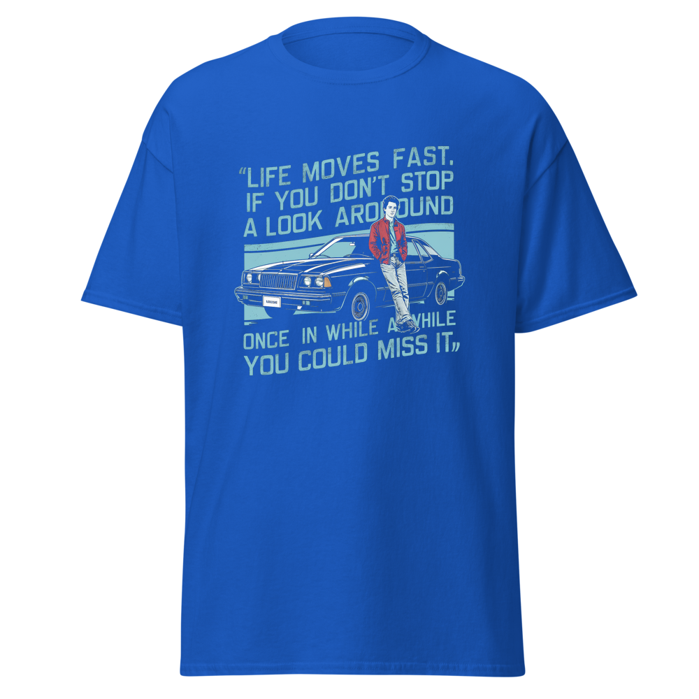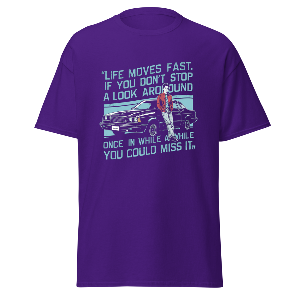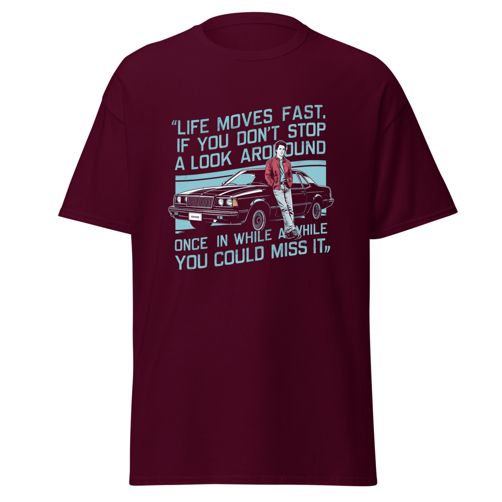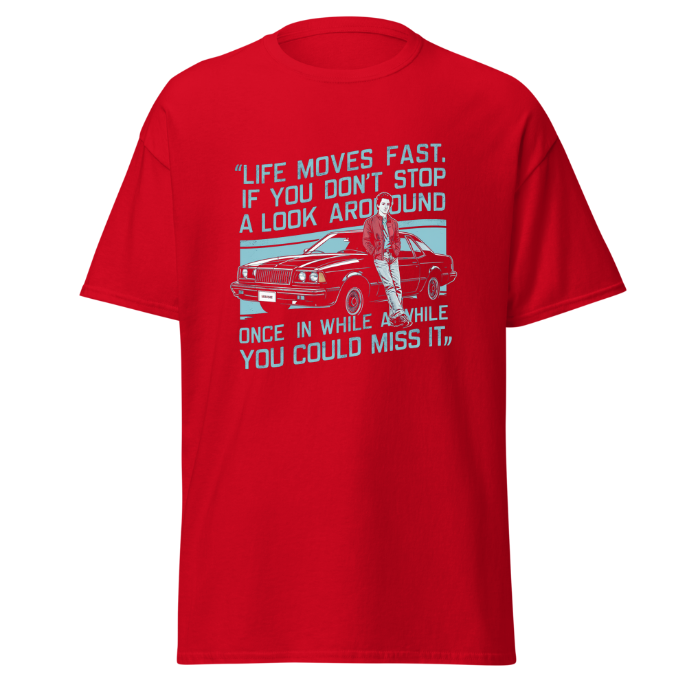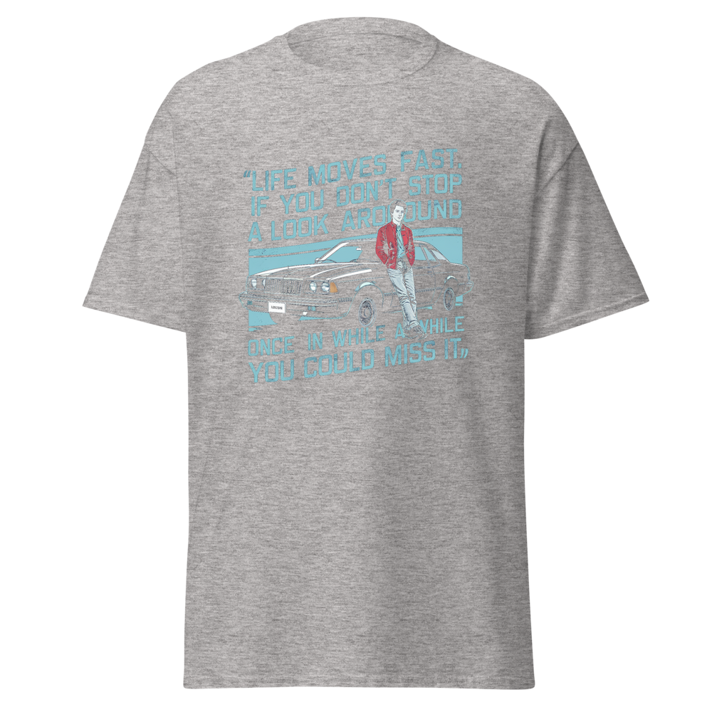A cool 80s car with Ferris Bueller leaning casually against it. Perfect for fans of classic movies, this design captures the carefree spirit of an iconic film.This t-shirt is everything you’ve dreamed of and more. It feels soft and lightweight, with the right amount of stretch. It’s comfortable and flattering for all. 100% combed and ring-spun cotton (Heather colors contain polyester) Fabric weight: 4.2 oz./yd.² (142 g/m²) Pre-shrunk fabric Side-seamed construction Shoulder-to-shoulder taping