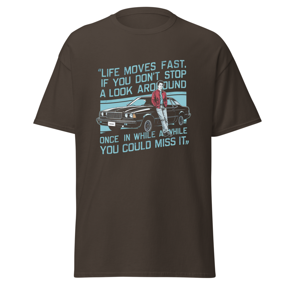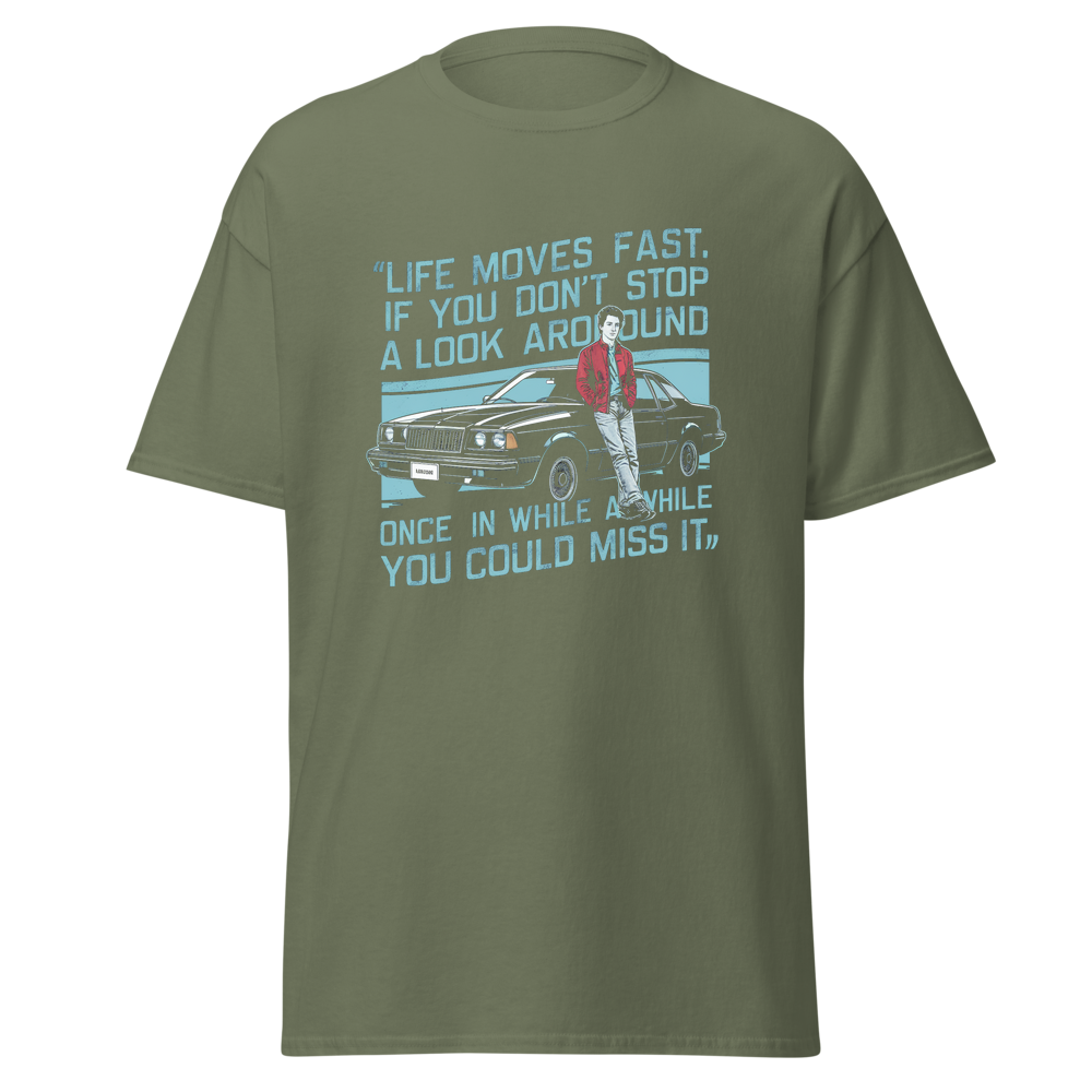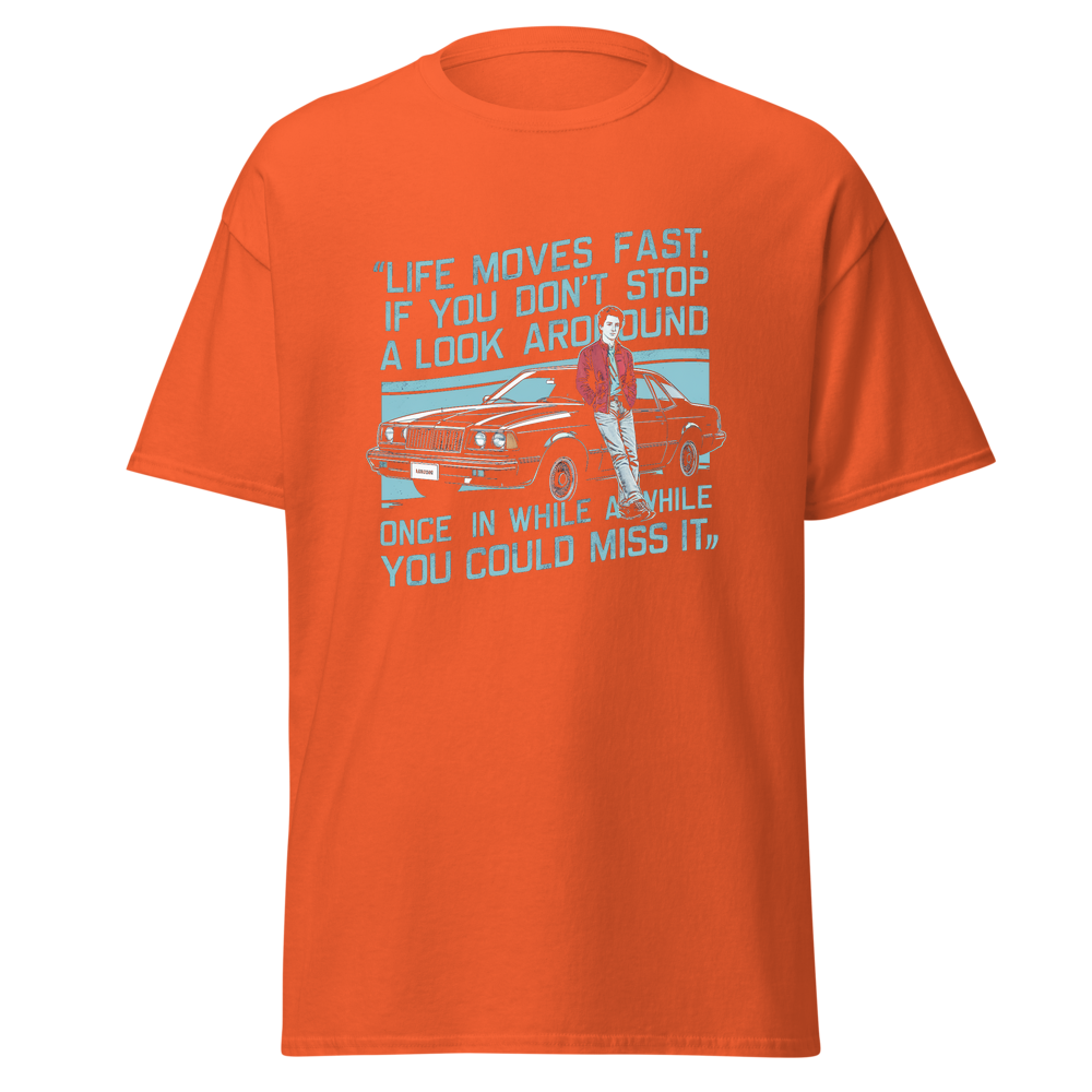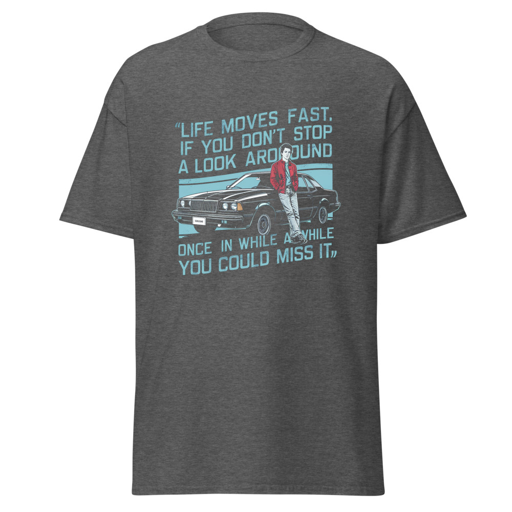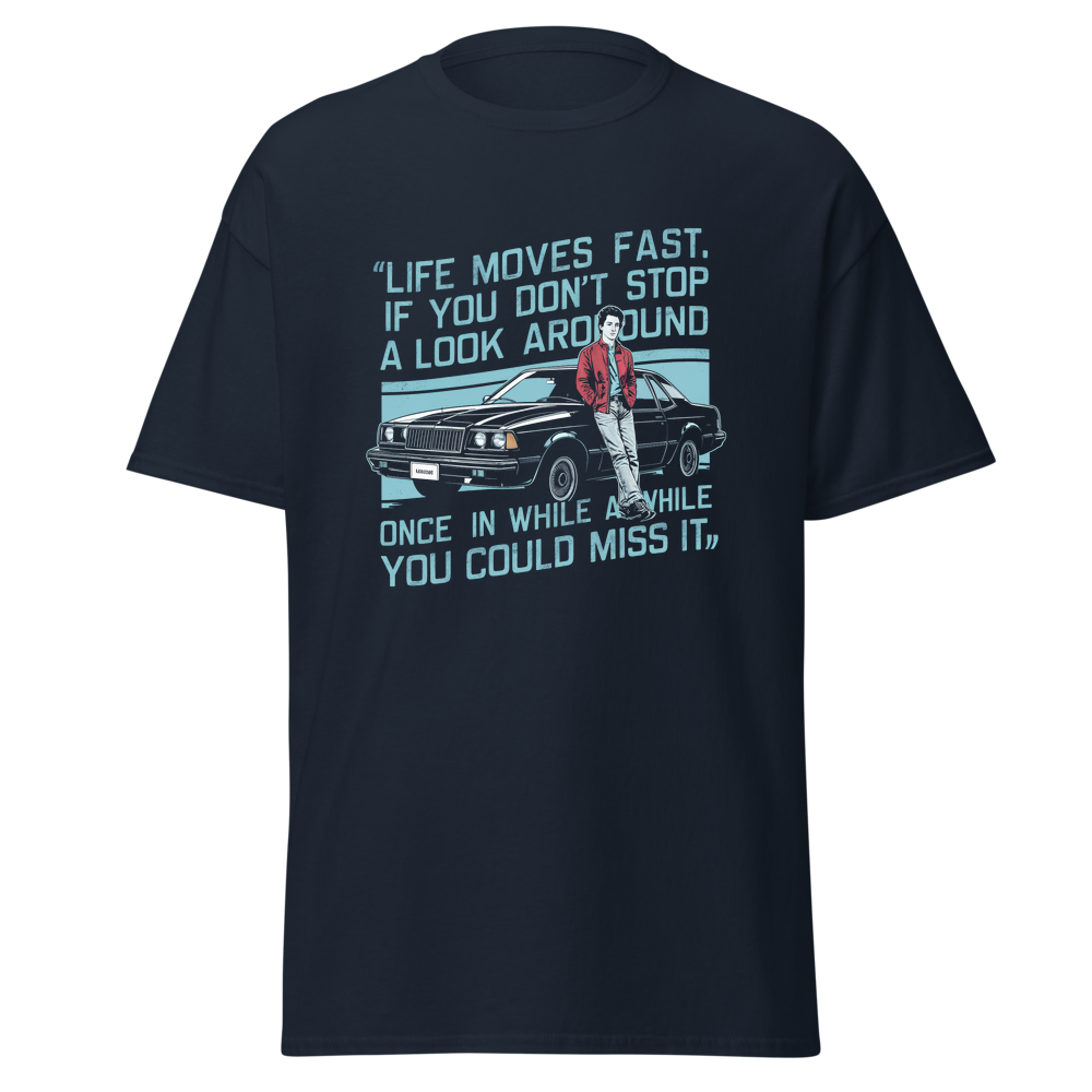 A cool 80s car with Ferris Bueller leaning casually against it. Perfect for fans of classic movies, this design captures the carefree spirit of an iconic film.This t-shirt is everything you’ve dreamed of and more. It feels soft and lightweight, with the right amount of stretch. It’s comfortable and flattering for all. 100% combed and ring-spun cotton (Heather colors contain polyester) Fabric weight: 4.2 oz./yd.² (142 g/m²) Pre-shrunk fabric Side-seamed construction Shoulder-to-shoulder taping