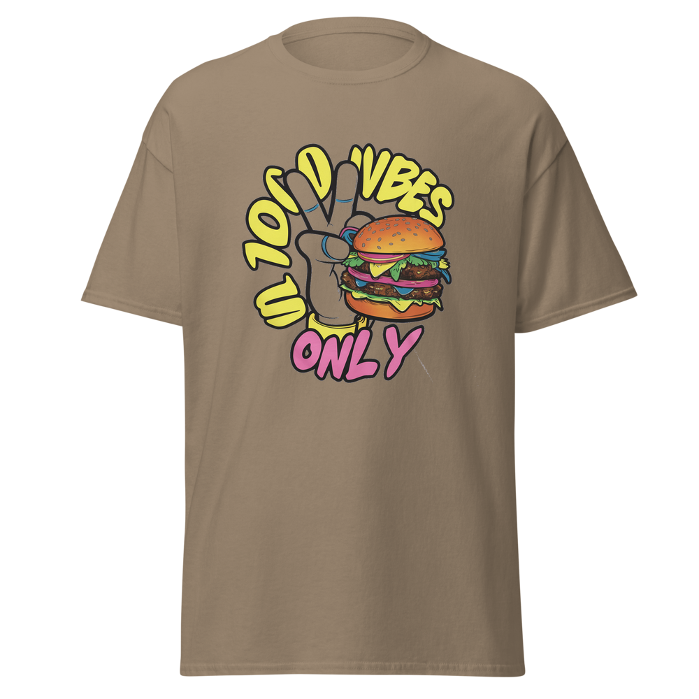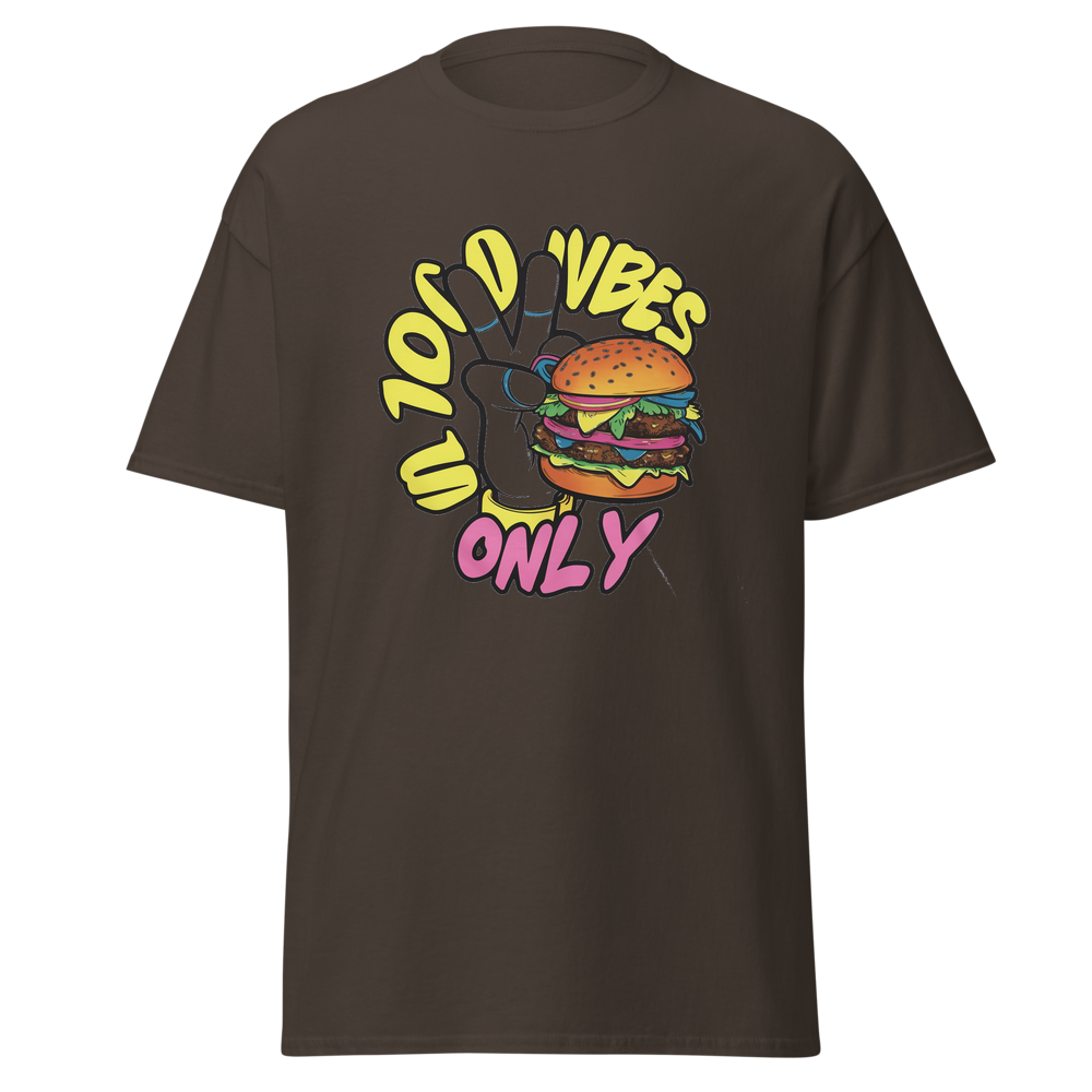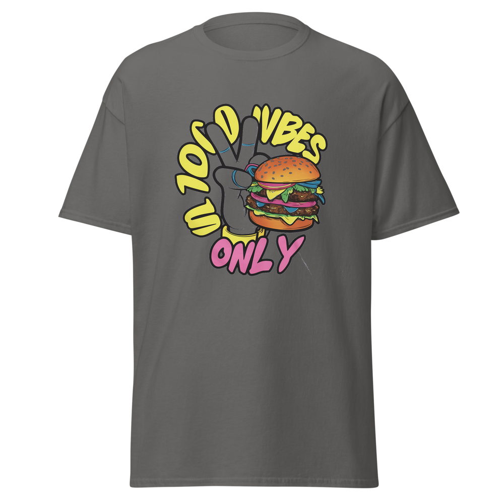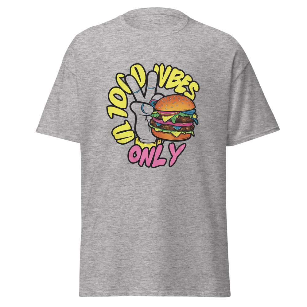 Embrace the fun, nostalgic vibe of the 90s with this playful tee featuring a cartoon peace sign hand holding a juicy burger, surrounded by classic neon patterns. Perfect for foodies and anyone who loves retro style!This t-shirt is everything you’ve dreamed of and more. It feels soft and lightweight, with the right amount of stretch. It’s comfortable and flattering for all. 100% combed and ring-spun cotton (Heather colors contain polyester) Fabric weight: 4.2 oz./yd.² (142 g/m²) Pre-shrunk fabric Side-seamed construction Shoulder-to-shoulder taping