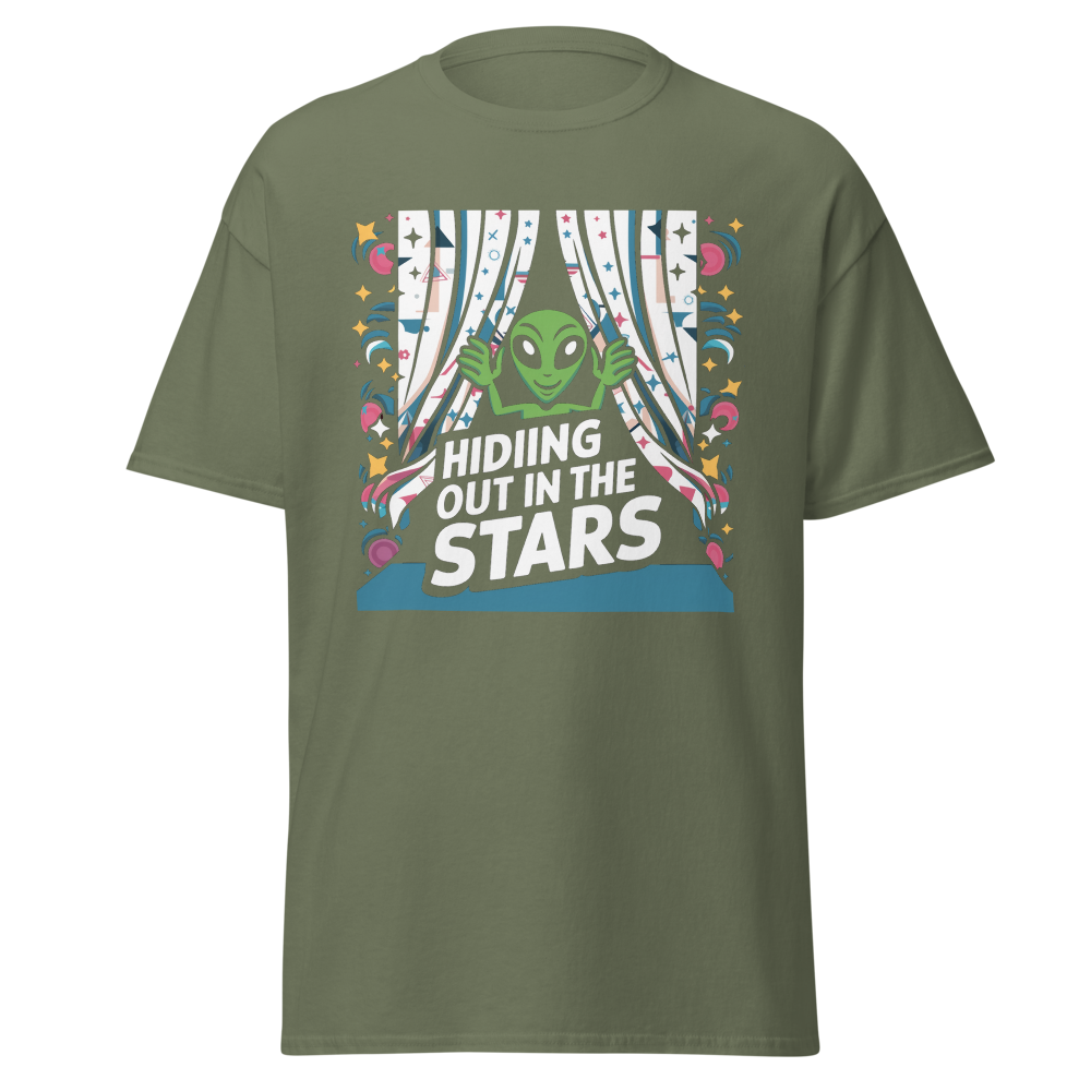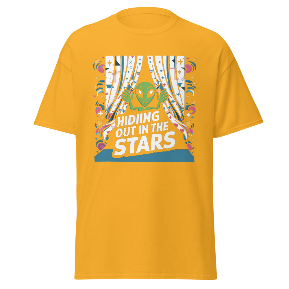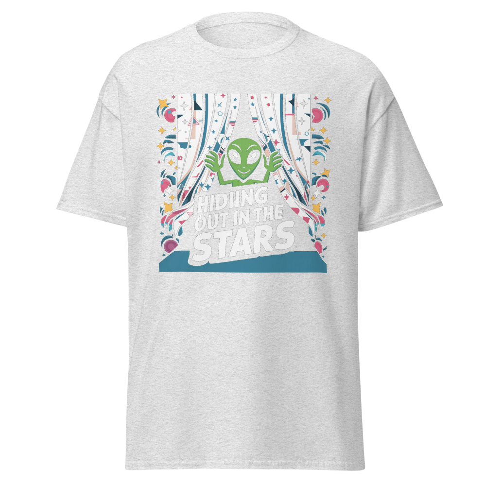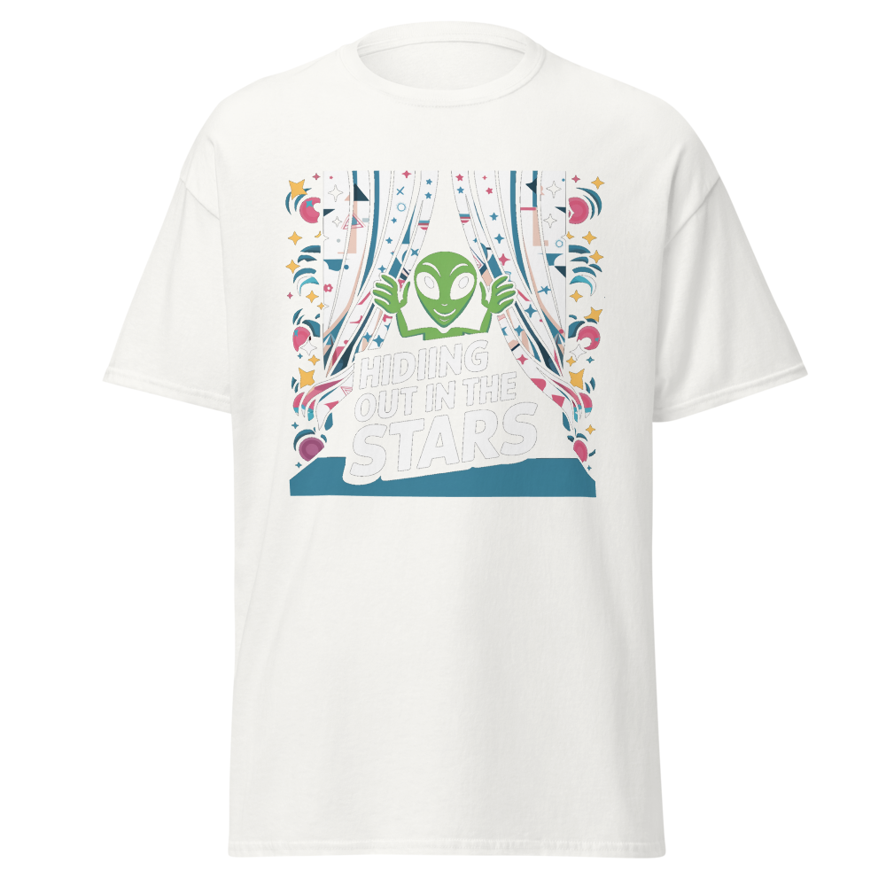 A playful pop-art alien peeks through a starry curtain, surrounded by bold geometric patterns. Perfect for young adults and sci-fi fans looking to add a cosmic touch to their wardrobe.This t-shirt is everything you’ve dreamed of and more. It feels soft and lightweight, with the right amount of stretch. It’s comfortable and flattering for all. 100% combed and ring-spun cotton (Heather colors contain polyester) Fabric weight: 4.2 oz./yd.² (142 g/m²) Pre-shrunk fabric Side-seamed construction Shoulder-to-shoulder taping