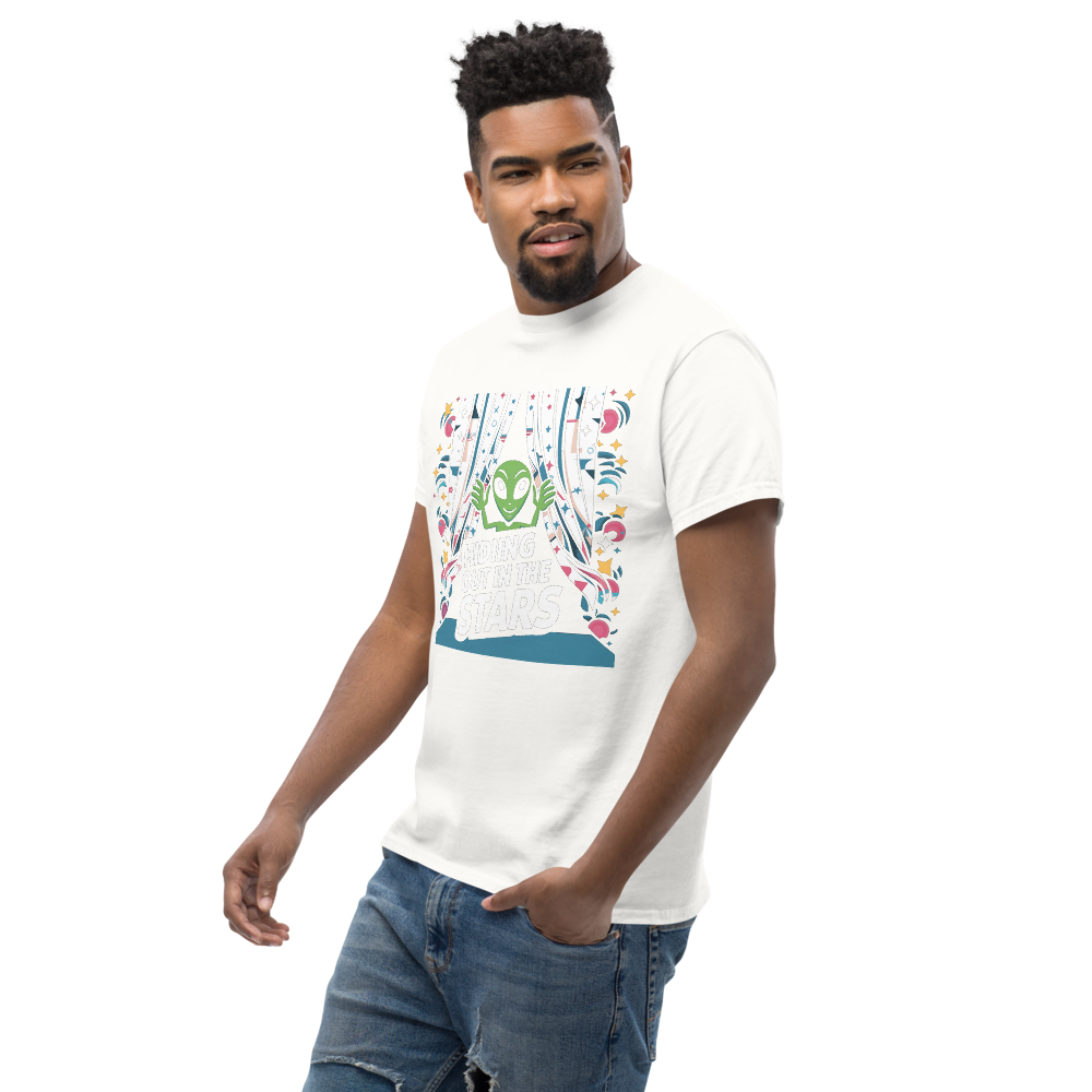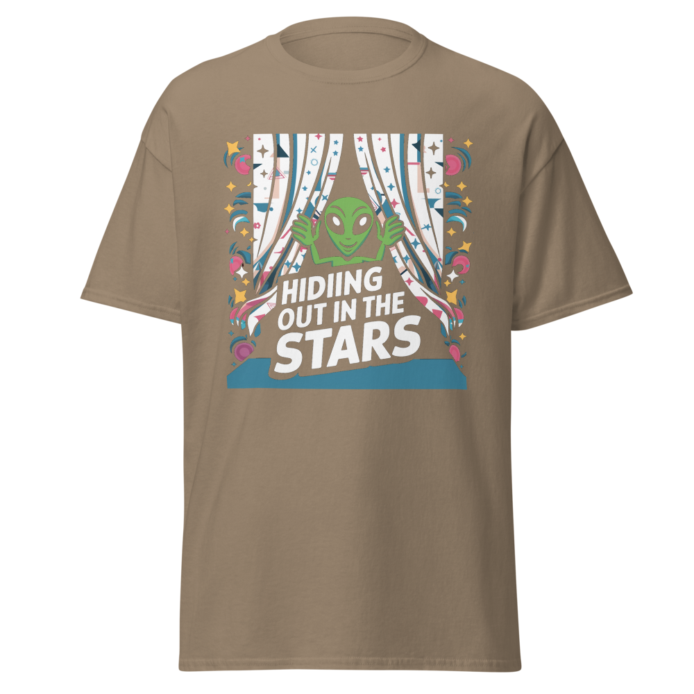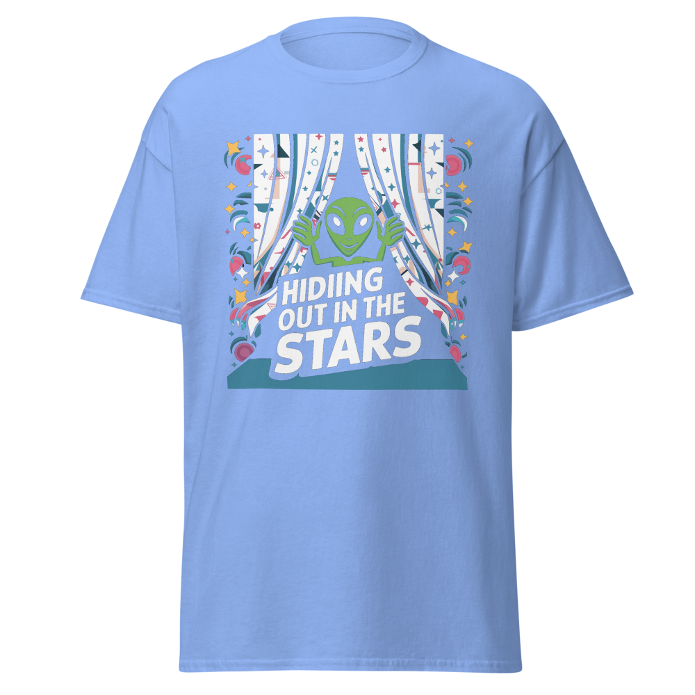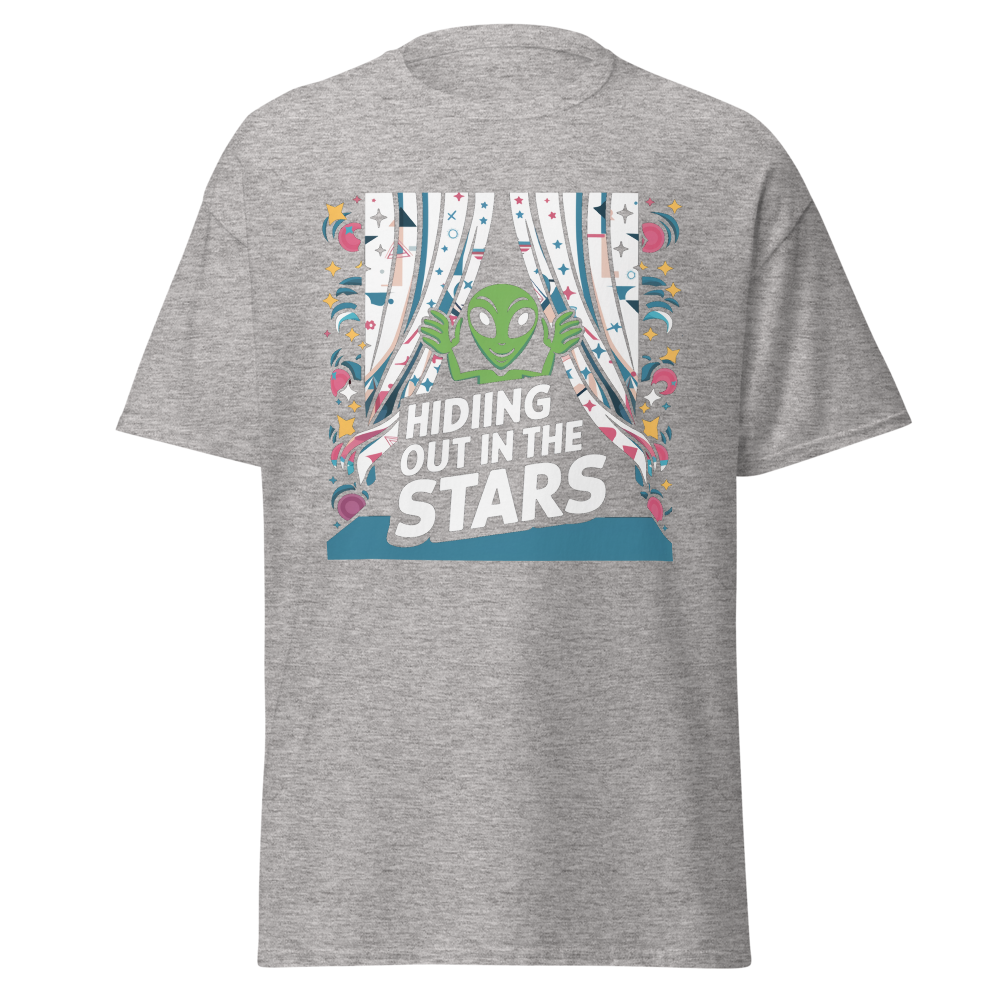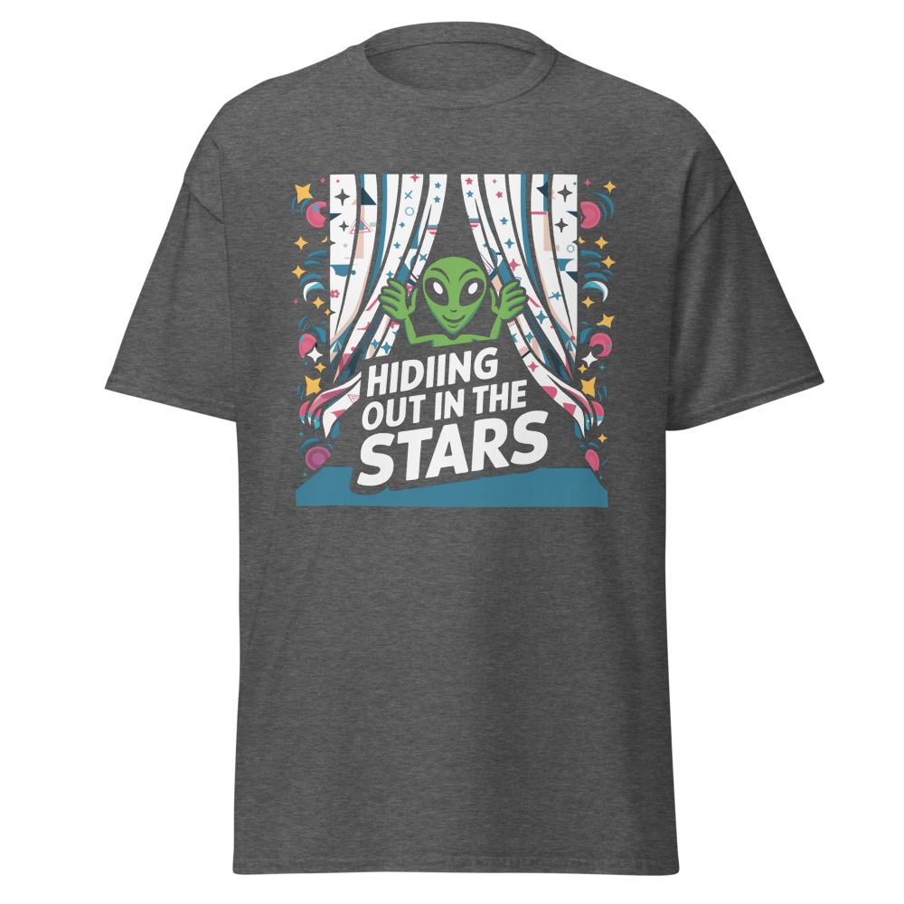 A playful pop-art alien peeks through a starry curtain, surrounded by bold geometric patterns. Perfect for young adults and sci-fi fans looking to add a cosmic touch to their wardrobe.This t-shirt is everything you’ve dreamed of and more. It feels soft and lightweight, with the right amount of stretch. It’s comfortable and flattering for all. 100% combed and ring-spun cotton (Heather colors contain polyester) Fabric weight: 4.2 oz./yd.² (142 g/m²) Pre-shrunk fabric Side-seamed construction Shoulder-to-shoulder taping