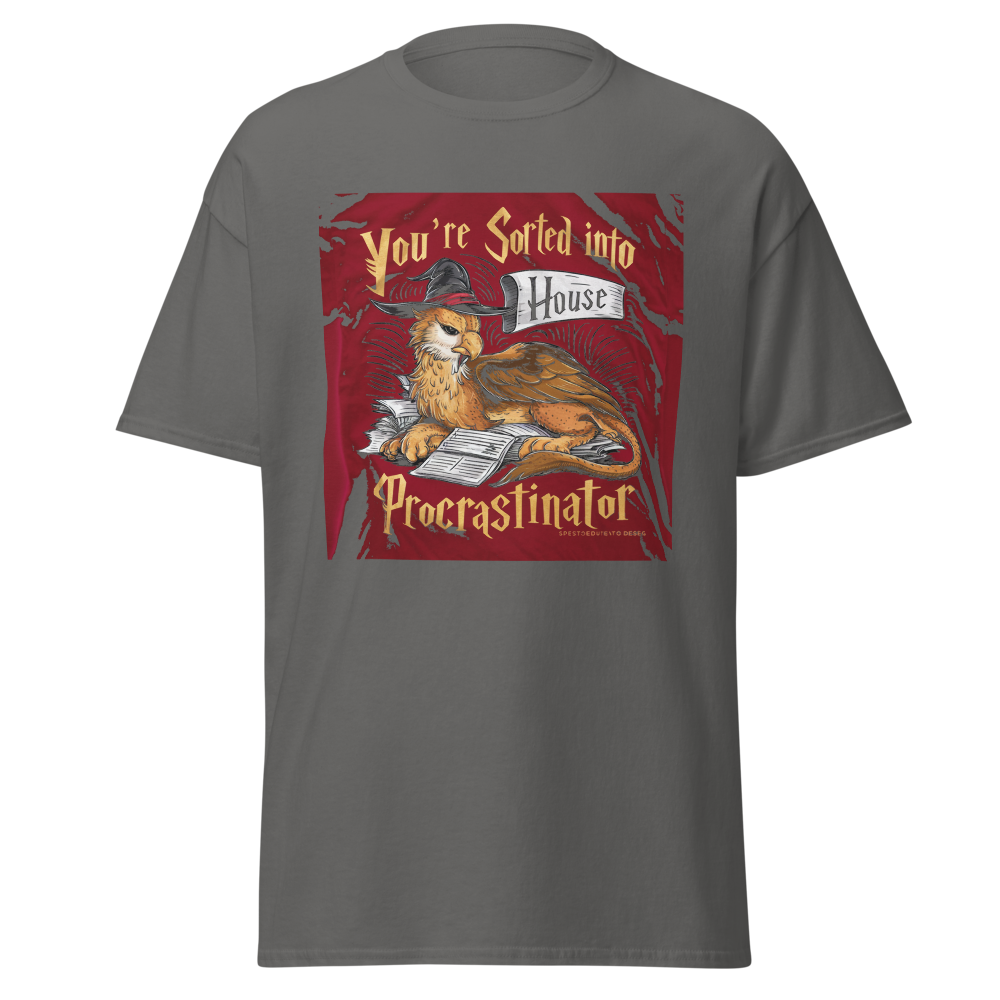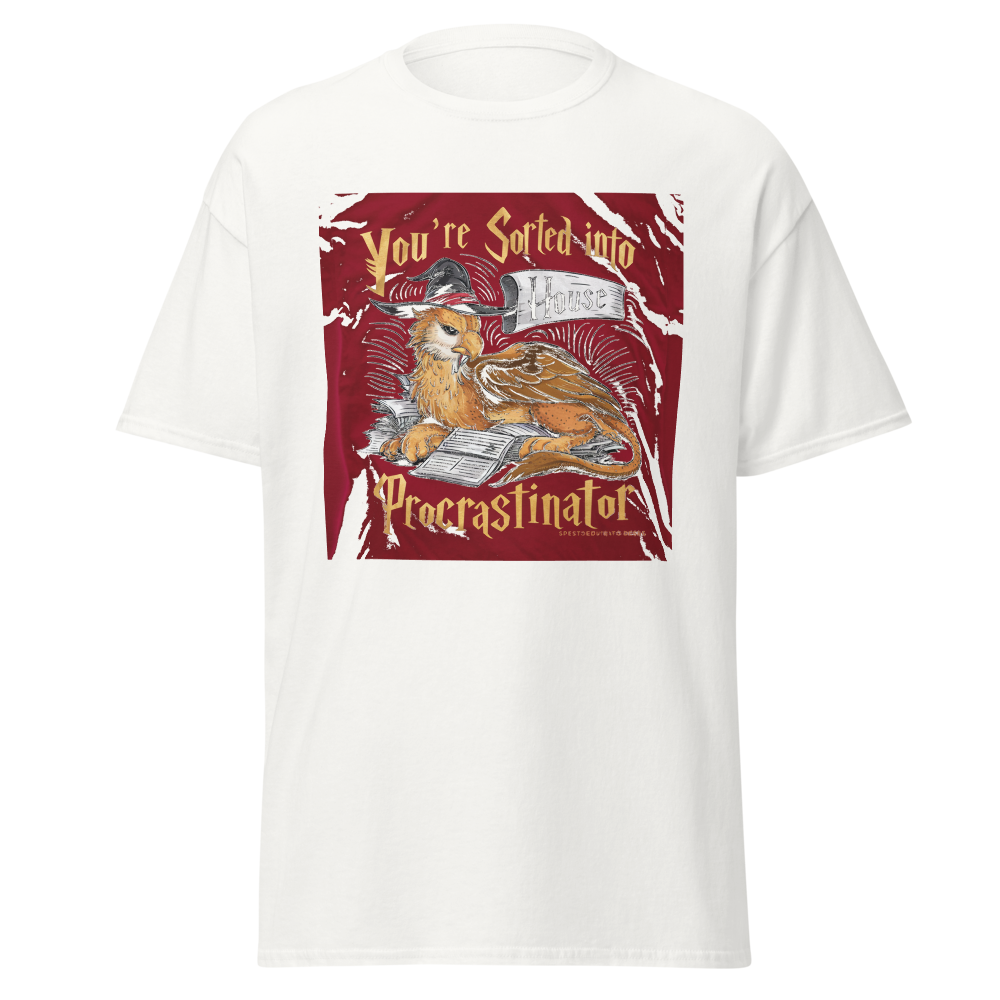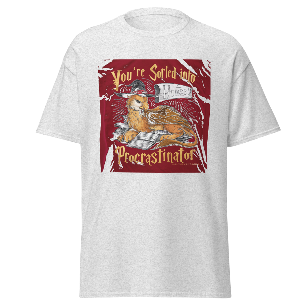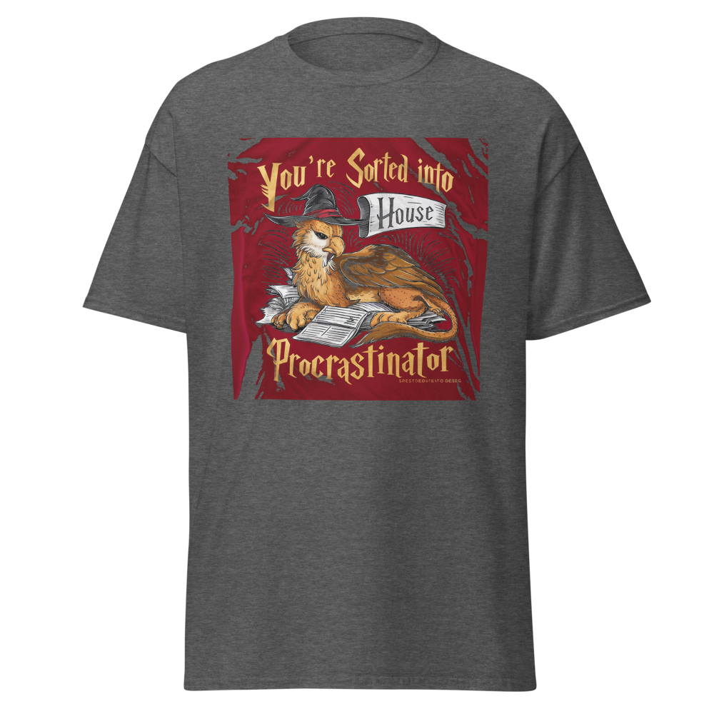 A laid-back griffin relaxes with a sorting hat, surrounded by a playful stack of unfinished homework. Perfect for fantasy fans and procrastinators alike, this design captures a magical twist on student life.This t-shirt is everything you’ve dreamed of and more. It feels soft and lightweight, with the right amount of stretch. It’s comfortable and flattering for all. 100% combed and ring-spun cotton (Heather colors contain polyester) Fabric weight: 4.2 oz./yd.² (142 g/m²) Pre-shrunk fabric Side-seamed construction Shoulder-to-shoulder taping