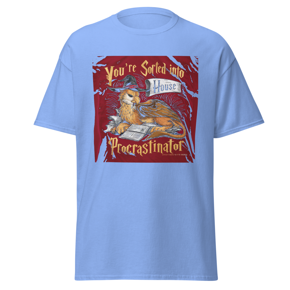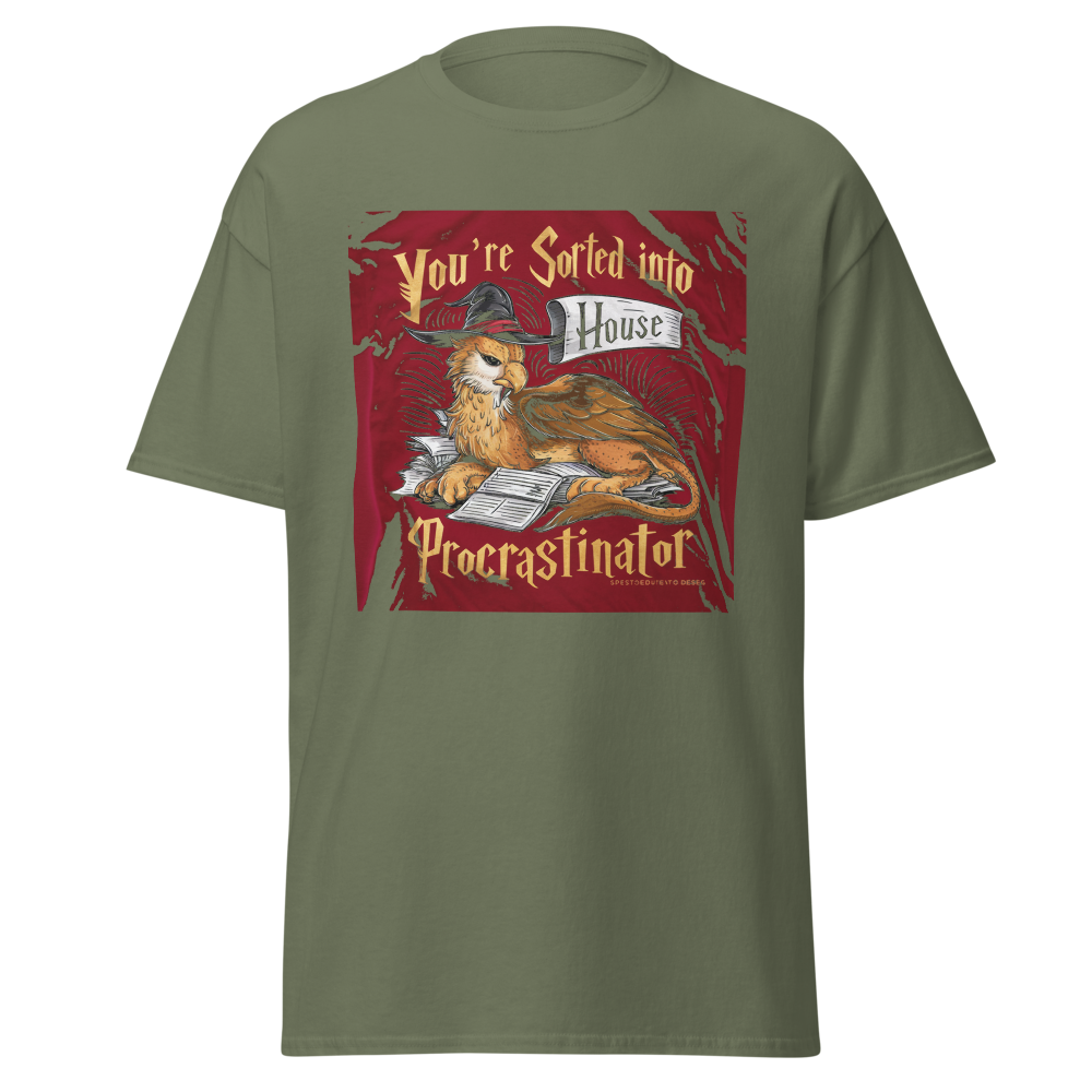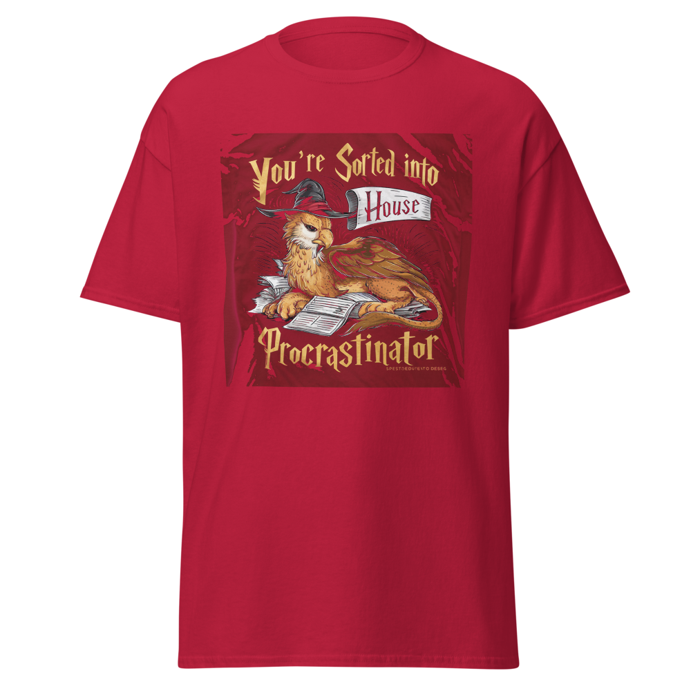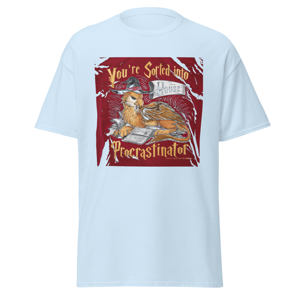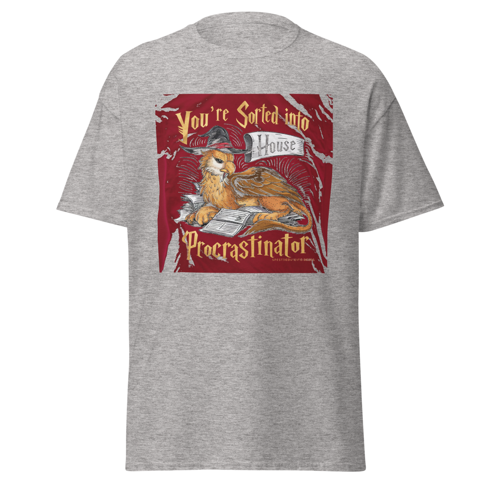 A laid-back griffin relaxes with a sorting hat, surrounded by a playful stack of unfinished homework. Perfect for fantasy fans and procrastinators alike, this design captures a magical twist on student life.This t-shirt is everything you’ve dreamed of and more. It feels soft and lightweight, with the right amount of stretch. It’s comfortable and flattering for all. 100% combed and ring-spun cotton (Heather colors contain polyester) Fabric weight: 4.2 oz./yd.² (142 g/m²) Pre-shrunk fabric Side-seamed construction Shoulder-to-shoulder taping