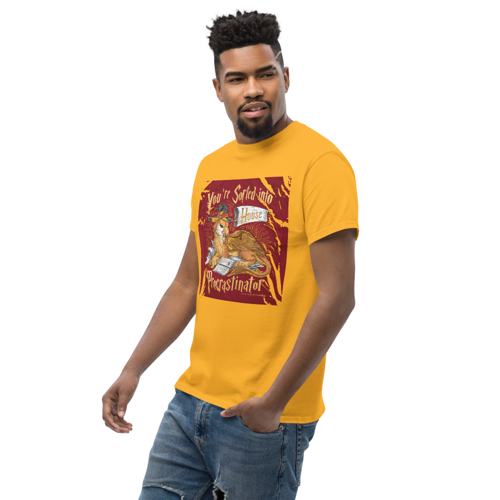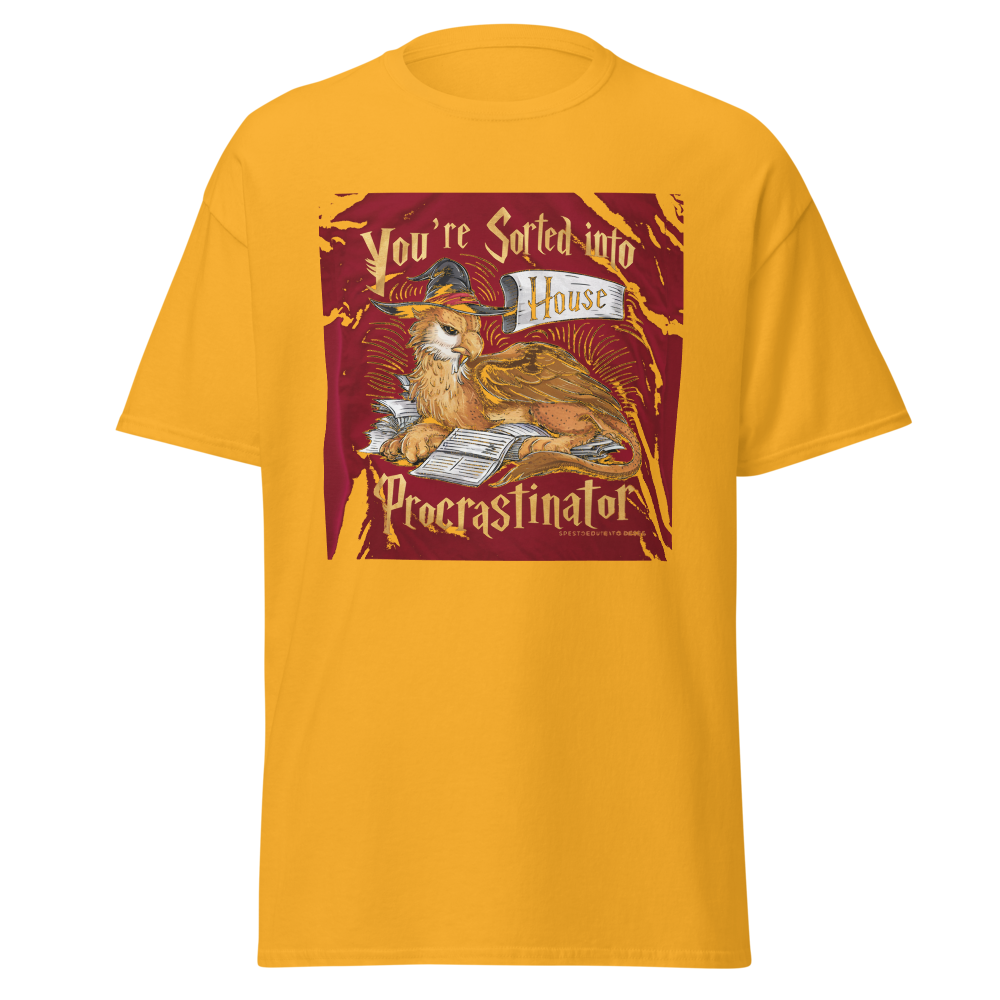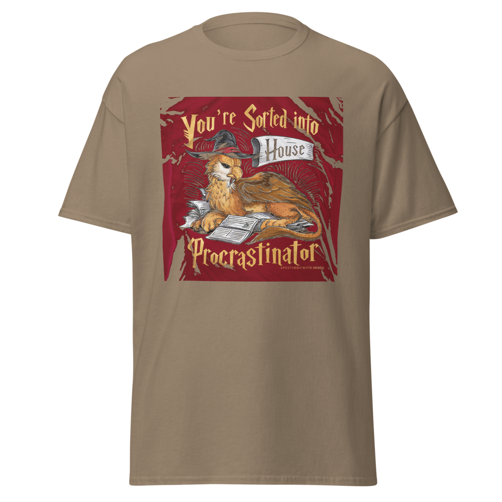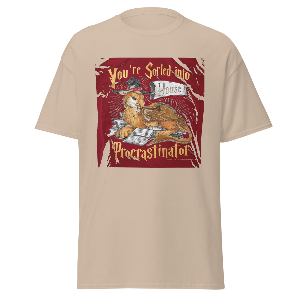 A laid-back griffin relaxes with a sorting hat, surrounded by a playful stack of unfinished homework. Perfect for fantasy fans and procrastinators alike, this design captures a magical twist on student life.This t-shirt is everything you’ve dreamed of and more. It feels soft and lightweight, with the right amount of stretch. It’s comfortable and flattering for all. 100% combed and ring-spun cotton (Heather colors contain polyester) Fabric weight: 4.2 oz./yd.² (142 g/m²) Pre-shrunk fabric Side-seamed construction Shoulder-to-shoulder taping