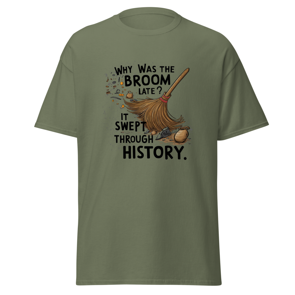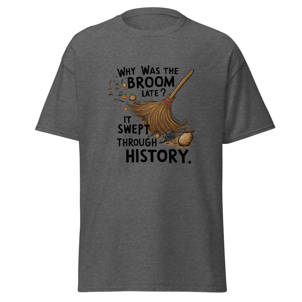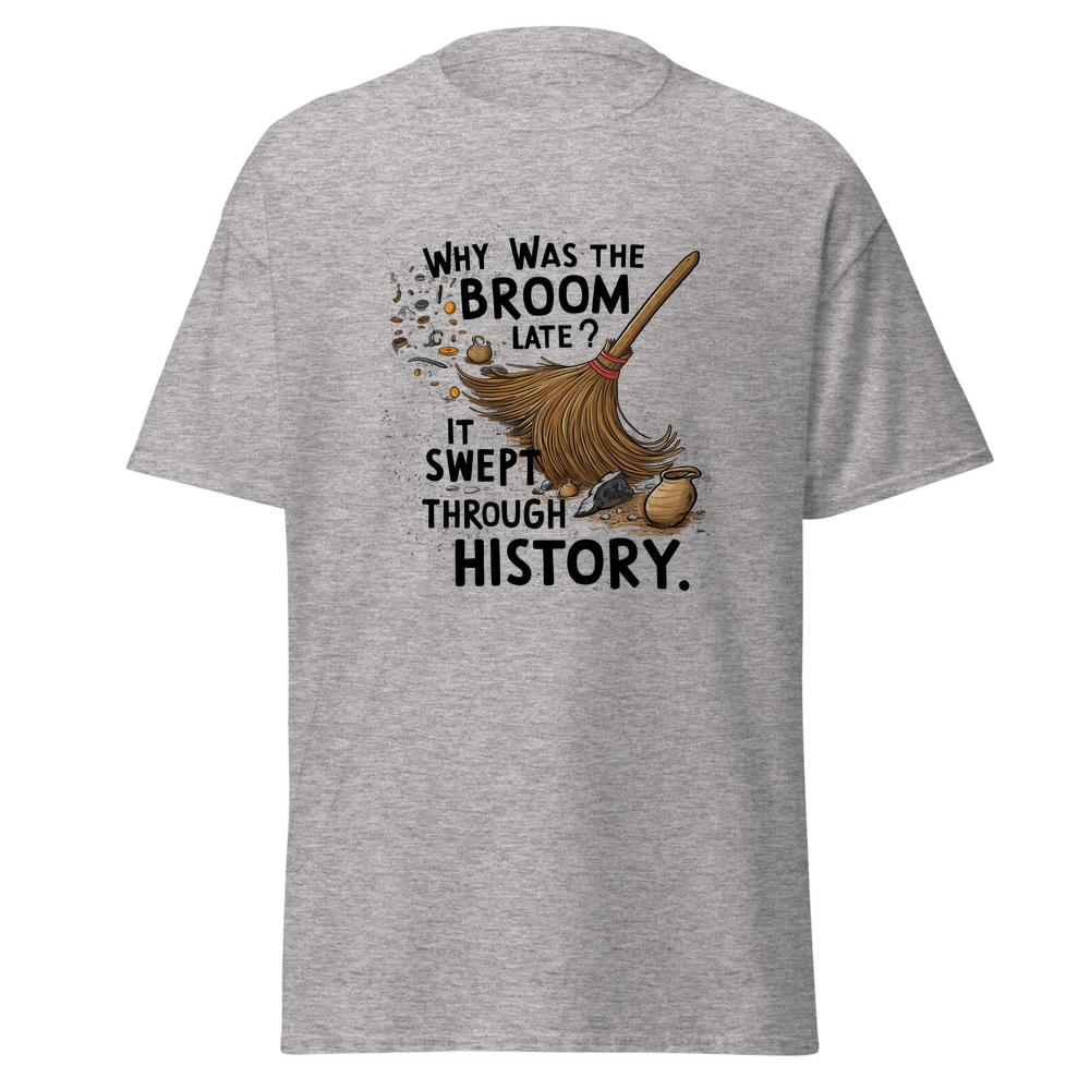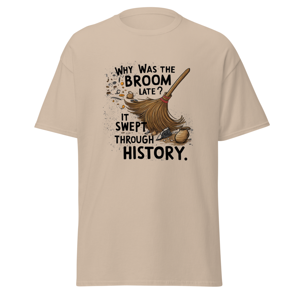 This playful shirt features a broom sweeping up a trail of historical artifacts, making it a perfect gift for history buffs with a great sense of humor. Ideal for adults and anyone who loves a good dad joke.This t-shirt is everything you’ve dreamed of and more. It feels soft and lightweight, with the right amount of stretch. It’s comfortable and flattering for all. 100% combed and ring-spun cotton (Heather colors contain polyester) Fabric weight: 4.2 oz./yd.² (142 g/m²) Pre-shrunk fabric Side-seamed construction Shoulder-to-shoulder taping