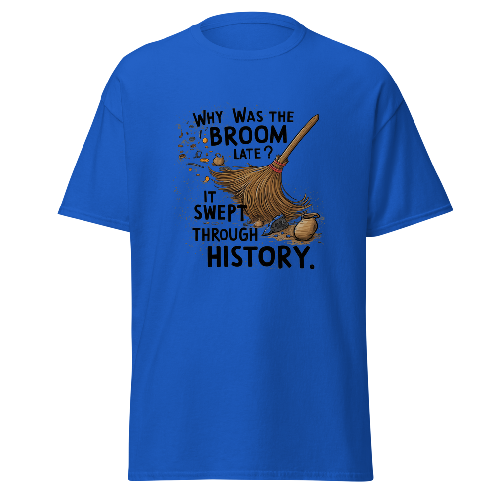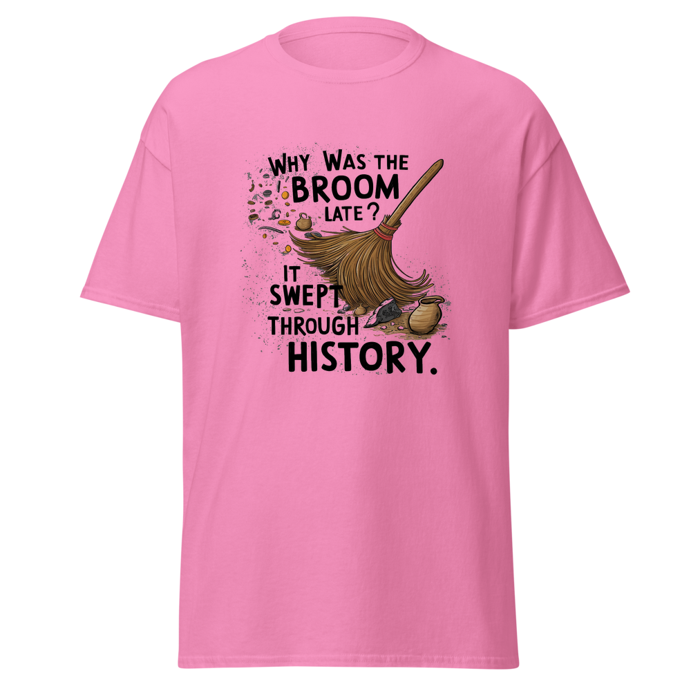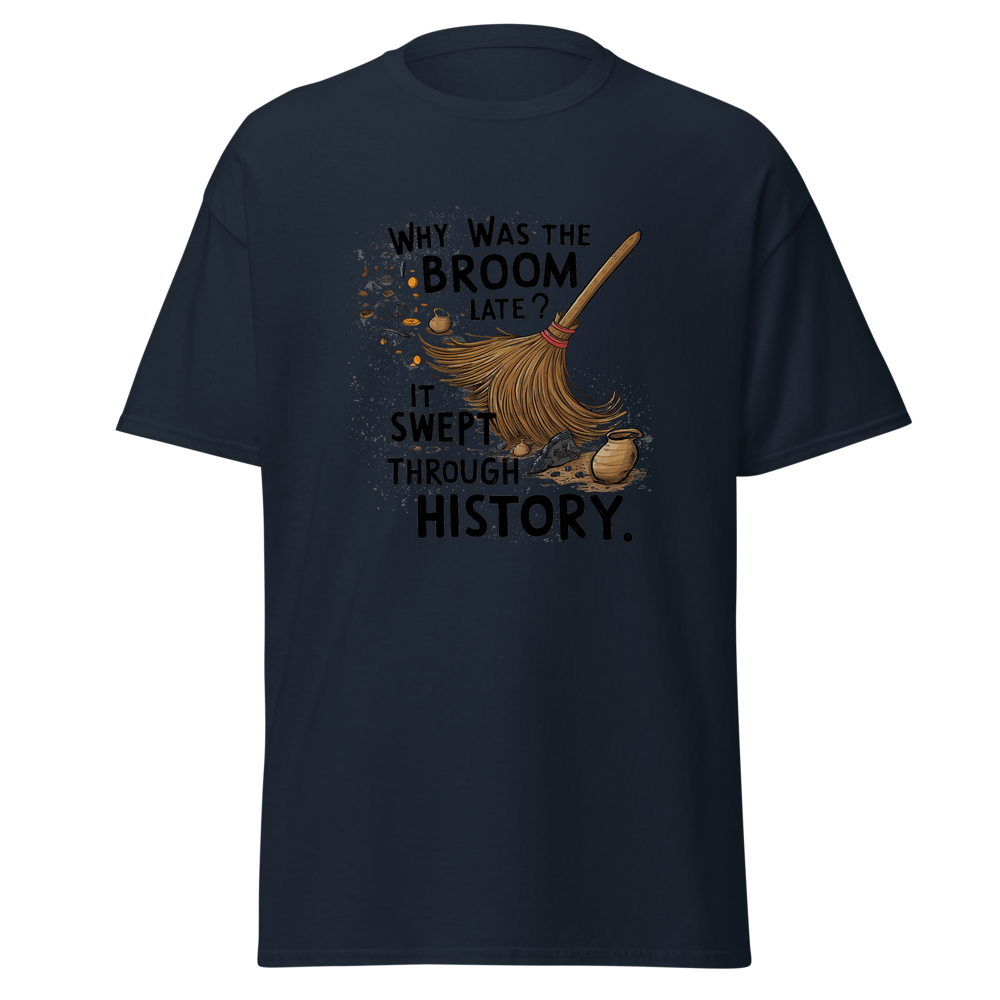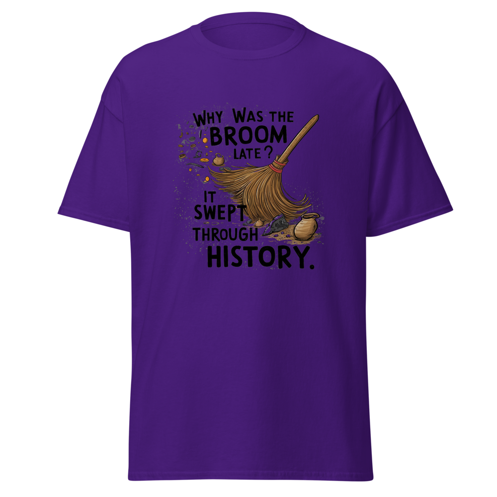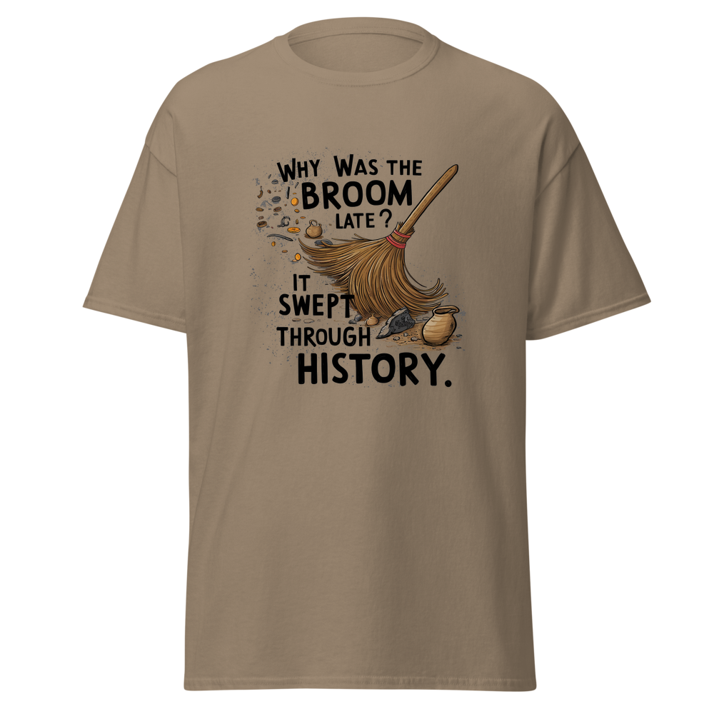 This playful shirt features a broom sweeping up a trail of historical artifacts, making it a perfect gift for history buffs with a great sense of humor. Ideal for adults and anyone who loves a good dad joke.This t-shirt is everything you’ve dreamed of and more. It feels soft and lightweight, with the right amount of stretch. It’s comfortable and flattering for all. 100% combed and ring-spun cotton (Heather colors contain polyester) Fabric weight: 4.2 oz./yd.² (142 g/m²) Pre-shrunk fabric Side-seamed construction Shoulder-to-shoulder taping