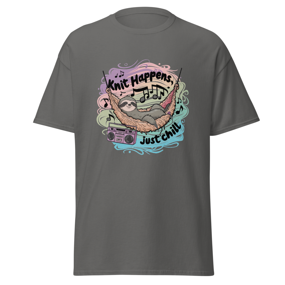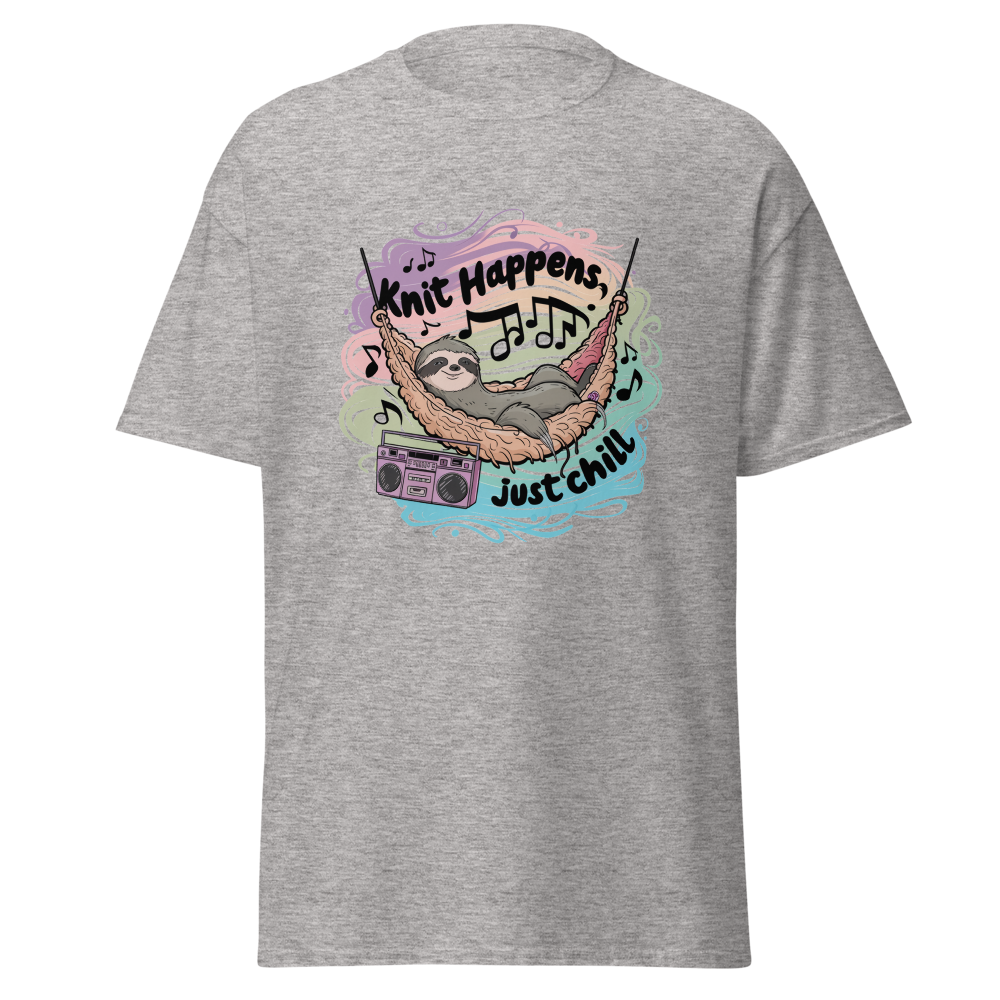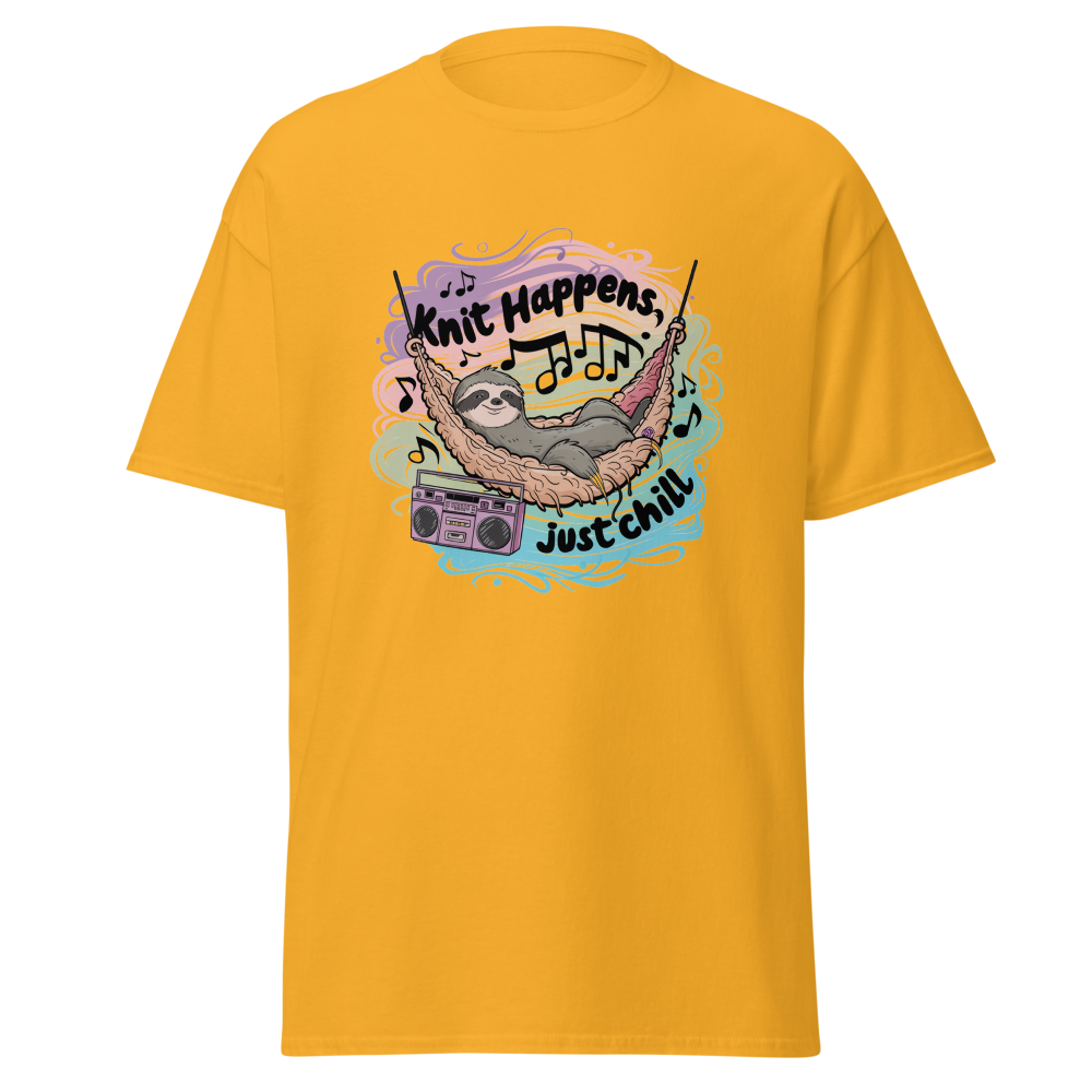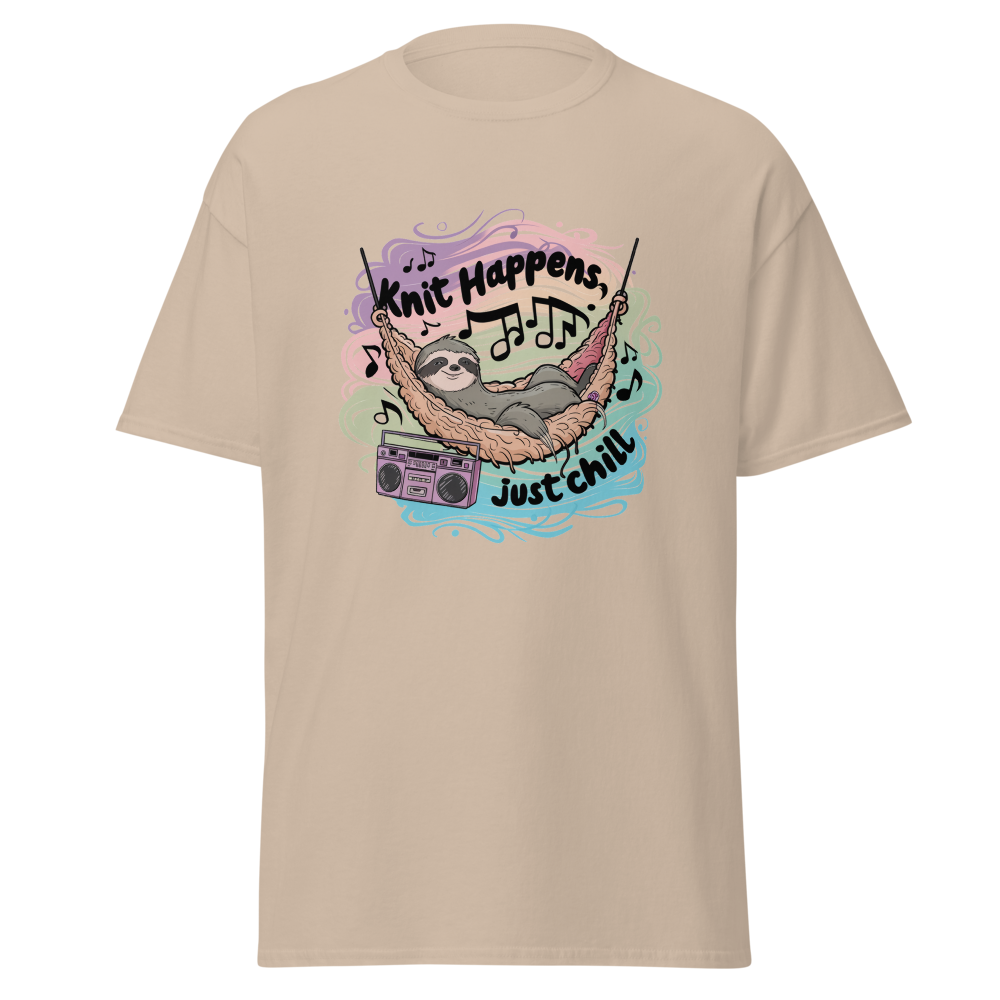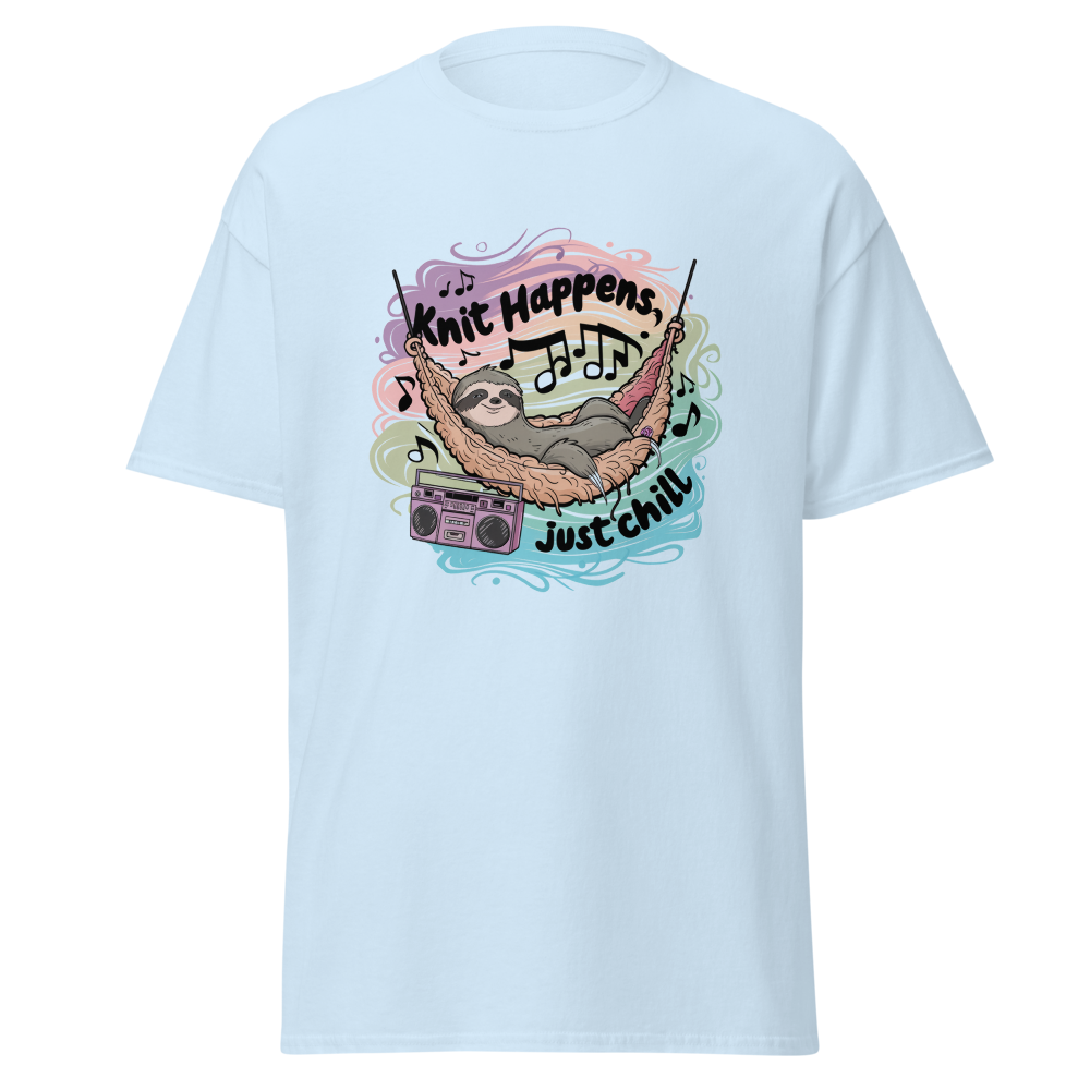 Kick back with this cool cartoon sloth lounging in a yarn hammock. With a retro boombox and musical notes around, this design is perfect for knitting and crocheting fans who love to relax.This t-shirt is everything you’ve dreamed of and more. It feels soft and lightweight, with the right amount of stretch. It’s comfortable and flattering for all. 100% combed and ring-spun cotton (Heather colors contain polyester) Fabric weight: 4.2 oz./yd.² (142 g/m²) Pre-shrunk fabric Side-seamed construction Shoulder-to-shoulder taping
