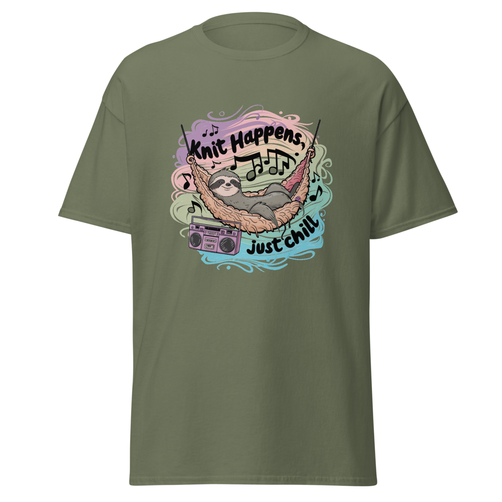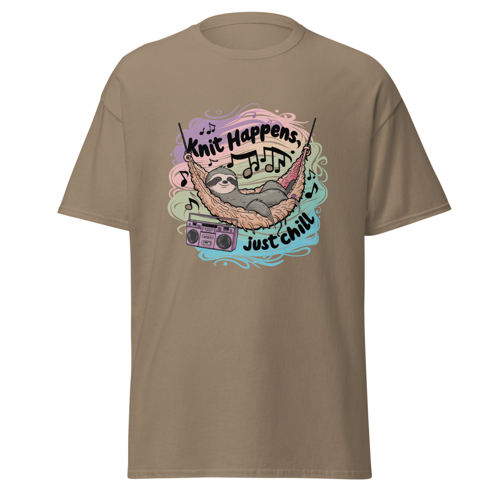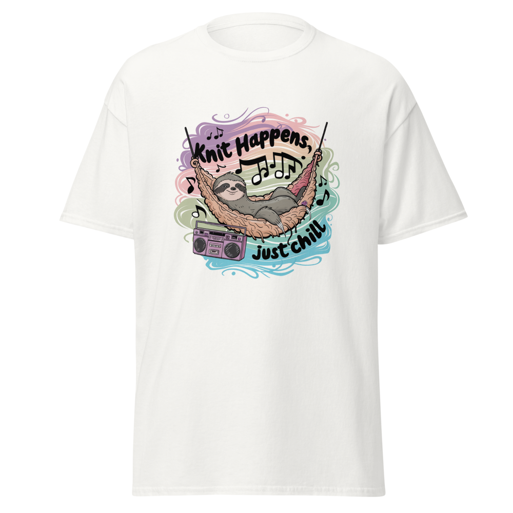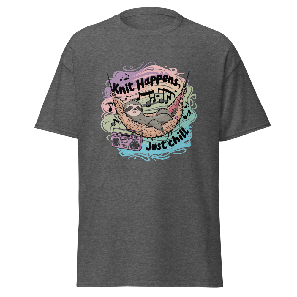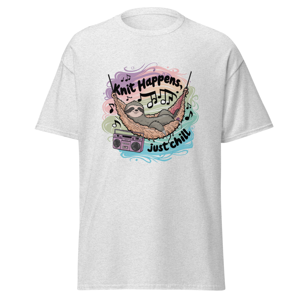 Kick back with this cool cartoon sloth lounging in a yarn hammock. With a retro boombox and musical notes around, this design is perfect for knitting and crocheting fans who love to relax.This t-shirt is everything you’ve dreamed of and more. It feels soft and lightweight, with the right amount of stretch. It’s comfortable and flattering for all. 100% combed and ring-spun cotton (Heather colors contain polyester) Fabric weight: 4.2 oz./yd.² (142 g/m²) Pre-shrunk fabric Side-seamed construction Shoulder-to-shoulder taping