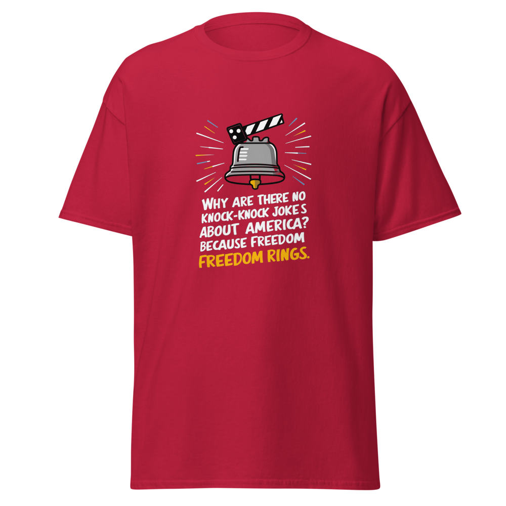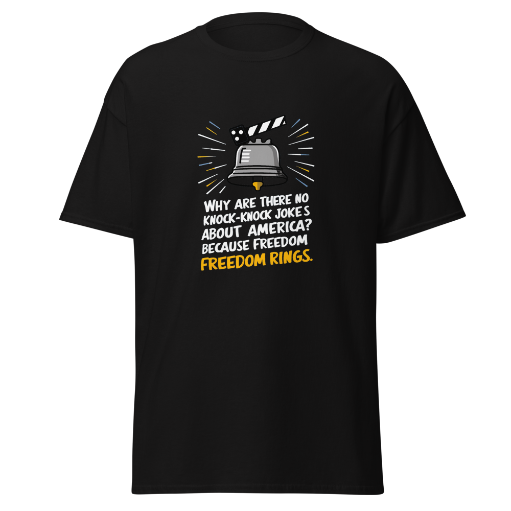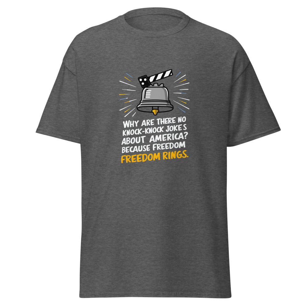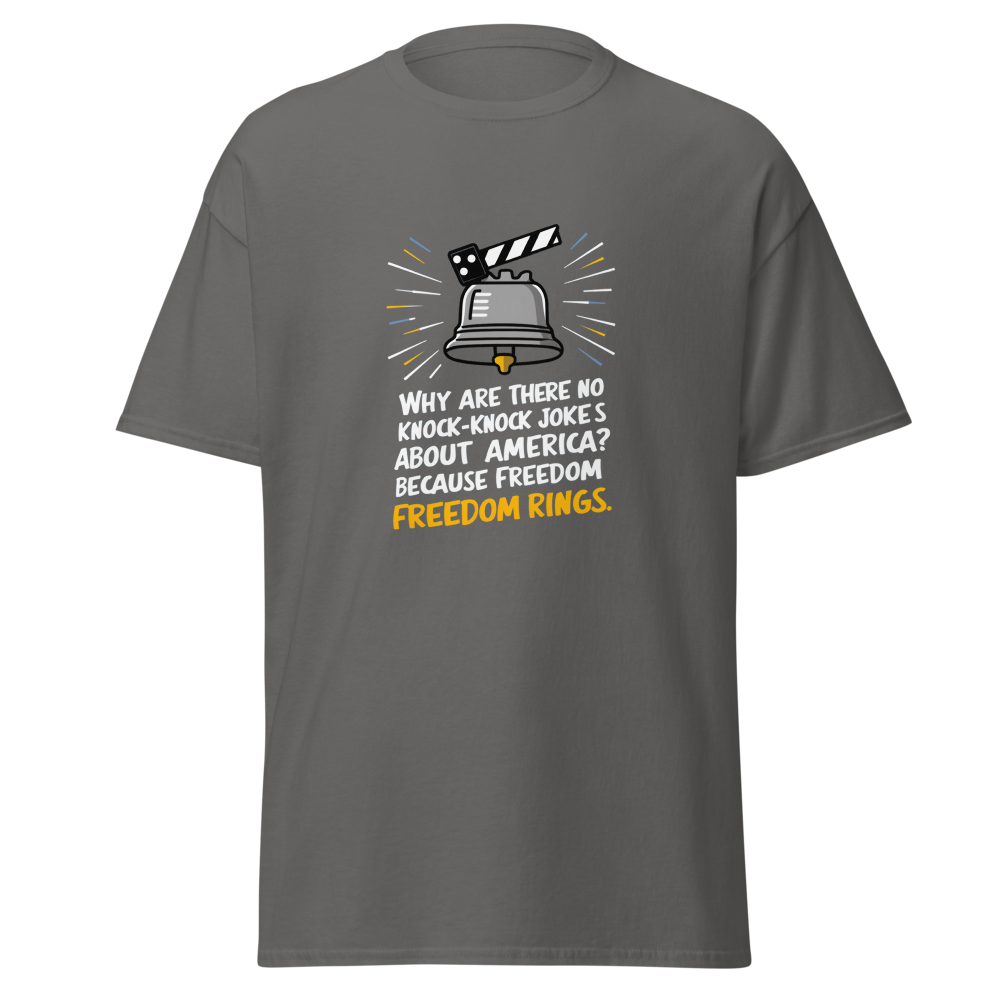 This fun t-shirt features a cartoon Liberty Bell holding a clapperboard with camera lights shining down. Perfect for movie buffs who love a good joke and a nod to American freedom.This t-shirt is everything you’ve dreamed of and more. It feels soft and lightweight, with the right amount of stretch. It’s comfortable and flattering for all. 100% combed and ring-spun cotton (Heather colors contain polyester) Fabric weight: 4.2 oz./yd.² (142 g/m²) Pre-shrunk fabric Side-seamed construction Shoulder-to-shoulder taping