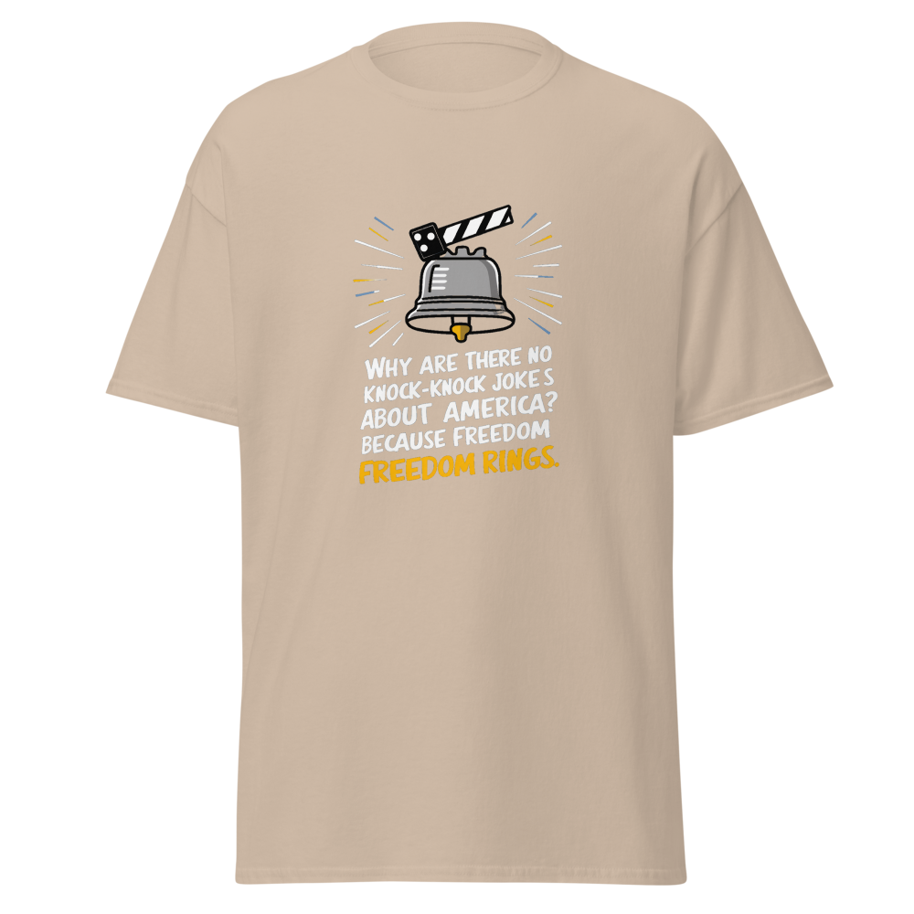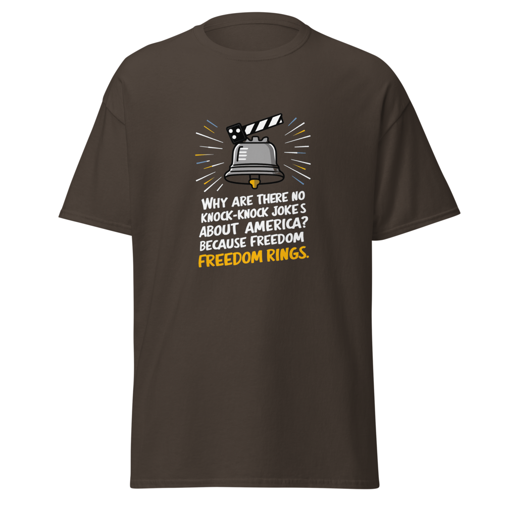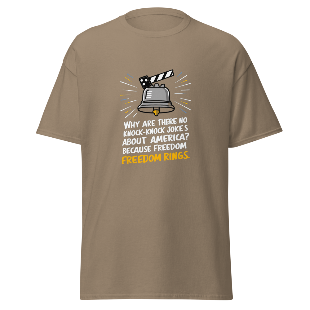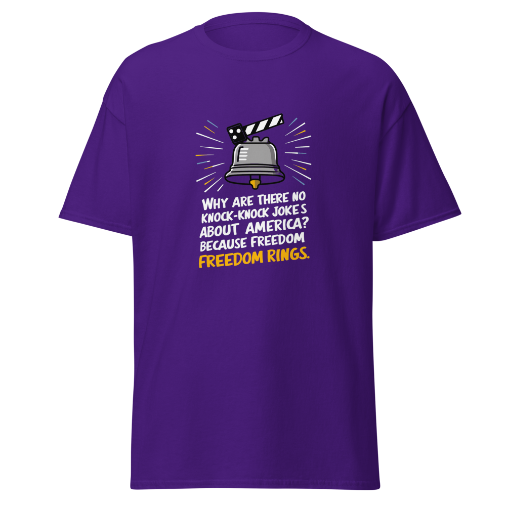 This fun t-shirt features a cartoon Liberty Bell holding a clapperboard with camera lights shining down. Perfect for movie buffs who love a good joke and a nod to American freedom.This t-shirt is everything you’ve dreamed of and more. It feels soft and lightweight, with the right amount of stretch. It’s comfortable and flattering for all. 100% combed and ring-spun cotton (Heather colors contain polyester) Fabric weight: 4.2 oz./yd.² (142 g/m²) Pre-shrunk fabric Side-seamed construction Shoulder-to-shoulder taping