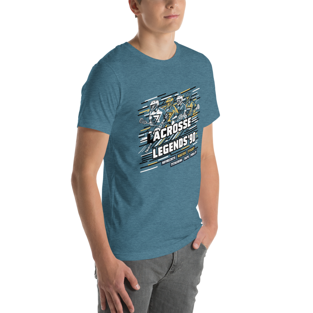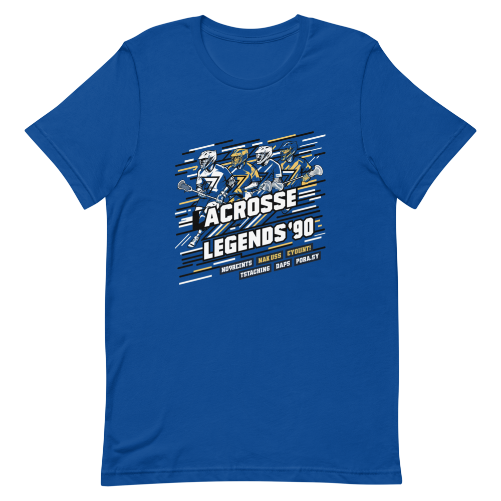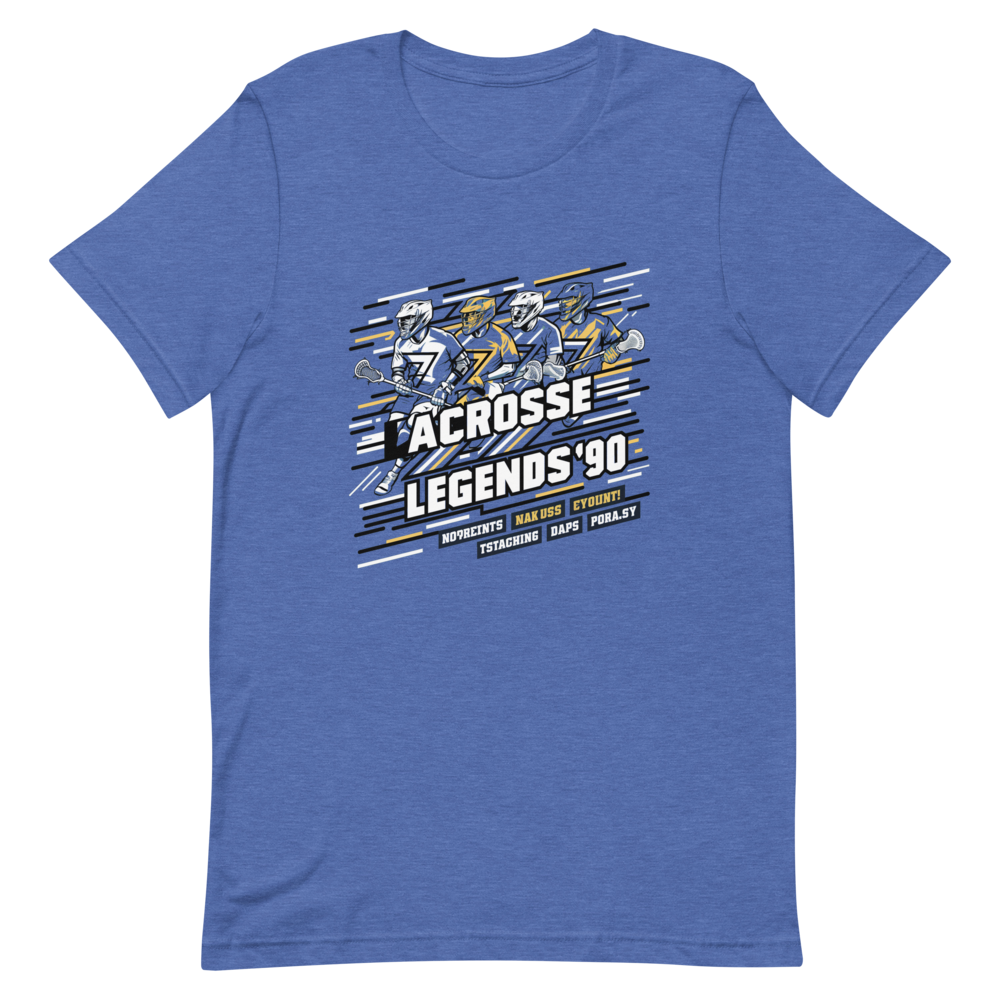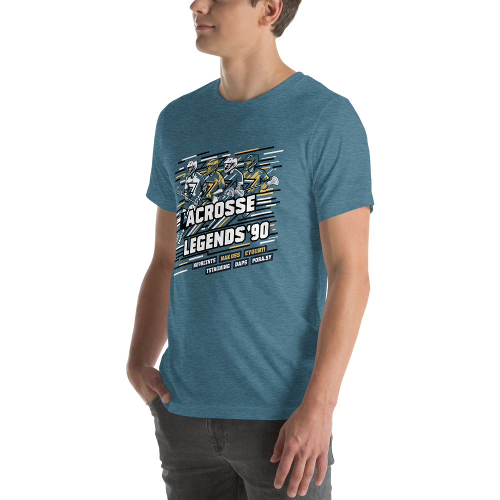 A lively and modern pop art design featuring dynamic lacrosse players intertwined with cool geometric patterns and abstract lines. Perfect for sports enthusiasts and fans of old school lacrosse teams.This t-shirt is everything you’ve dreamed of and more. It feels soft and lightweight, with the right amount of stretch. It’s comfortable and flattering for all. 100% combed and ring-spun cotton (Heather colors contain polyester) Fabric weight: 4.2 oz./yd.² (142 g/m²) Pre-shrunk fabric Side-seamed construction Shoulder-to-shoulder taping