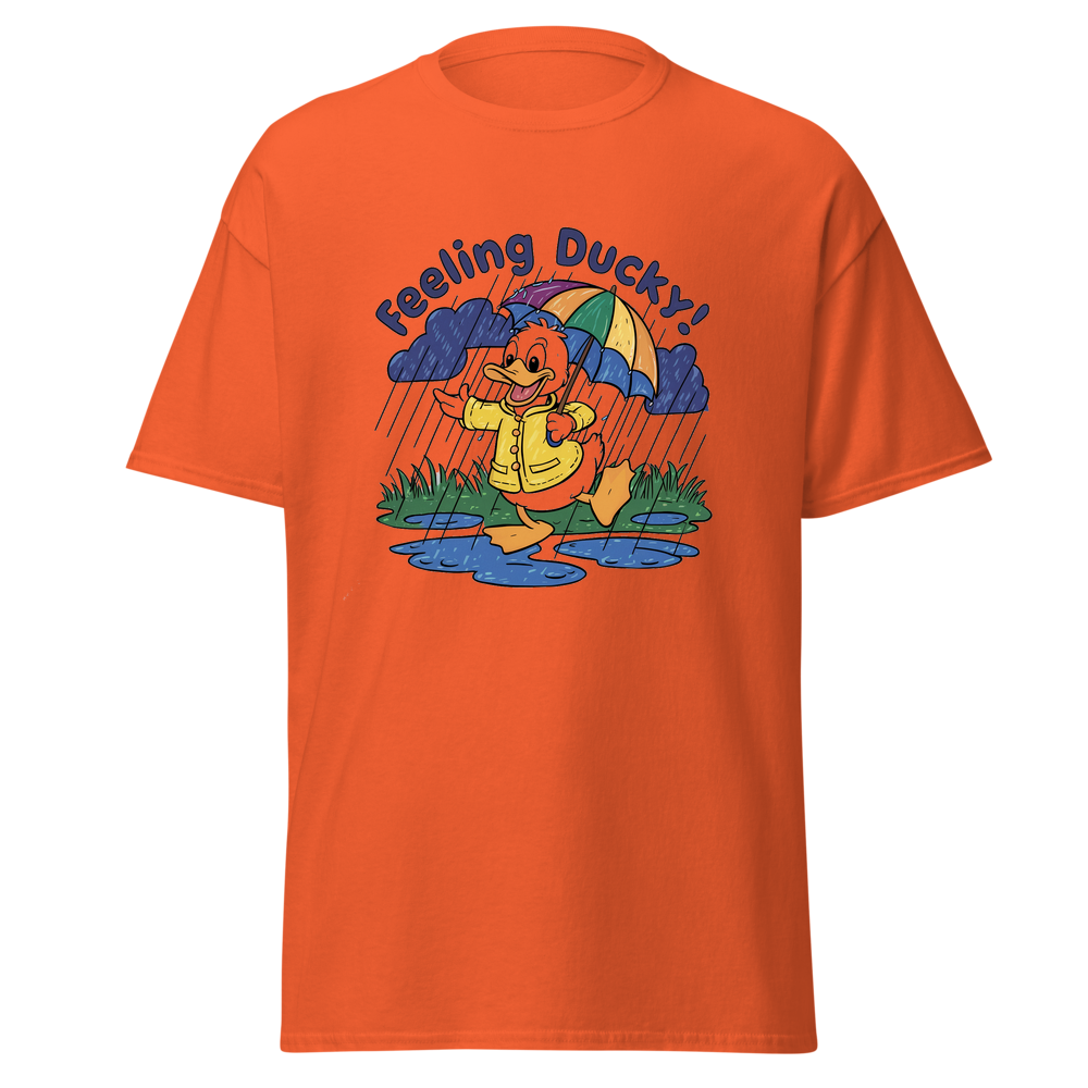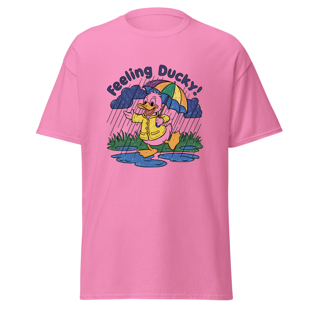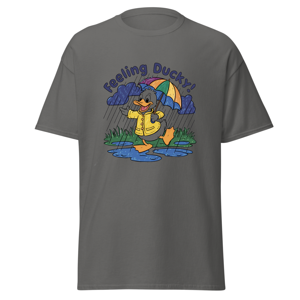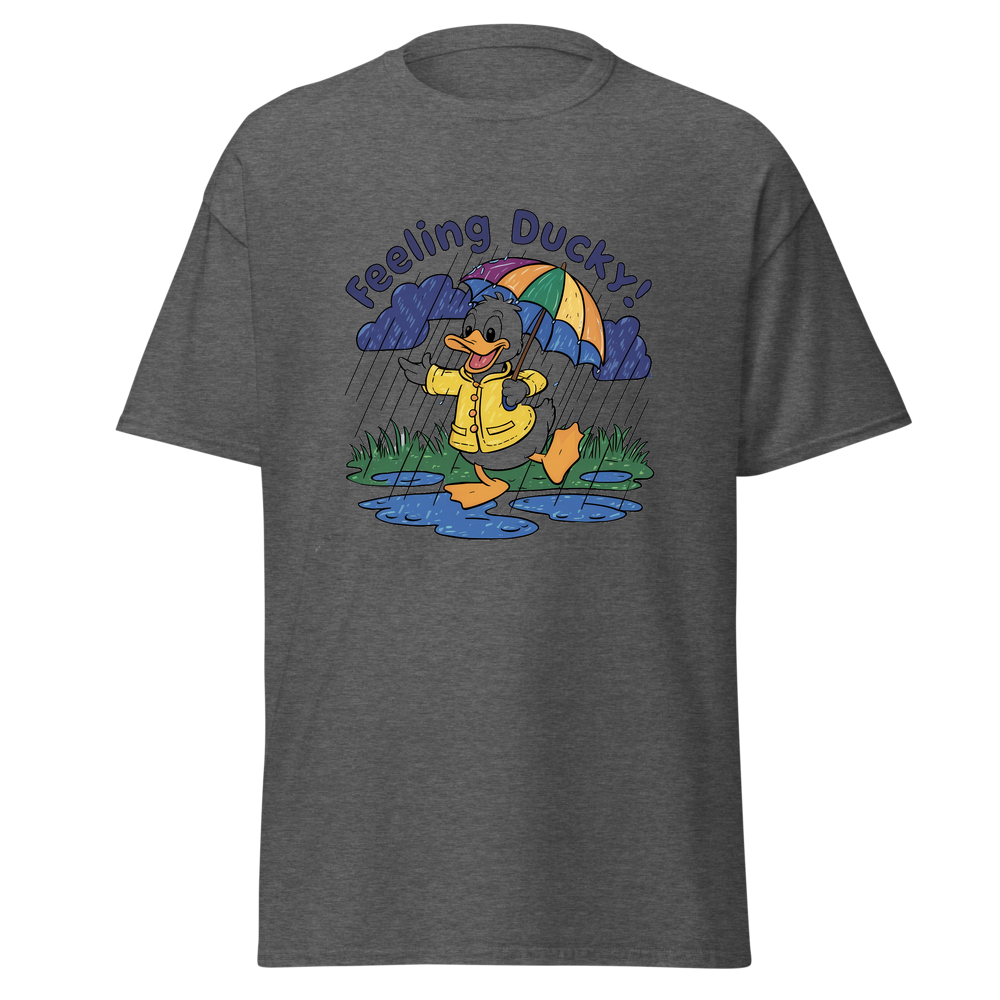 A happy cartoon duck dances in the rain, clutching an umbrella as it hops around puddles. Perfect for kids and cartoon lovers, this playful design will brighten up any rainy day!This t-shirt is everything you’ve dreamed of and more. It feels soft and lightweight, with the right amount of stretch. It’s comfortable and flattering for all. 100% combed and ring-spun cotton (Heather colors contain polyester) Fabric weight: 4.2 oz./yd.² (142 g/m²) Pre-shrunk fabric Side-seamed construction Shoulder-to-shoulder taping