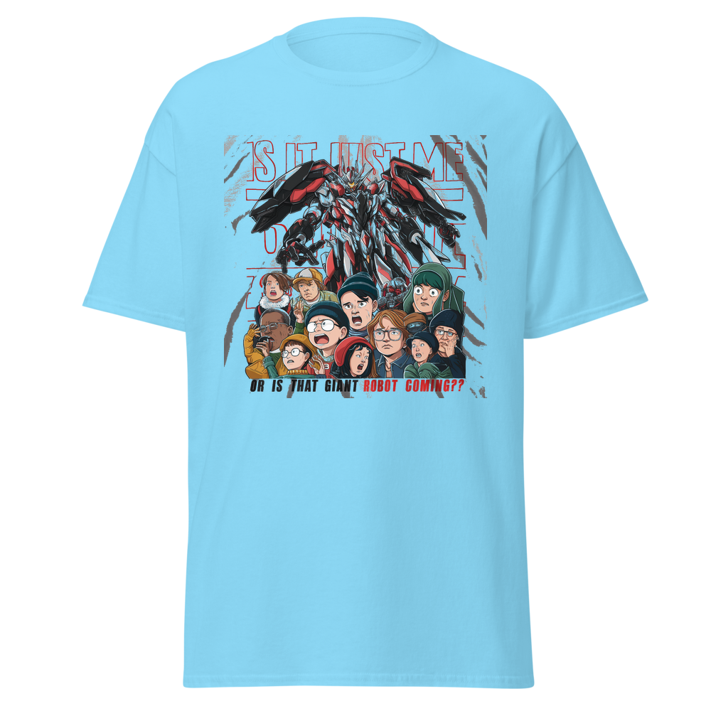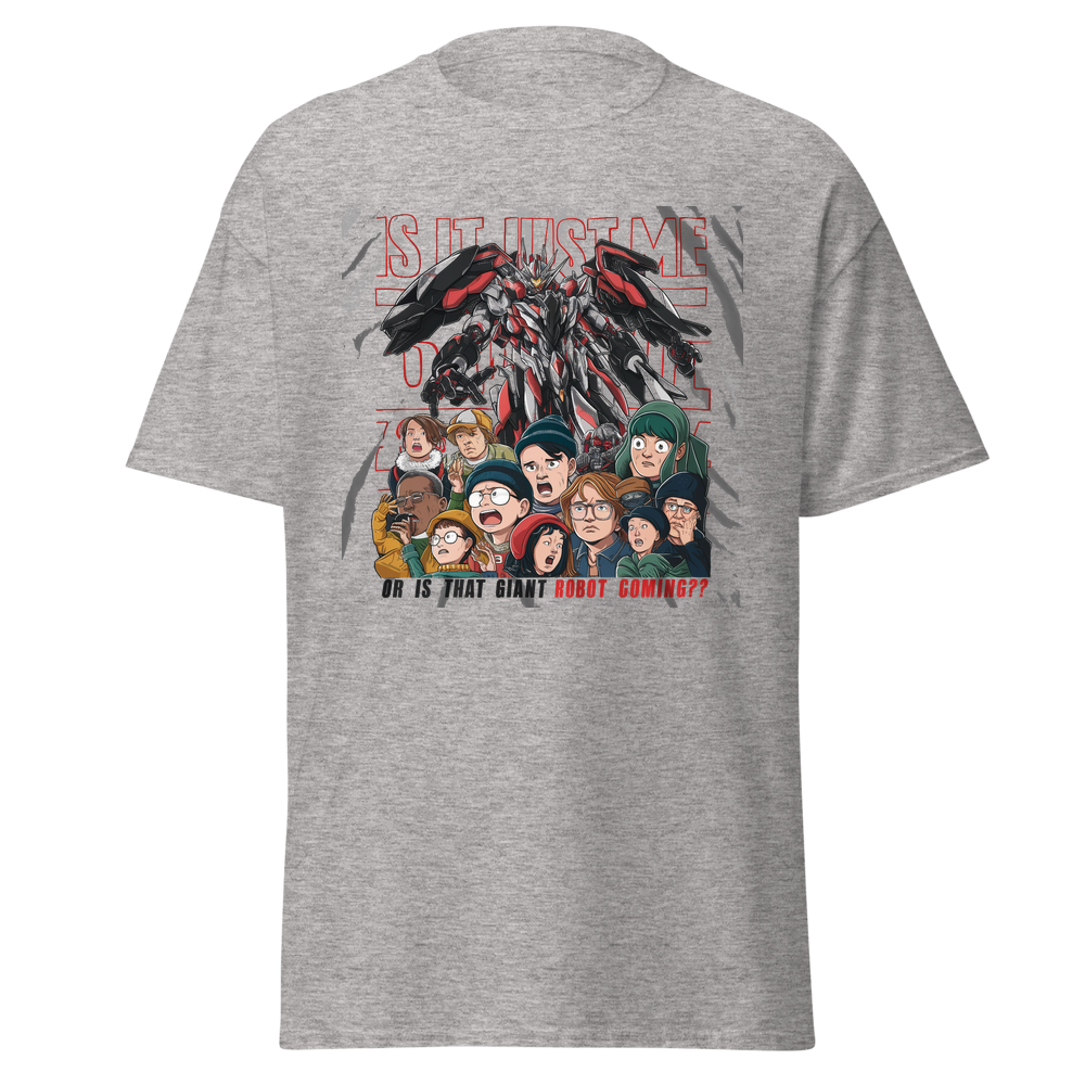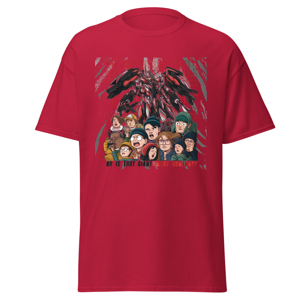 Anime characters stand in awe as an enormous mecha looms in the background, creating a dramatic and thrilling scene perfect for anime fans.This t-shirt is everything you’ve dreamed of and more. It feels soft and lightweight, with the right amount of stretch. It’s comfortable and flattering for all. 100% combed and ring-spun cotton (Heather colors contain polyester) Fabric weight: 4.2 oz./yd.² (142 g/m²) Pre-shrunk fabric Side-seamed construction Shoulder-to-shoulder taping
