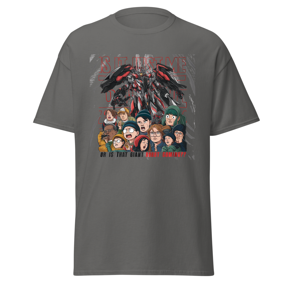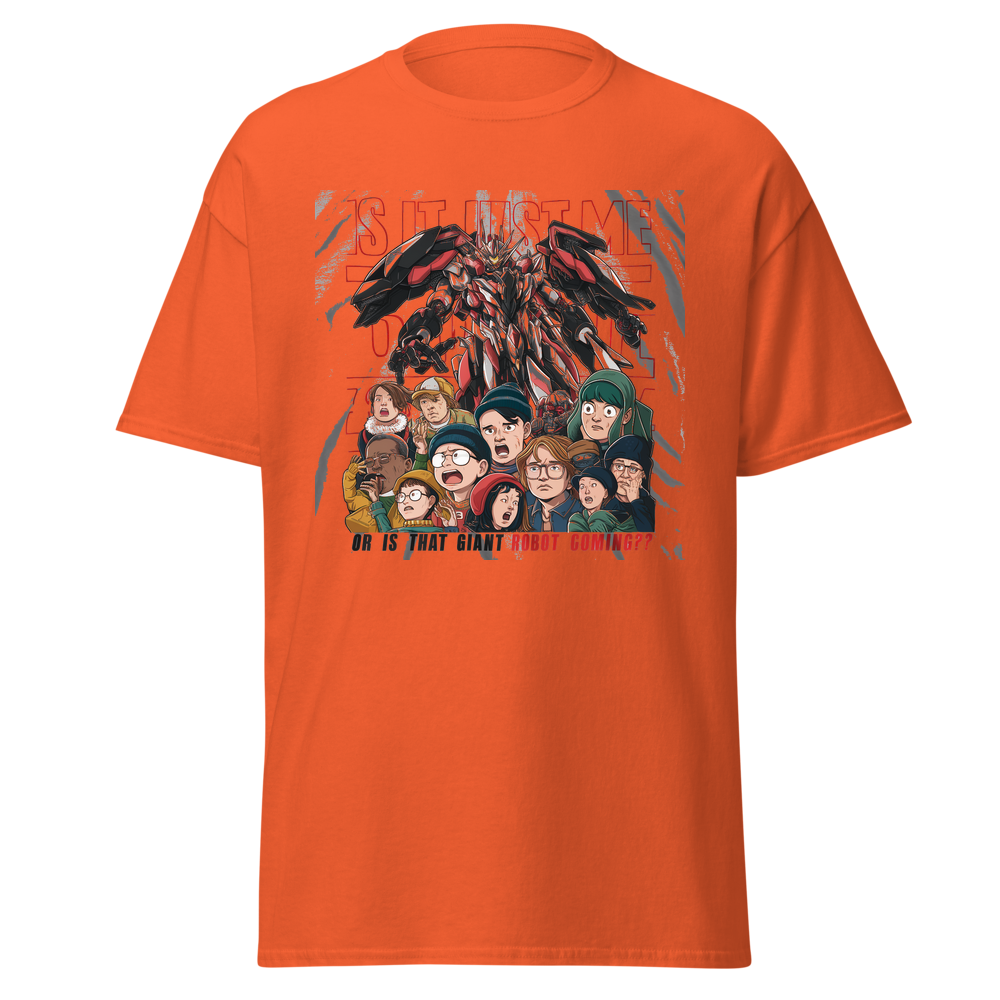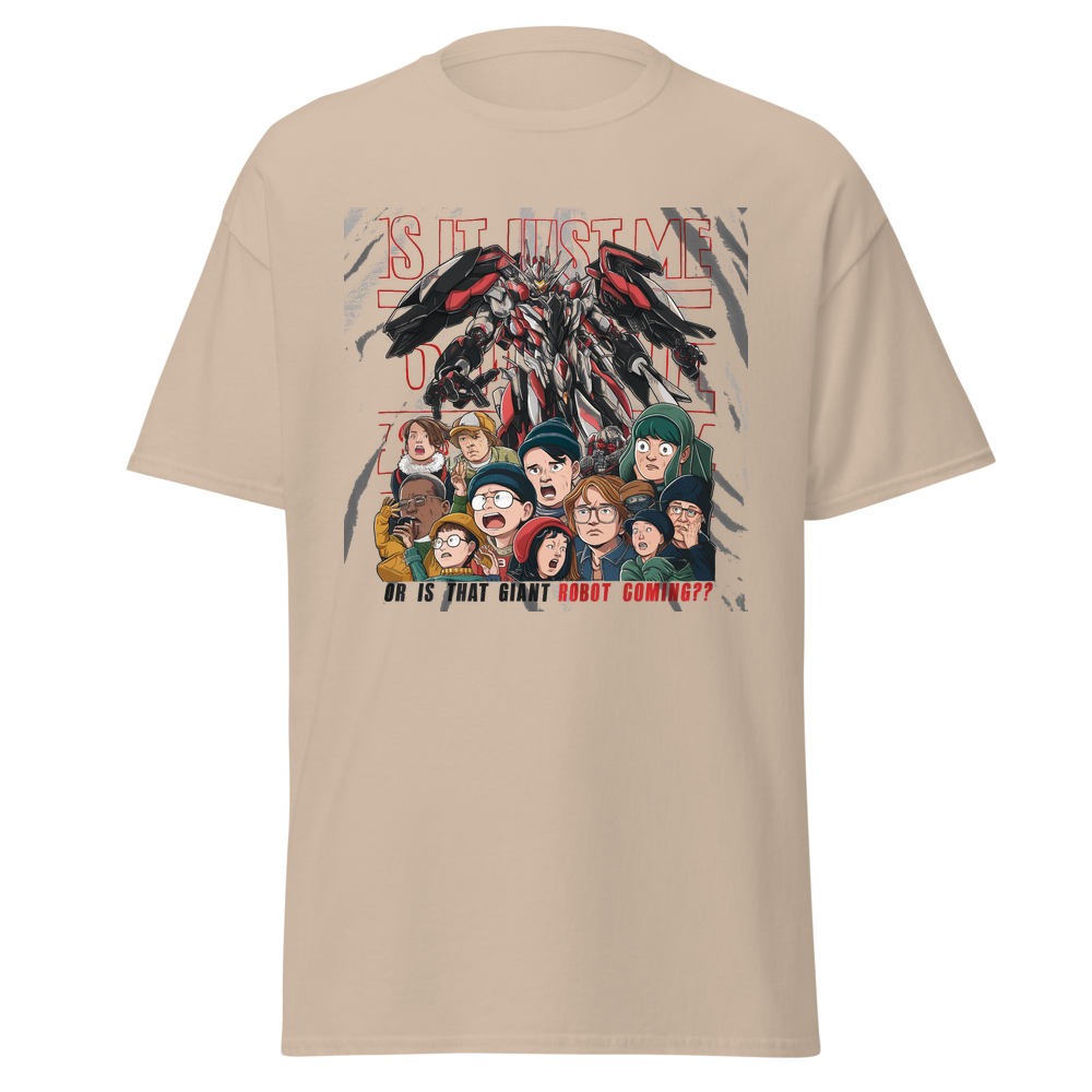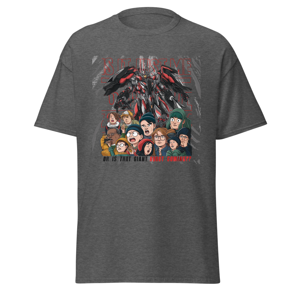 Anime characters stand in awe as an enormous mecha looms in the background, creating a dramatic and thrilling scene perfect for anime fans.This t-shirt is everything you’ve dreamed of and more. It feels soft and lightweight, with the right amount of stretch. It’s comfortable and flattering for all. 100% combed and ring-spun cotton (Heather colors contain polyester) Fabric weight: 4.2 oz./yd.² (142 g/m²) Pre-shrunk fabric Side-seamed construction Shoulder-to-shoulder taping