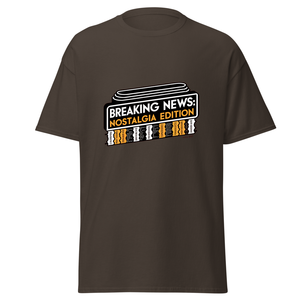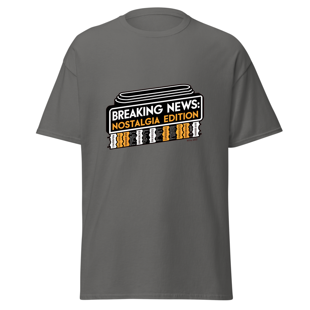 This shirt features a cool retro news anchor desk complete with an old-school news ticker, bringing back the vibes of classic TV news shows. Perfect for young adults who love a bit of nostalgia in their style.This t-shirt is everything you’ve dreamed of and more. It feels soft and lightweight, with the right amount of stretch. It’s comfortable and flattering for all. 100% combed and ring-spun cotton (Heather colors contain polyester) Fabric weight: 4.2 oz./yd.² (142 g/m²) Pre-shrunk fabric Side-seamed construction Shoulder-to-shoulder taping