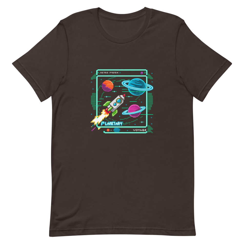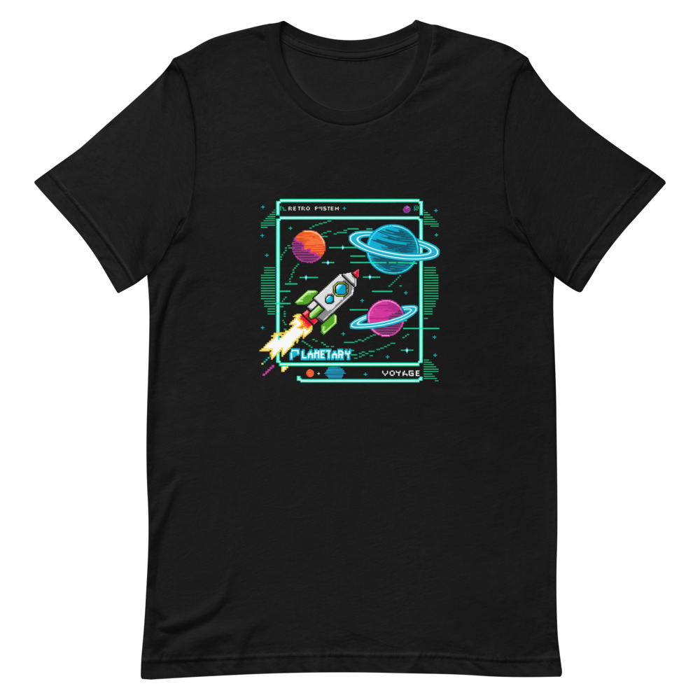 Embark on a cosmic journey with this retro-inspired pixel art rocket, set against the backdrop of various colorful planets. Perfect for astronomy enthusiasts, this design brings a nostalgic video game feel to your wardrobe.This t-shirt is everything you’ve dreamed of and more. It feels soft and lightweight, with the right amount of stretch. It’s comfortable and flattering for all. 100% combed and ring-spun cotton (Heather colors contain polyester) Fabric weight: 4.2 oz./yd.² (142 g/m²) Pre-shrunk fabric Side-seamed construction Shoulder-to-shoulder taping