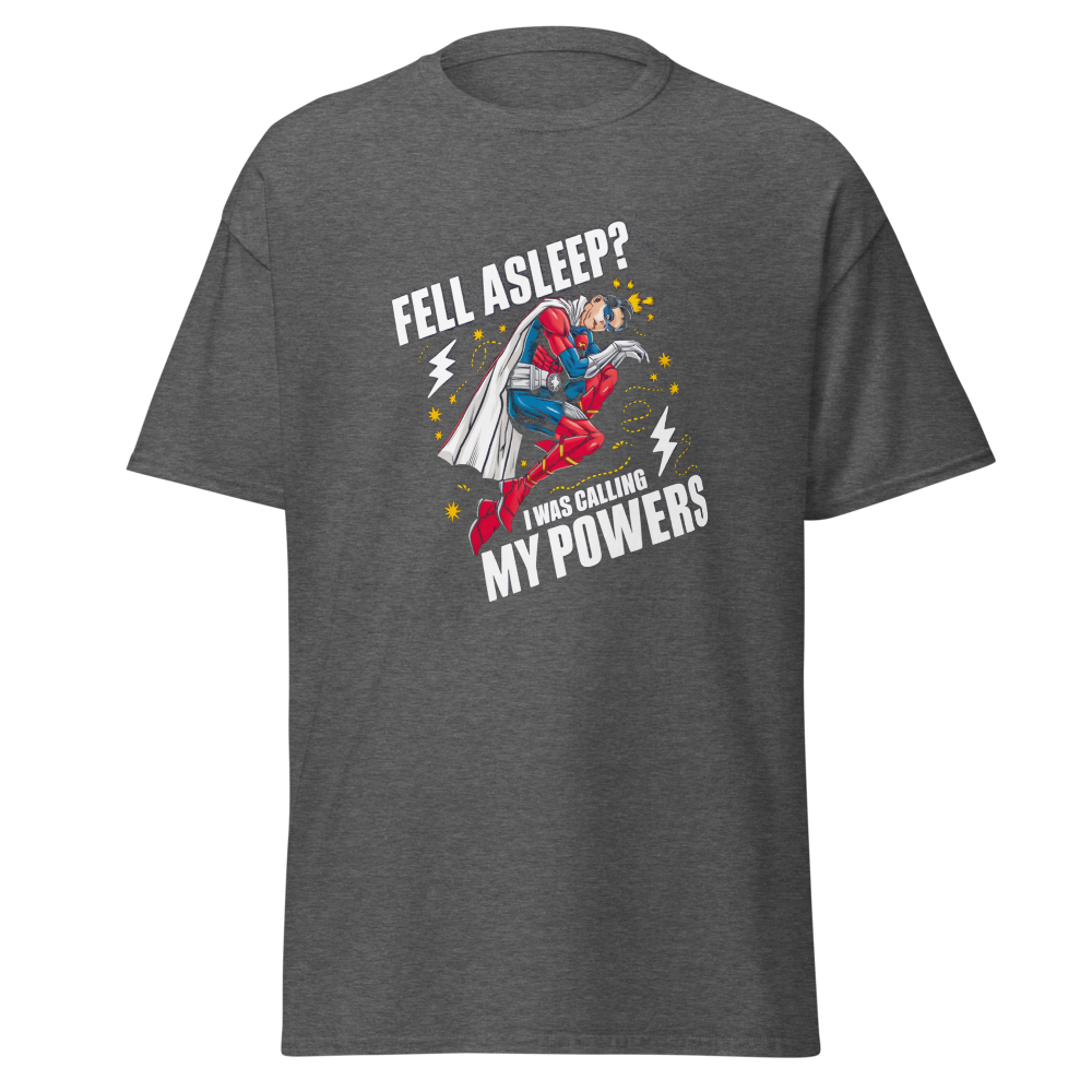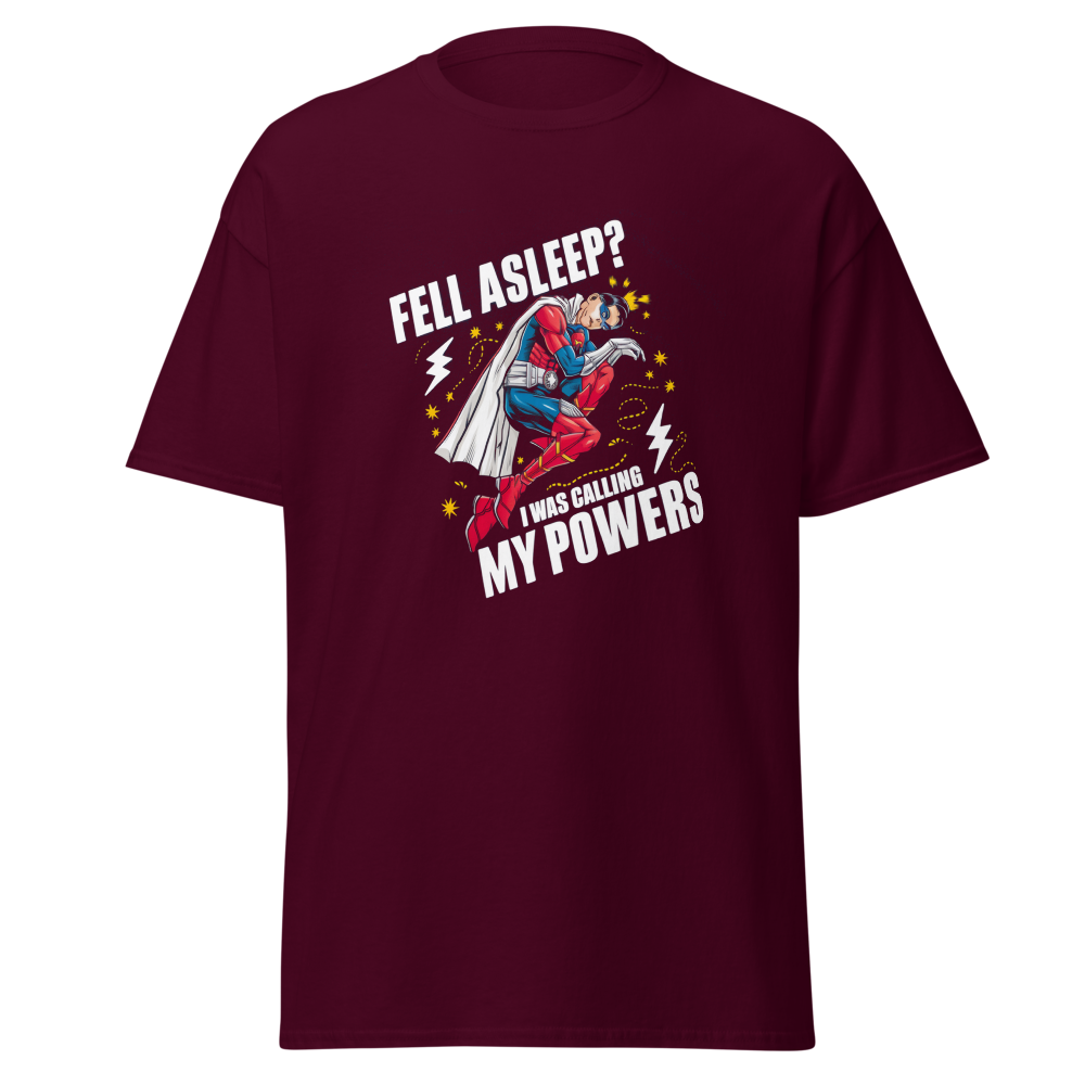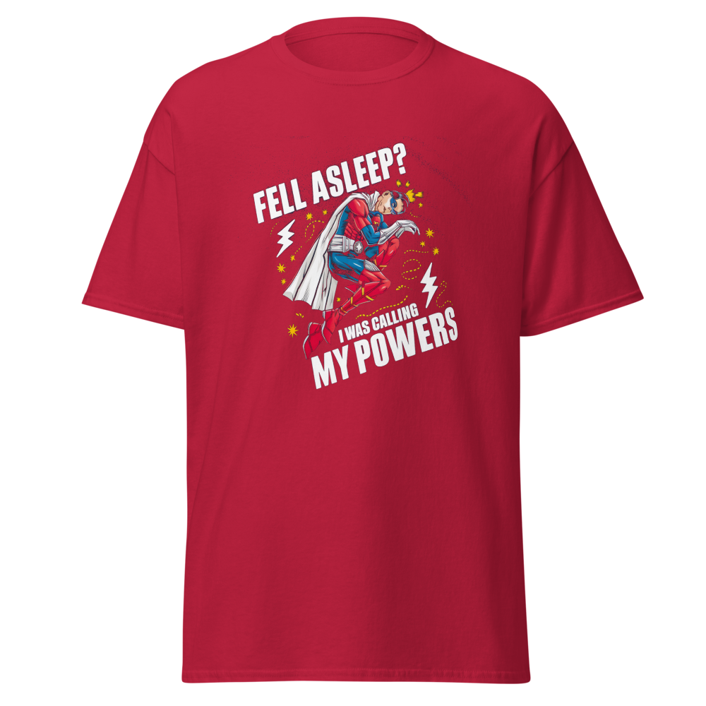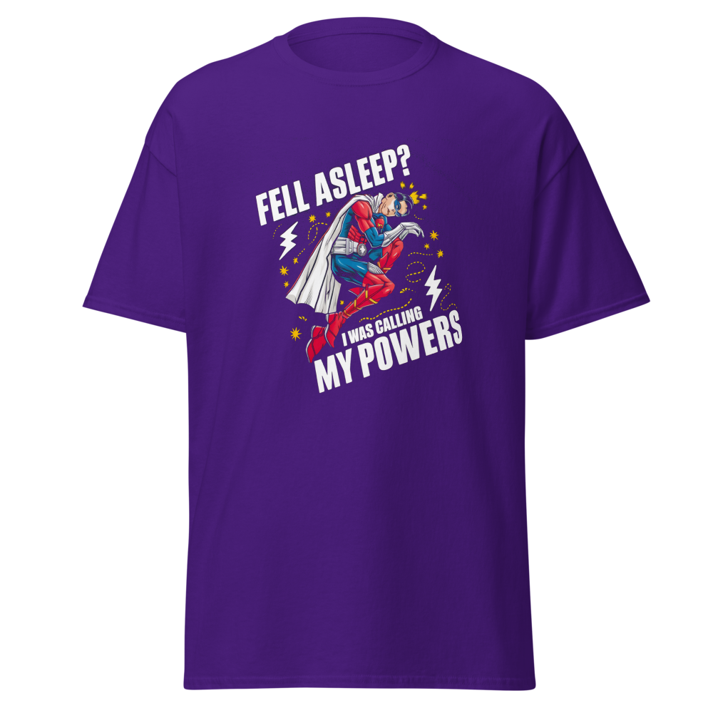 A sleepy superhero dozes off surrounded by lightning bolts and stars, combining humor with a comic book vibe. Perfect for teens and comic book fans alike!This t-shirt is everything you’ve dreamed of and more. It feels soft and lightweight, with the right amount of stretch. It’s comfortable and flattering for all. 100% combed and ring-spun cotton (Heather colors contain polyester) Fabric weight: 4.2 oz./yd.² (142 g/m²) Pre-shrunk fabric Side-seamed construction Shoulder-to-shoulder taping