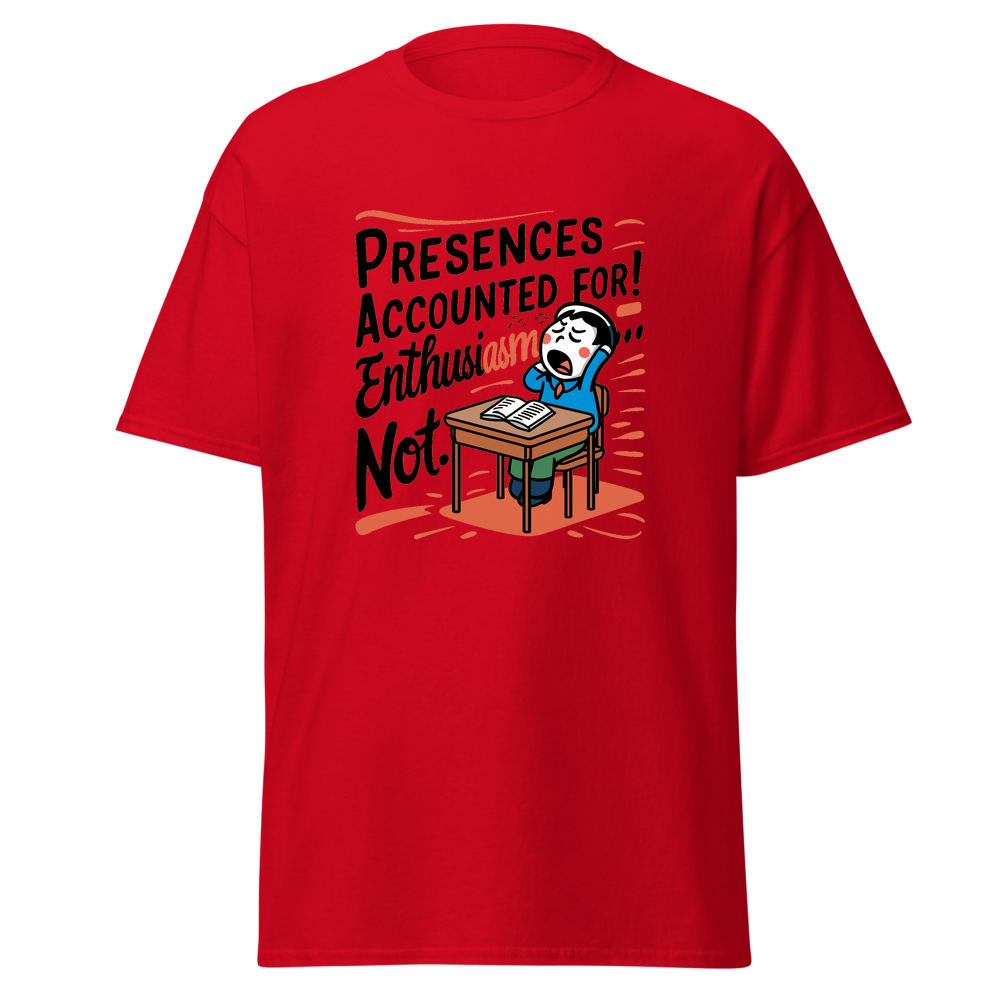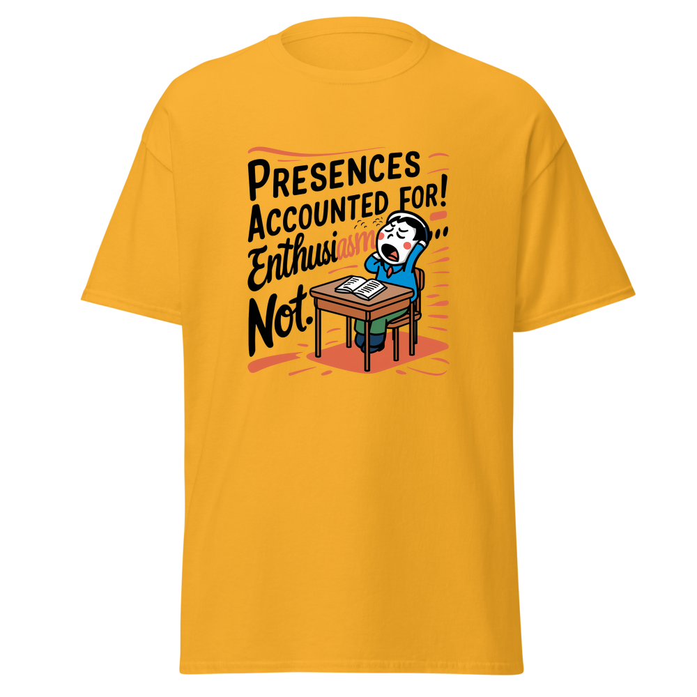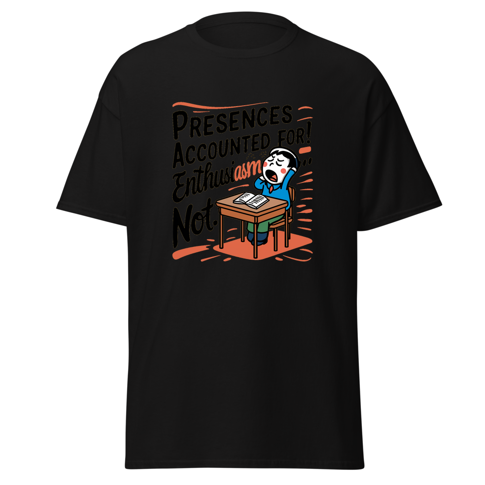 A playful design featuring a classroom desk with a yawning cartoon character. Perfect for those who might be present in body, but their mind is elsewhere! Ideal for young adults and anyone with a sense of humor.This t-shirt is everything you’ve dreamed of and more. It feels soft and lightweight, with the right amount of stretch. It’s comfortable and flattering for all. 100% combed and ring-spun cotton (Heather colors contain polyester) Fabric weight: 4.2 oz./yd.² (142 g/m²) Pre-shrunk fabric Side-seamed construction Shoulder-to-shoulder taping