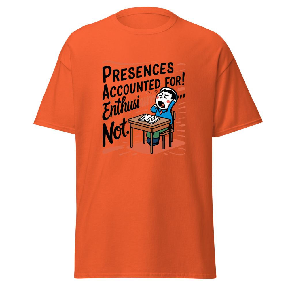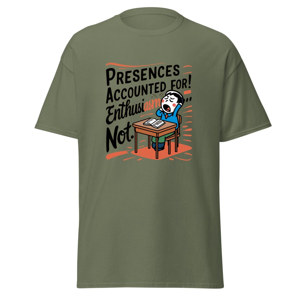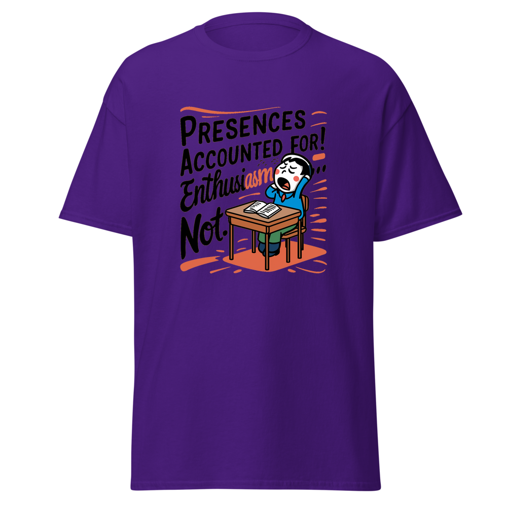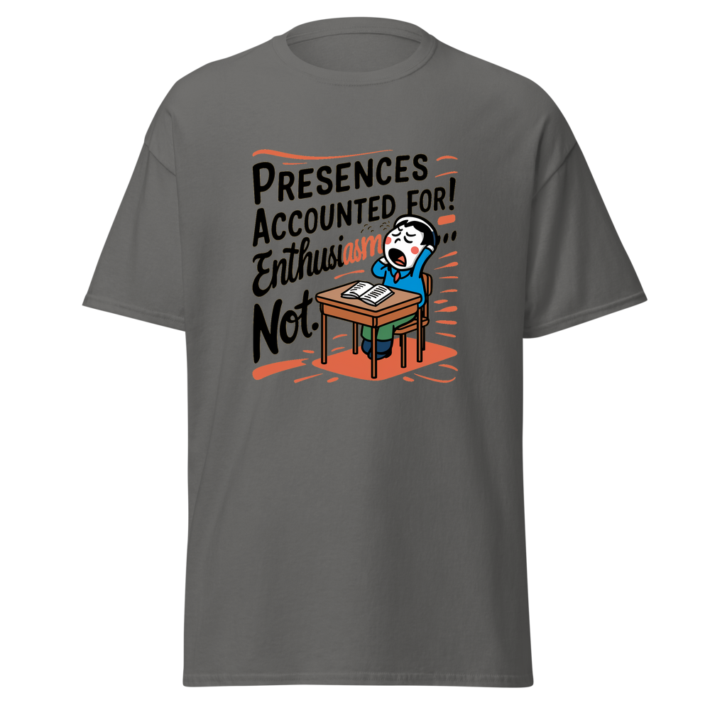 A playful design featuring a classroom desk with a yawning cartoon character. Perfect for those who might be present in body, but their mind is elsewhere! Ideal for young adults and anyone with a sense of humor.This t-shirt is everything you’ve dreamed of and more. It feels soft and lightweight, with the right amount of stretch. It’s comfortable and flattering for all. 100% combed and ring-spun cotton (Heather colors contain polyester) Fabric weight: 4.2 oz./yd.² (142 g/m²) Pre-shrunk fabric Side-seamed construction Shoulder-to-shoulder taping