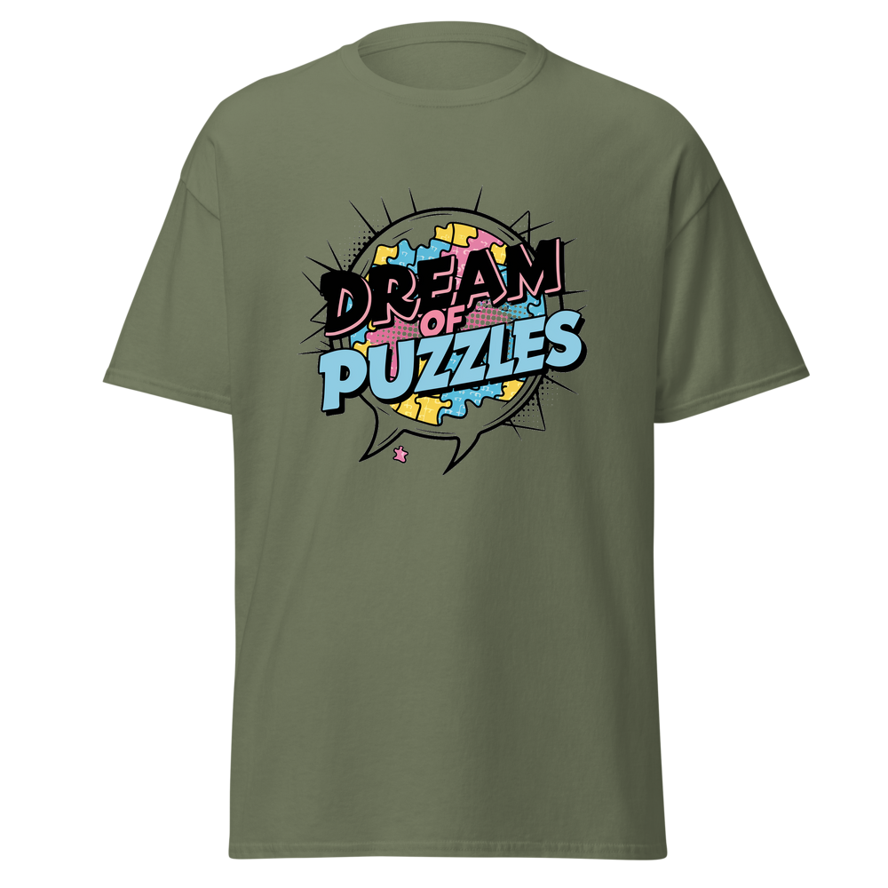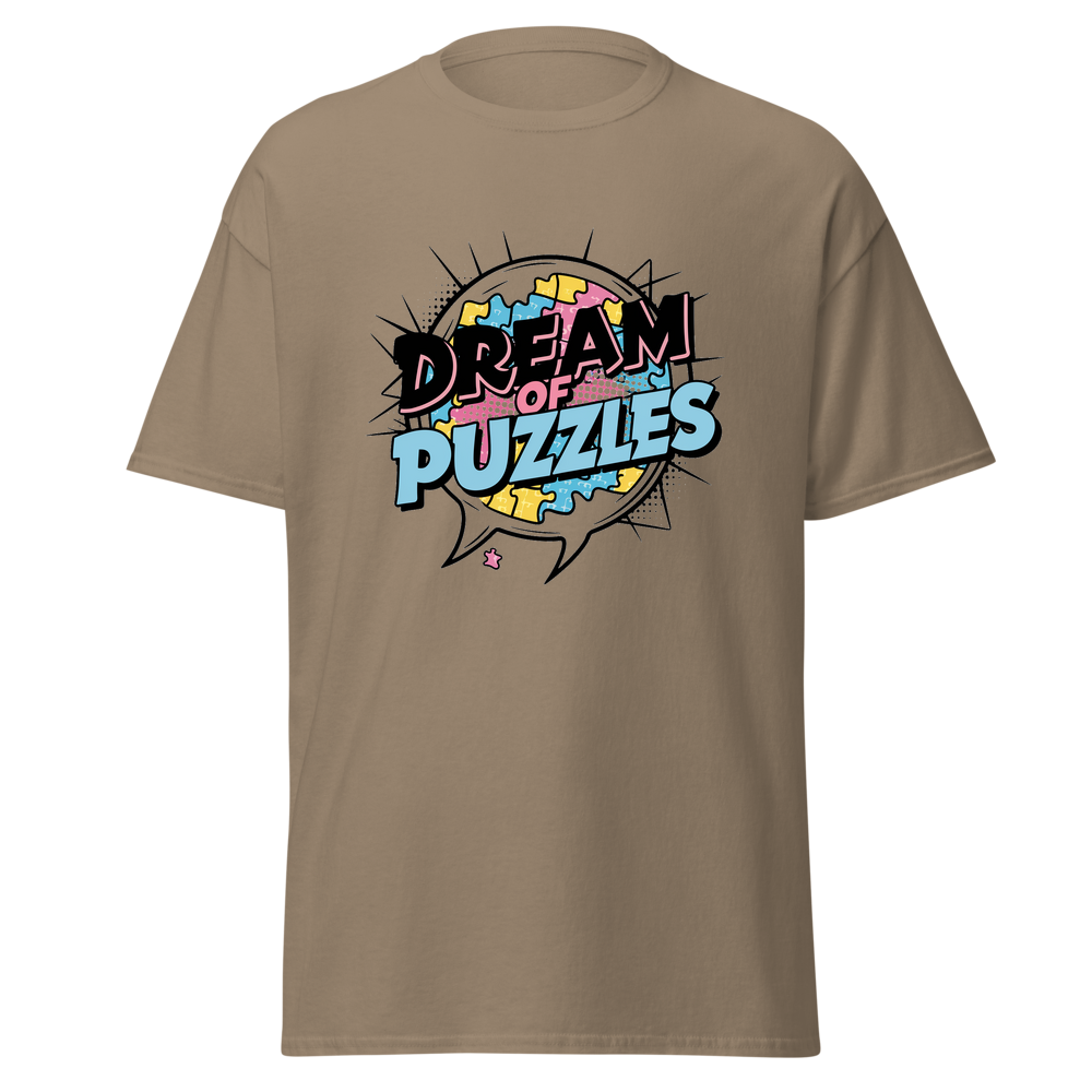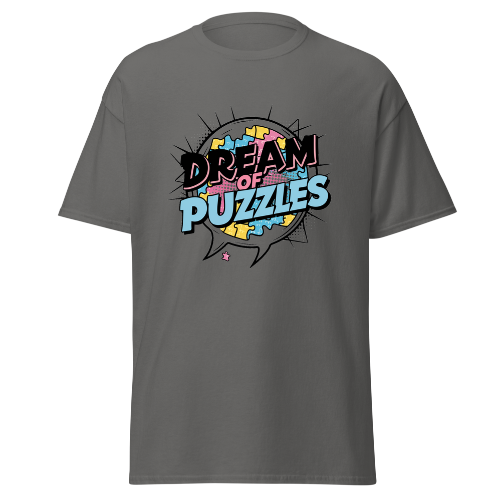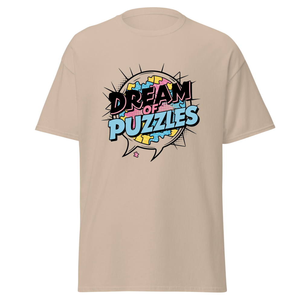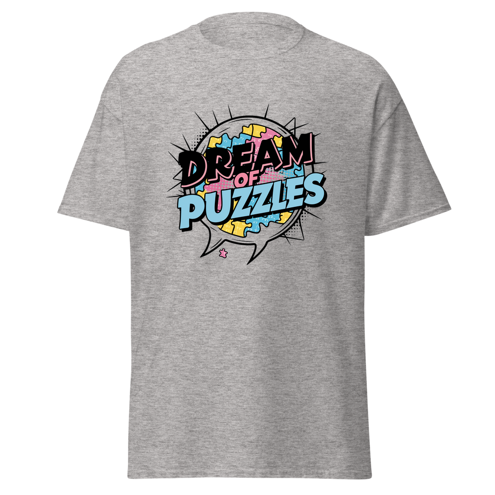 This nostalgic tee features a retro 80s dream bubble filled with playful puzzle pieces and styled in a vintage comic font. Perfect for puzzle enthusiasts and seniors who love a throwback vibe.This t-shirt is everything you’ve dreamed of and more. It feels soft and lightweight, with the right amount of stretch. It’s comfortable and flattering for all. 100% combed and ring-spun cotton (Heather colors contain polyester) Fabric weight: 4.2 oz./yd.² (142 g/m²) Pre-shrunk fabric Side-seamed construction Shoulder-to-shoulder taping