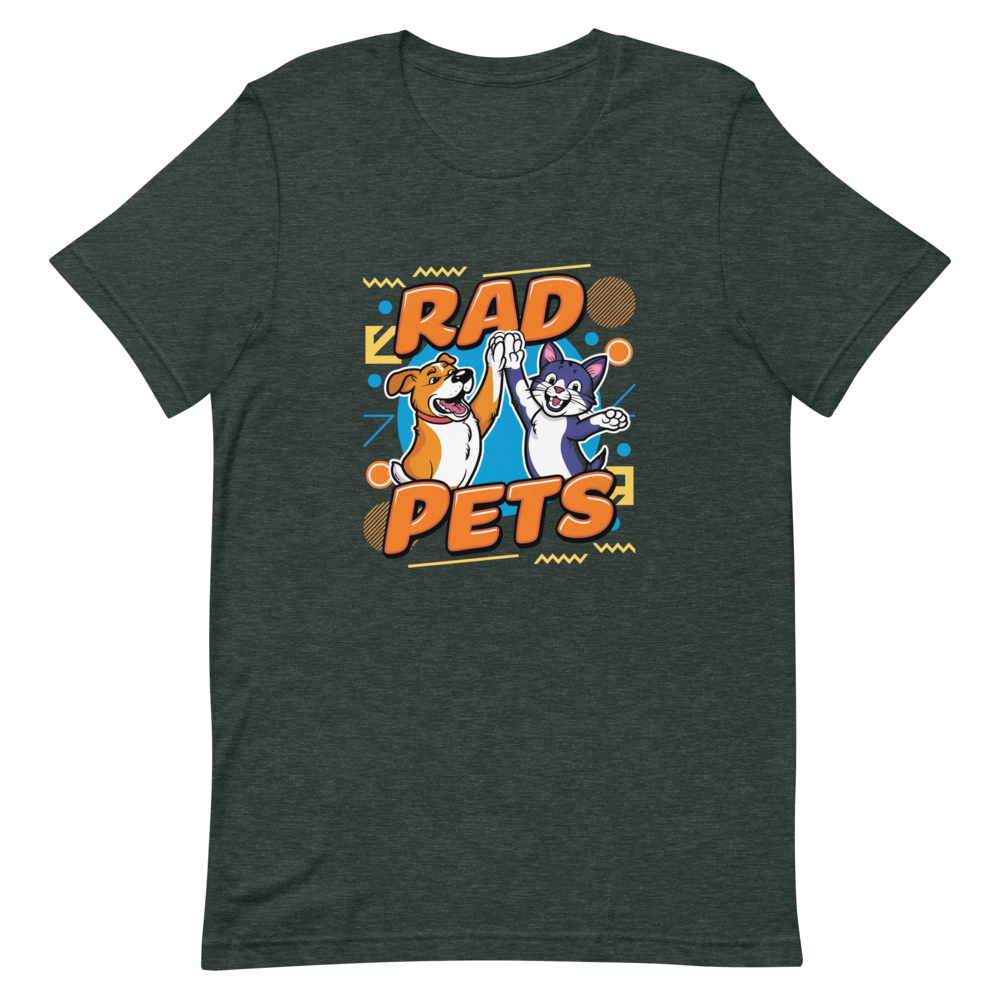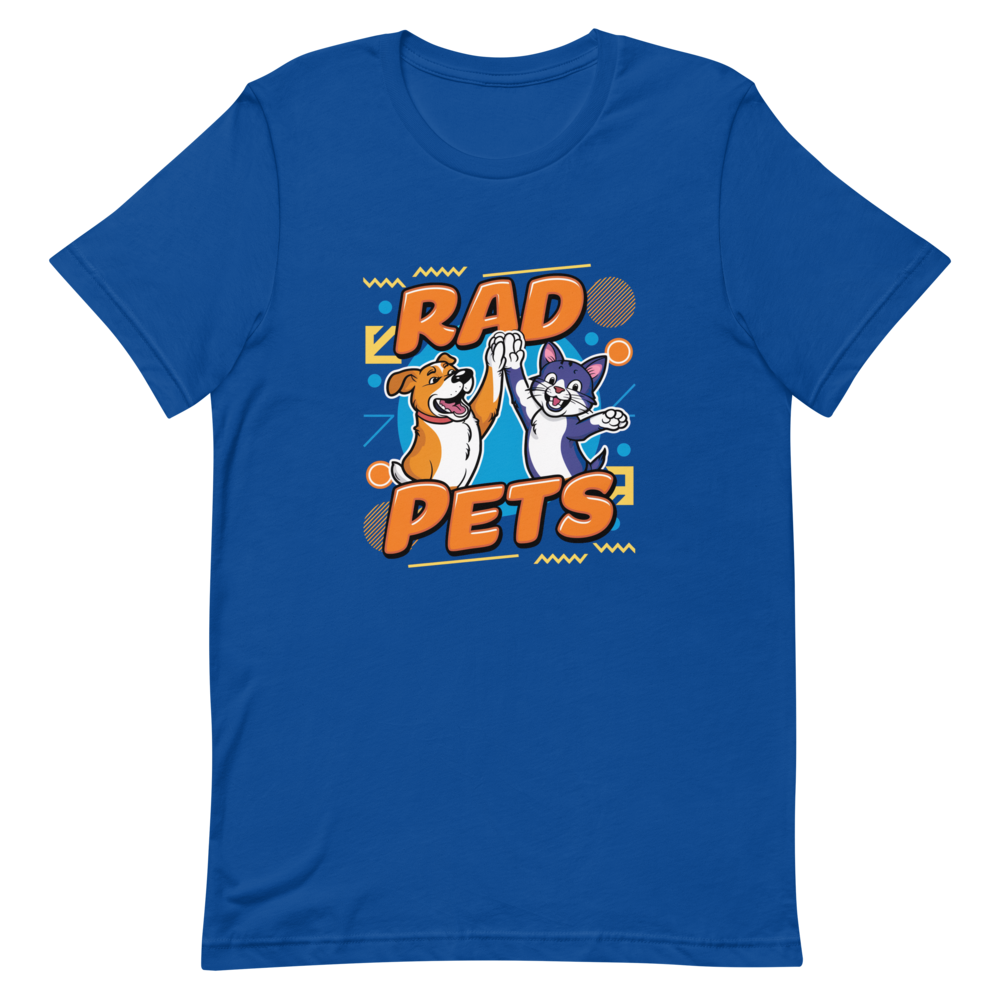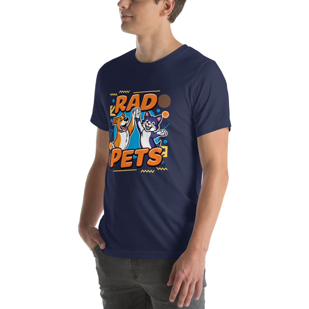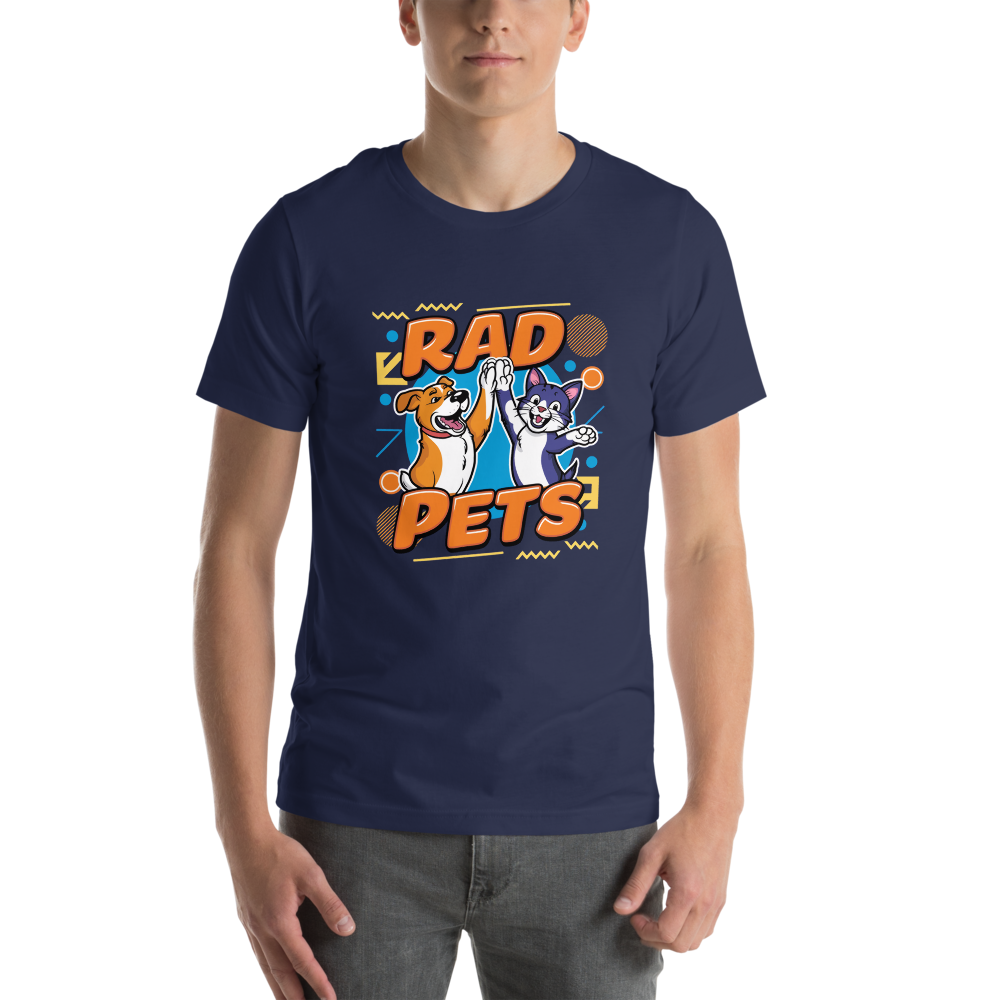 Get nostalgic with this playful tee featuring a cool dog and cat high-fiving amidst fun, retro 90s shapes like zigzags and circles. Perfect for pet lovers who enjoy a touch of vintage style!This t-shirt is everything you’ve dreamed of and more. It feels soft and lightweight, with the right amount of stretch. It’s comfortable and flattering for all. 100% combed and ring-spun cotton (Heather colors contain polyester) Fabric weight: 4.2 oz./yd.² (142 g/m²) Pre-shrunk fabric Side-seamed construction Shoulder-to-shoulder taping