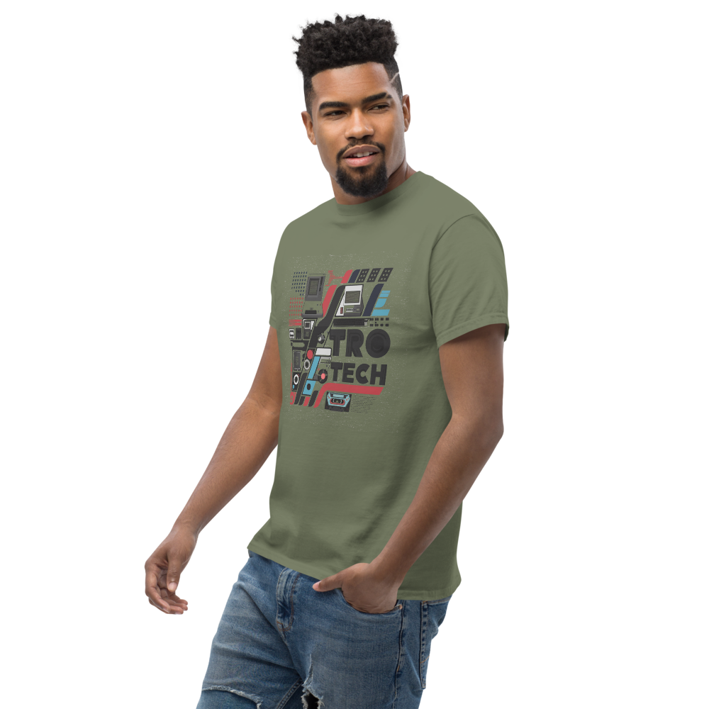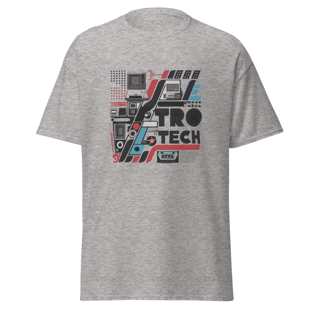 Take a trip down memory lane with this cool design featuring a mix of iconic vintage tech gadgets like an old computer, floppy disks, and a cassette player. Perfect for those who love 80s and 90s pop culture!This t-shirt is everything you’ve dreamed of and more. It feels soft and lightweight, with the right amount of stretch. It’s comfortable and flattering for all. 100% combed and ring-spun cotton (Heather colors contain polyester) Fabric weight: 4.2 oz./yd.² (142 g/m²) Pre-shrunk fabric Side-seamed construction Shoulder-to-shoulder taping
