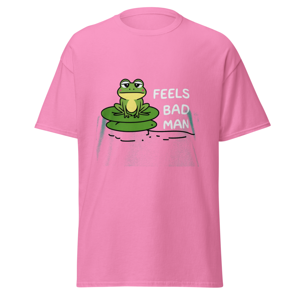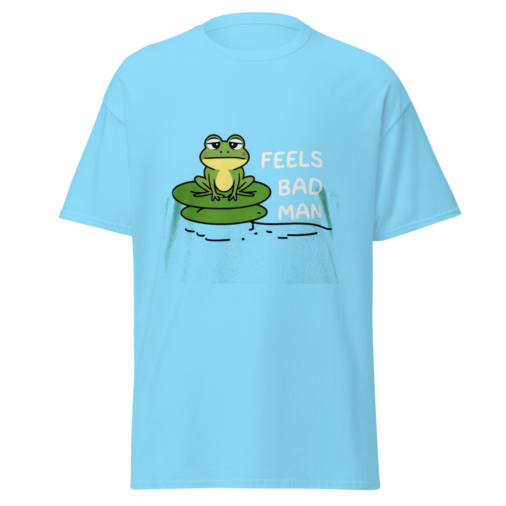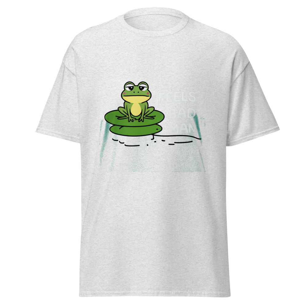 A cartoon frog sitting on a floating lily pad with a sad expression. Perfect for teens and emoji enthusiasts, this shirt captures those “feels bad” moments in a fun and relatable way.This t-shirt is everything you’ve dreamed of and more. It feels soft and lightweight, with the right amount of stretch. It’s comfortable and flattering for all. 100% combed and ring-spun cotton (Heather colors contain polyester) Fabric weight: 4.2 oz./yd.² (142 g/m²) Pre-shrunk fabric Side-seamed construction Shoulder-to-shoulder taping