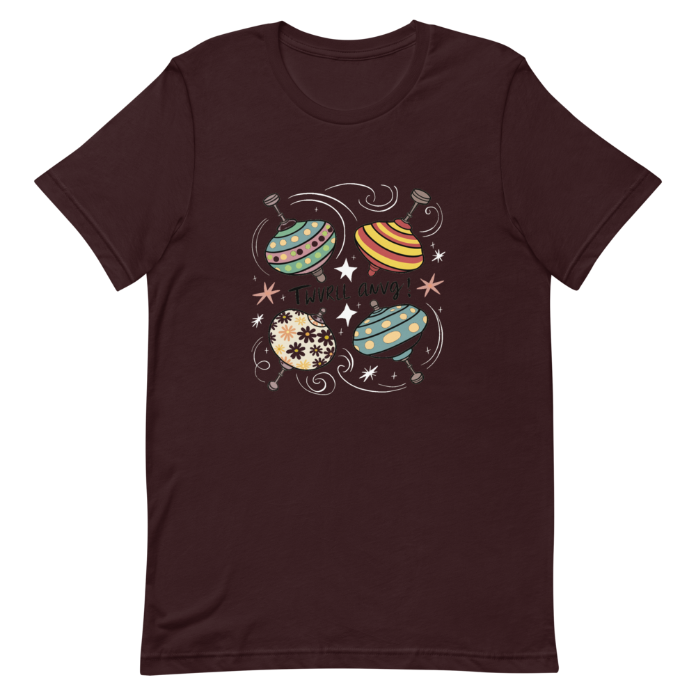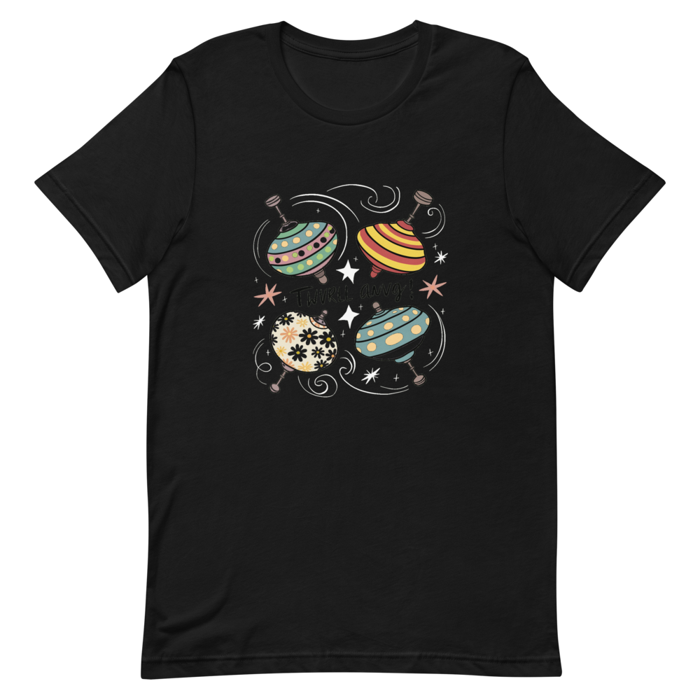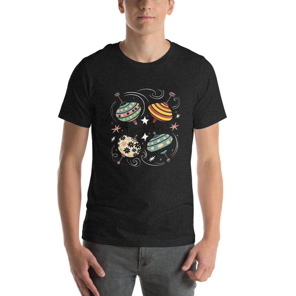 Three vintage spinning tops with playful patterns and colors, surrounded by swirling lines and stars. This fun and nostalgic design is perfect for kids and those who love old toys.This t-shirt is everything you’ve dreamed of and more. It feels soft and lightweight, with the right amount of stretch. It’s comfortable and flattering for all. 100% combed and ring-spun cotton (Heather colors contain polyester) Fabric weight: 4.2 oz./yd.² (142 g/m²) Pre-shrunk fabric Side-seamed construction Shoulder-to-shoulder taping