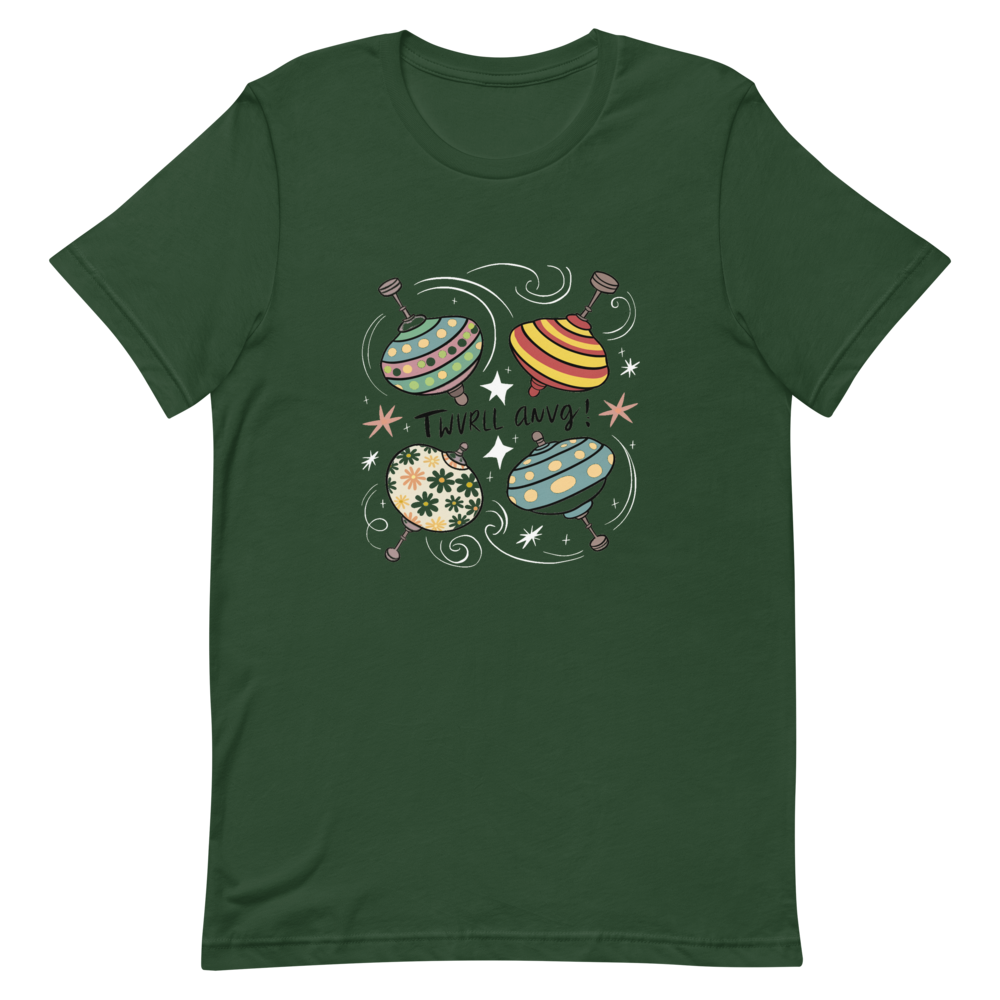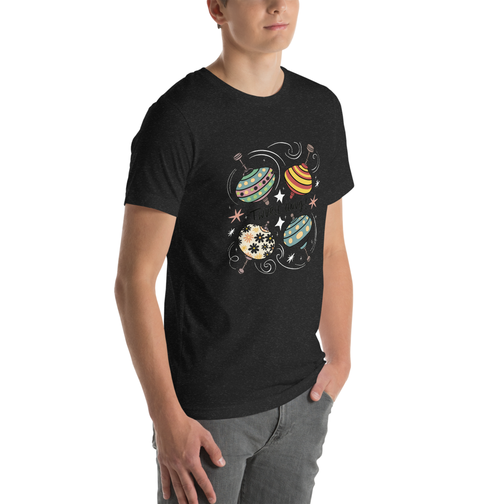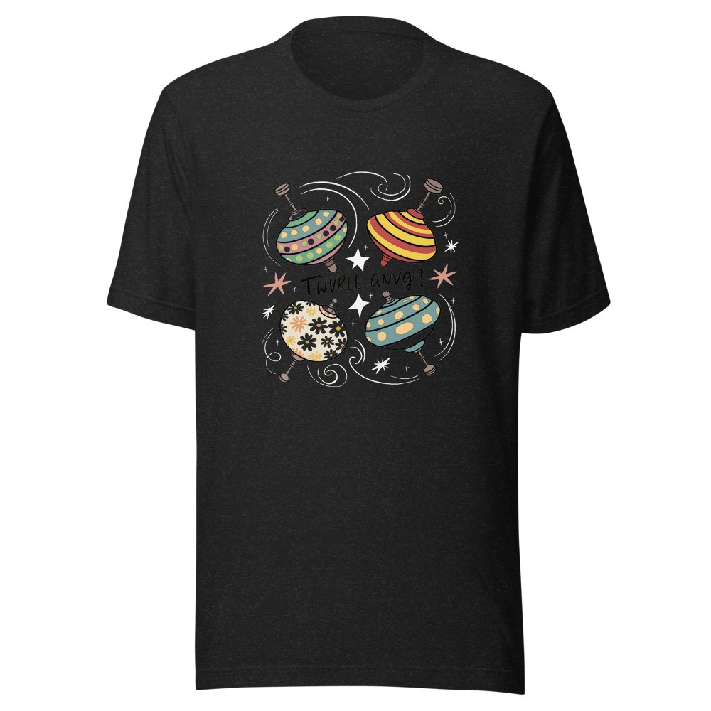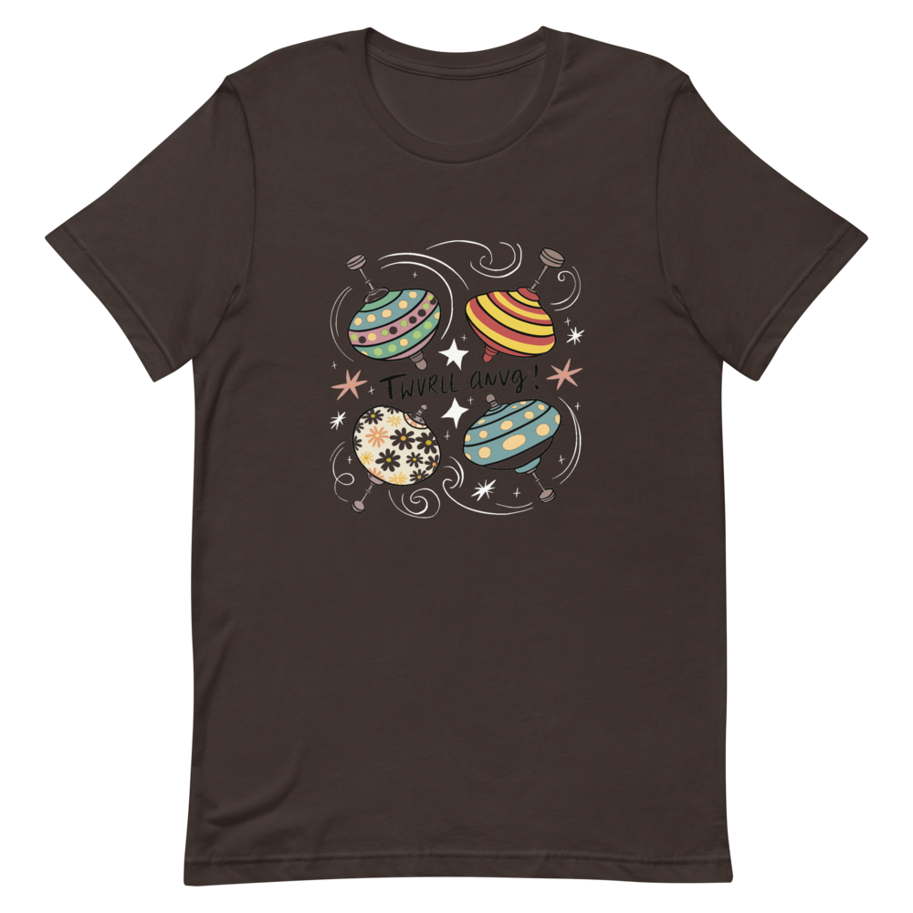 Three vintage spinning tops with playful patterns and colors, surrounded by swirling lines and stars. This fun and nostalgic design is perfect for kids and those who love old toys.This t-shirt is everything you’ve dreamed of and more. It feels soft and lightweight, with the right amount of stretch. It’s comfortable and flattering for all. 100% combed and ring-spun cotton (Heather colors contain polyester) Fabric weight: 4.2 oz./yd.² (142 g/m²) Pre-shrunk fabric Side-seamed construction Shoulder-to-shoulder taping