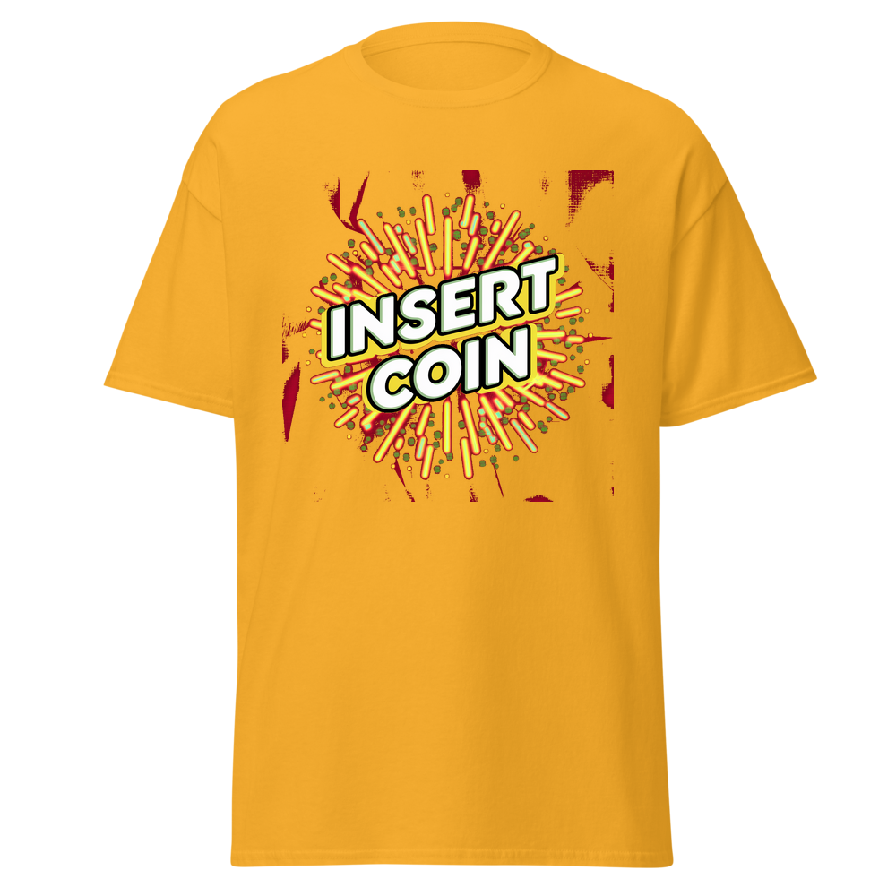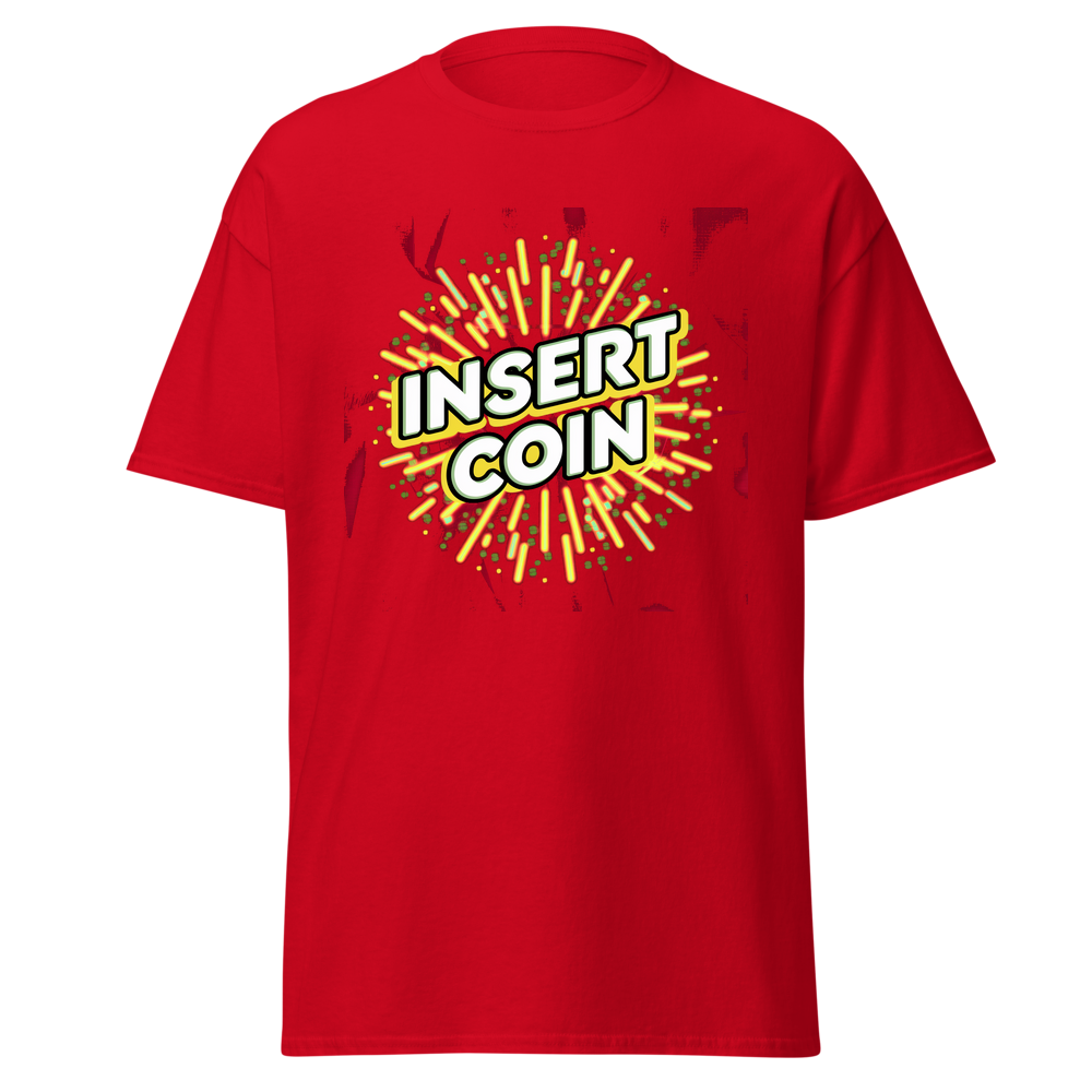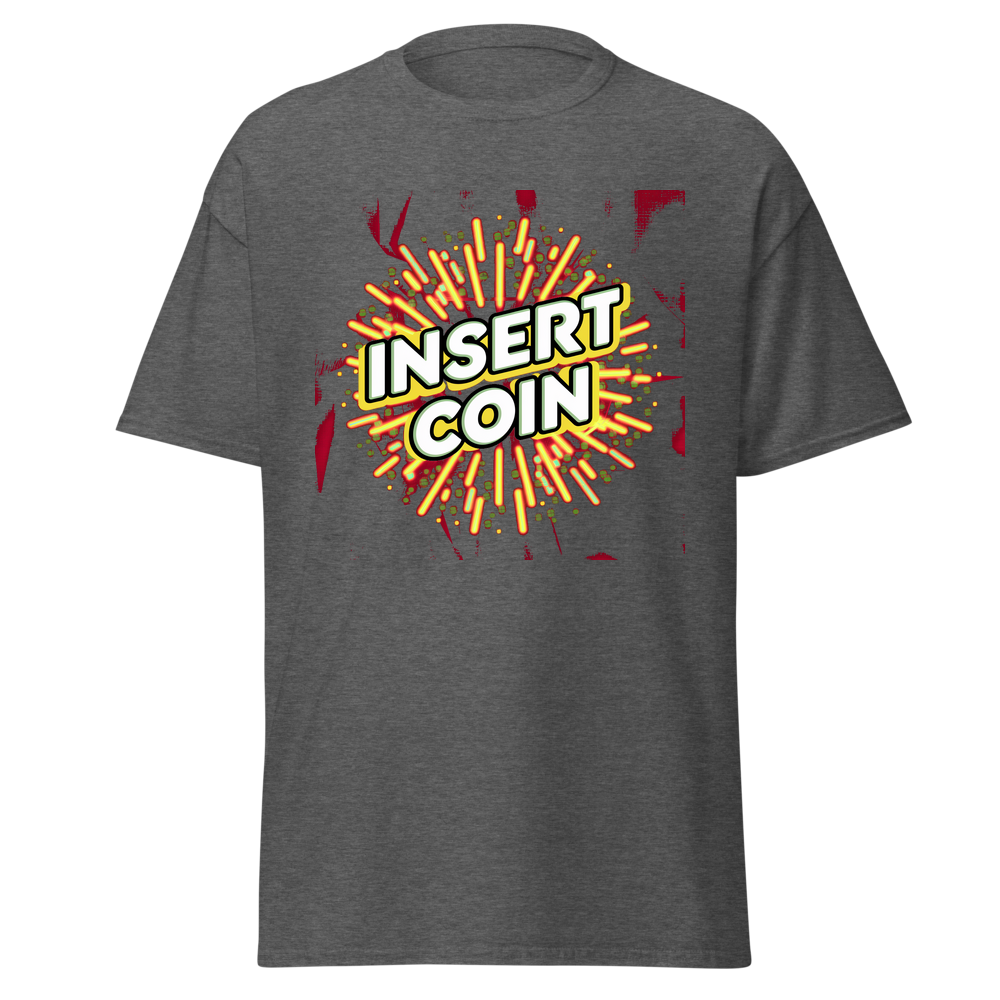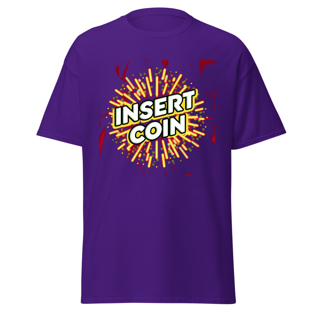This t-shirt features a cool retro “Insert Coin” design, complete with arcade-style borders and fun abstract patterns. Perfect for kids and fans of classic gaming!This t-shirt is everything you’ve dreamed of and more. It feels soft and lightweight, with the right amount of stretch. It’s comfortable and flattering for all. 100% combed and ring-spun cotton (Heather colors contain polyester) Fabric weight: 4.2 oz./yd.² (142 g/m²) Pre-shrunk fabric Side-seamed construction Shoulder-to-shoulder taping